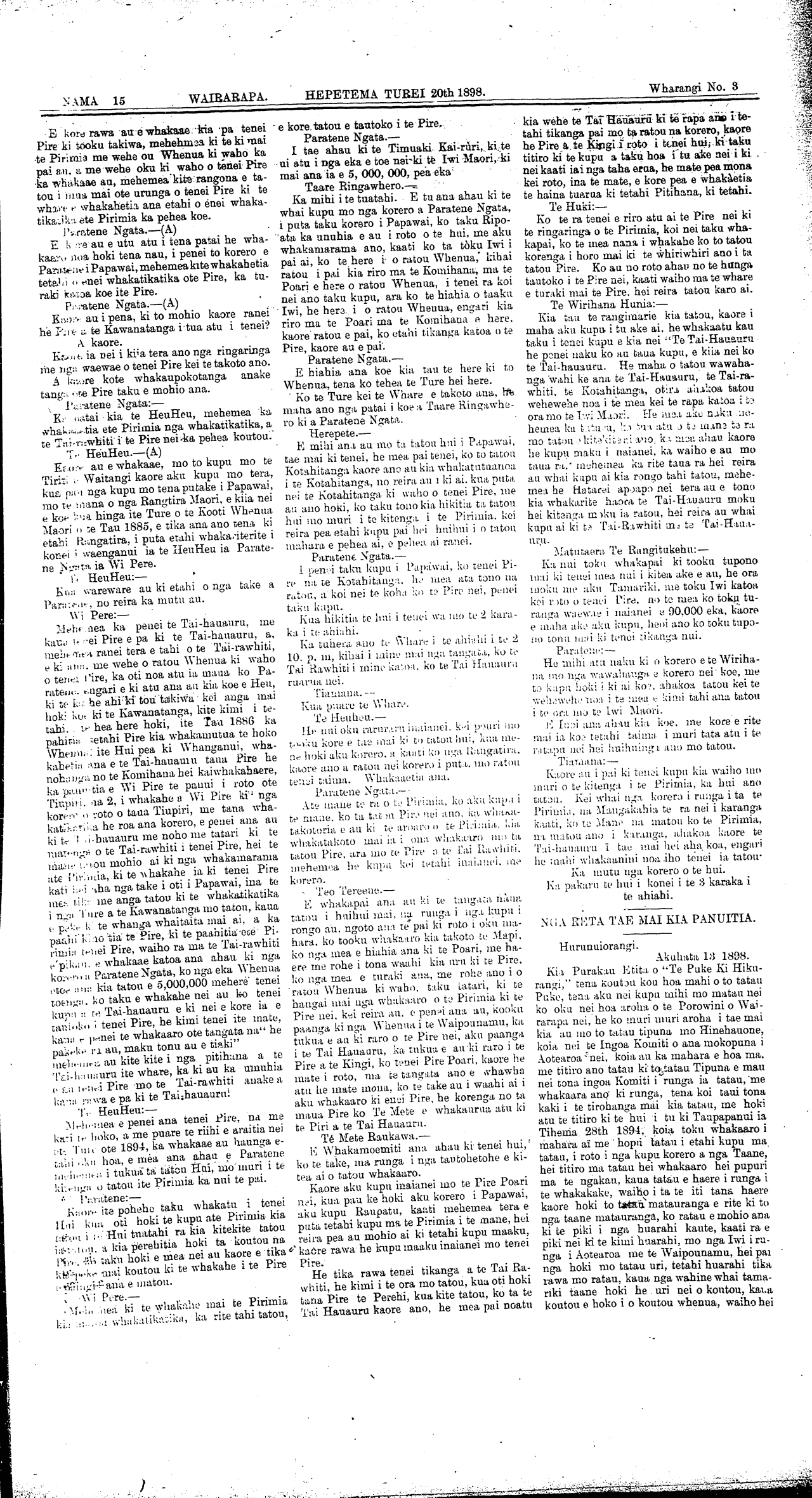 NAMA 15 WAIRARAPA. HEPETEMA TUREI 20th 1898. Wharangi No. 3 Paratene Ngata Te HeuHeu Tiriti o Waitangi Tai-rawhiti Whanganui Wi Pire Papawai Tai-hauauru Taare Ringawhero Te Mete Raukawa Te Huki Te Wirihana Hunia Matutaera Te Rangitukehu NGA RETA TAE MAI KIA PANUITIA Hurunuiorangi Taupapanui Aotearoa te Waipounamu