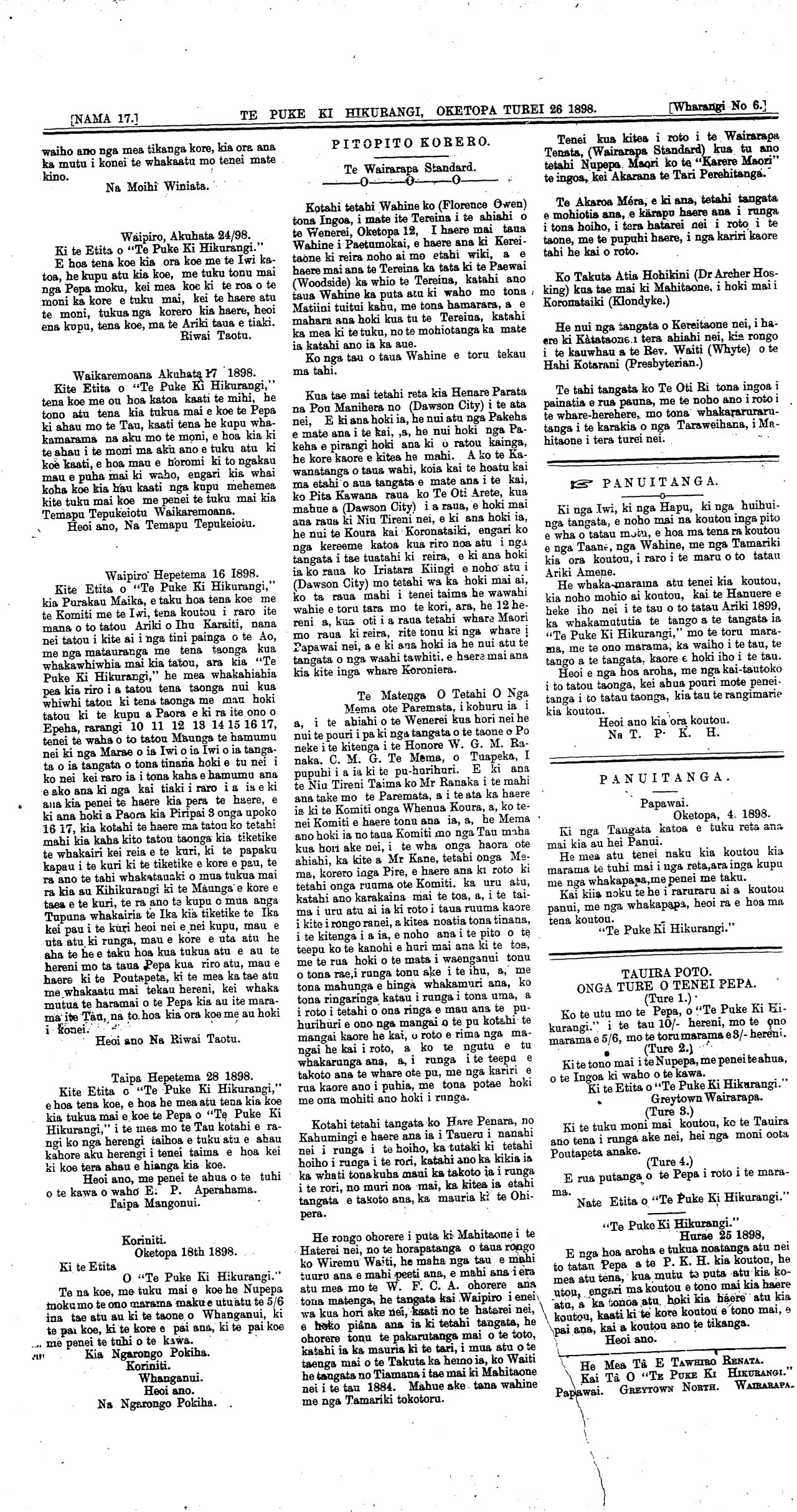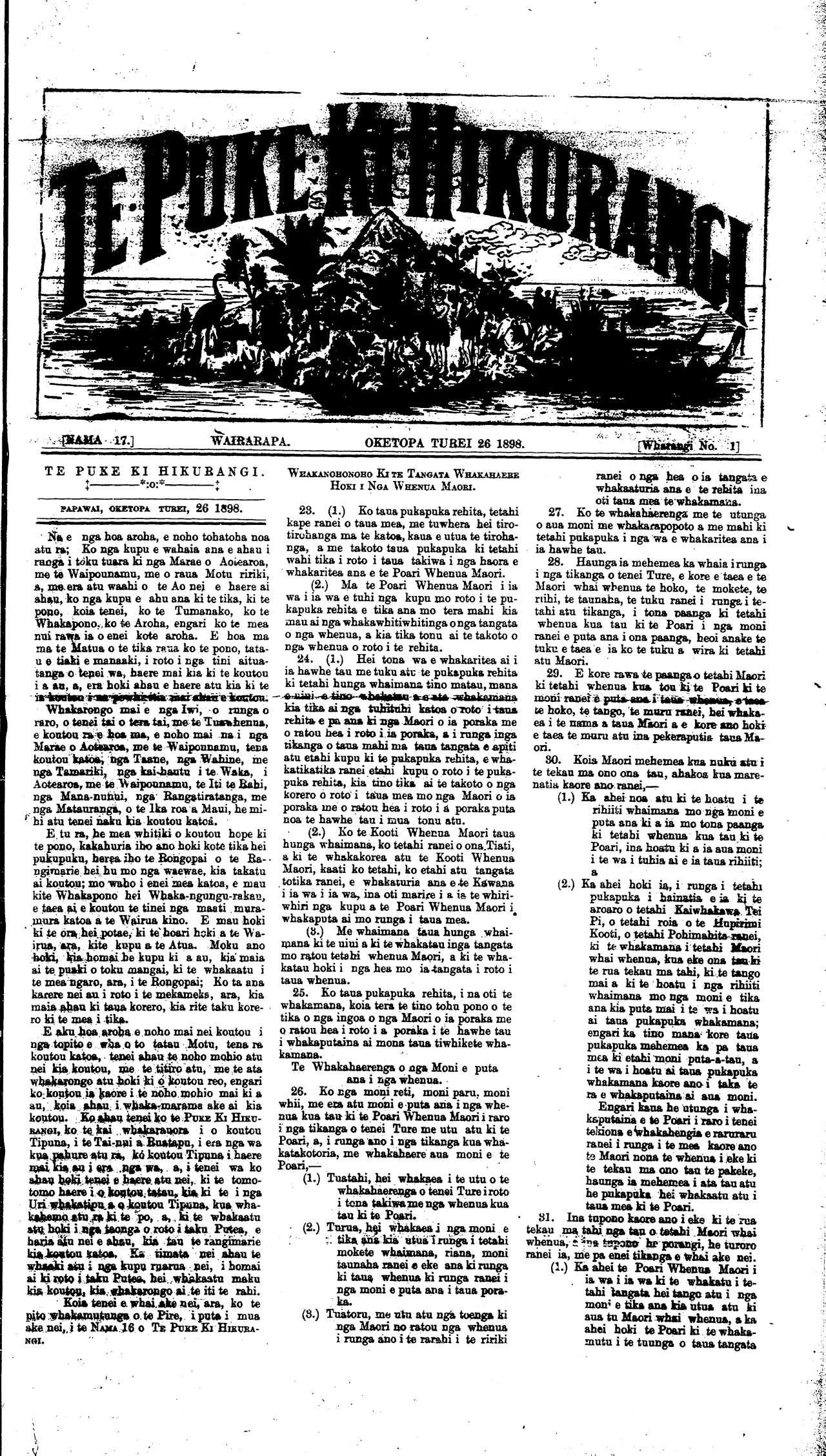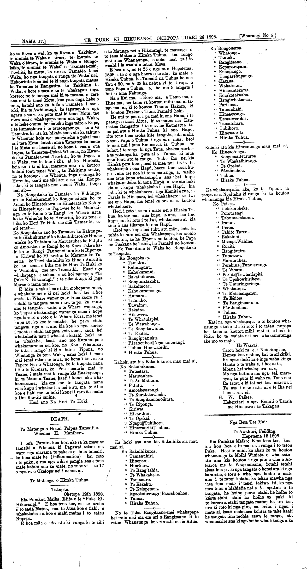 [NAMA 17.]\_\_\_\_\_\_\_\_\_\_TE PUKE KI HIKURANGI, OKETOPA TUREI 26 1898. \_\_\_\_\_\_[Wharangi No 2.]