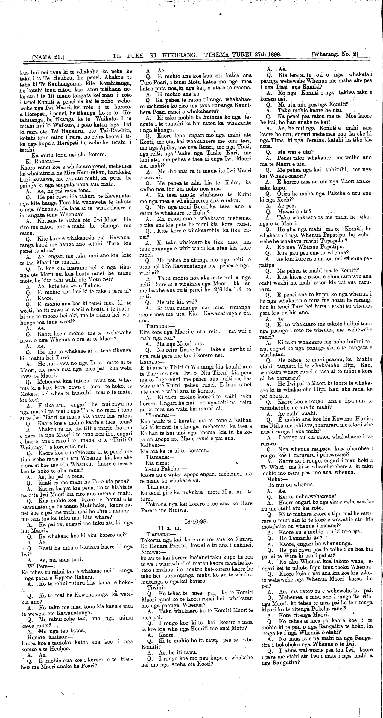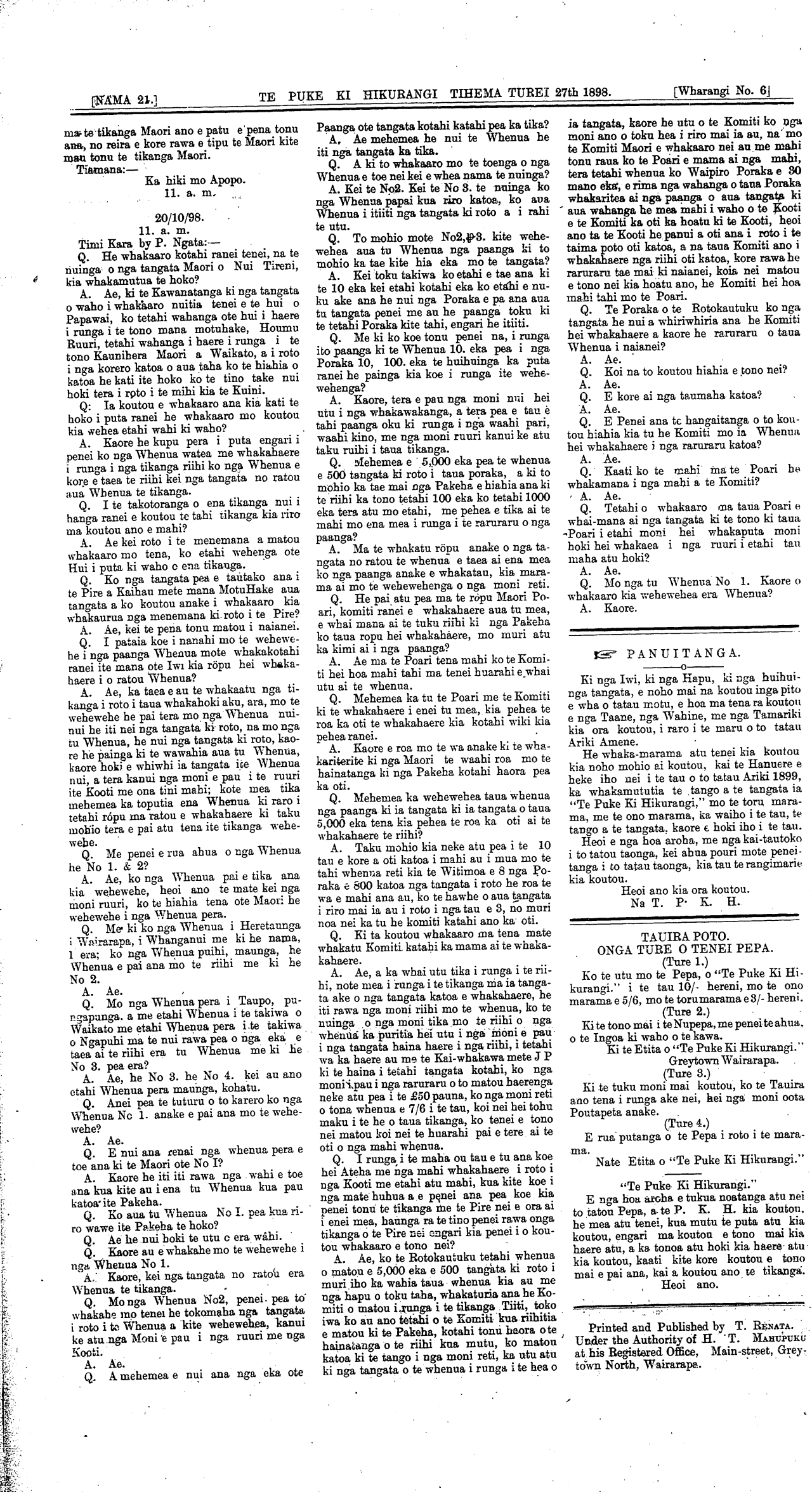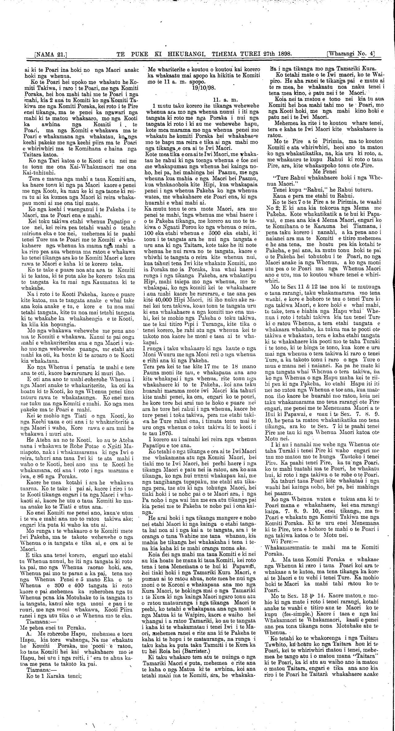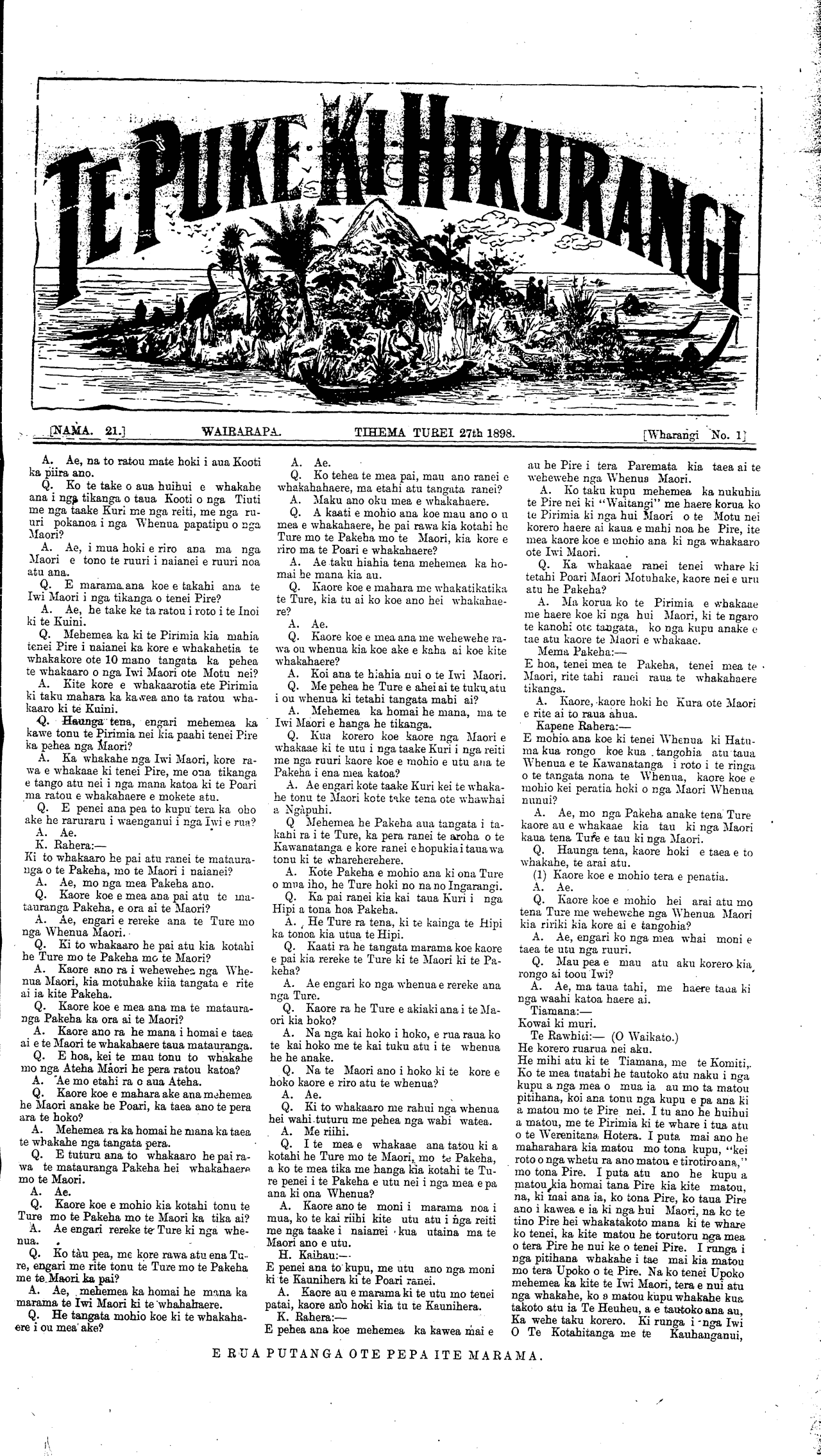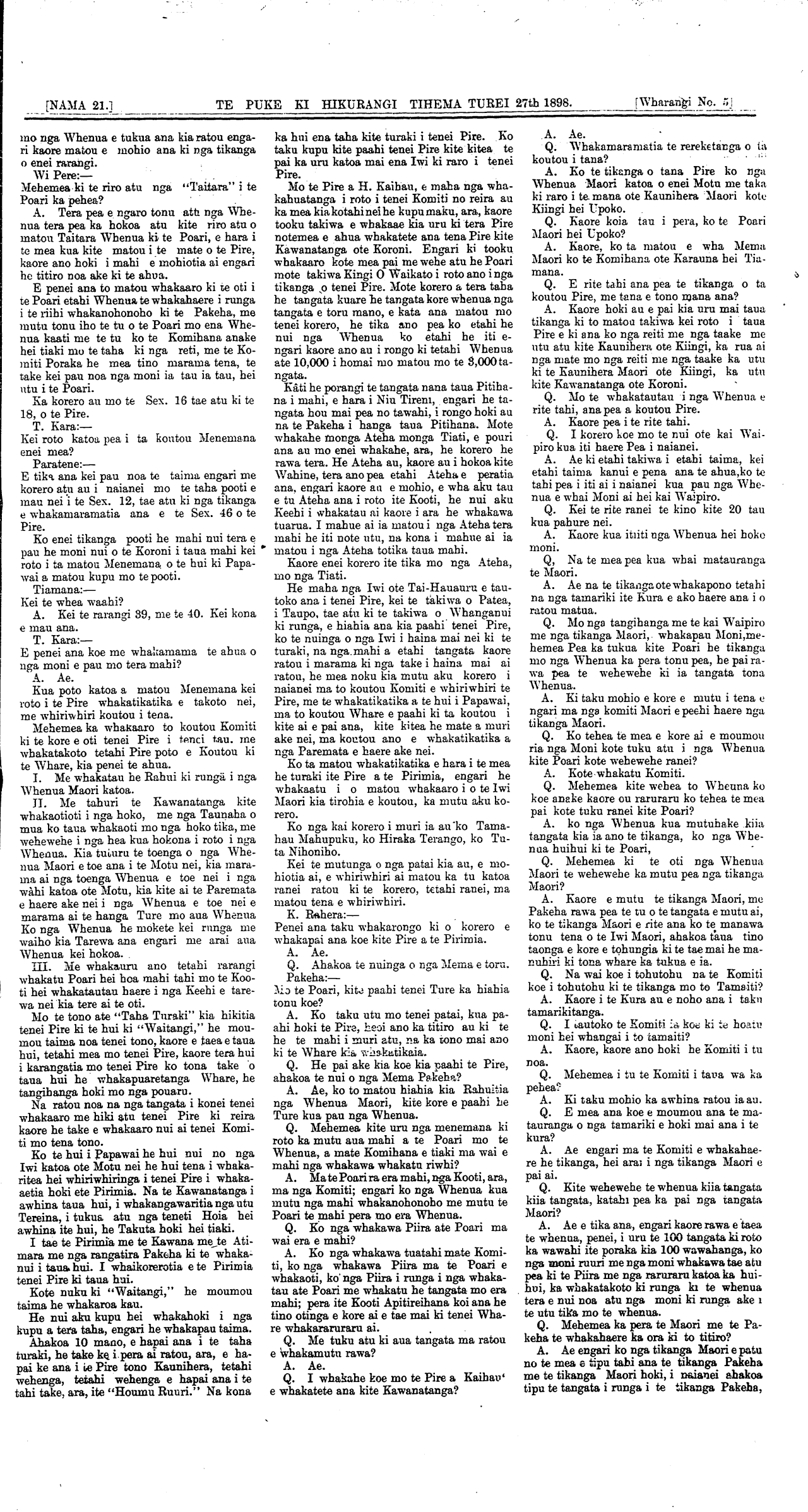 [NAMA. 21.] WAIRARAPA. TIHEMA TUREI 27th 1898.\_\_\_\_\_\_\_\_\_\_\_\_\_\_[Wharangi No. I]