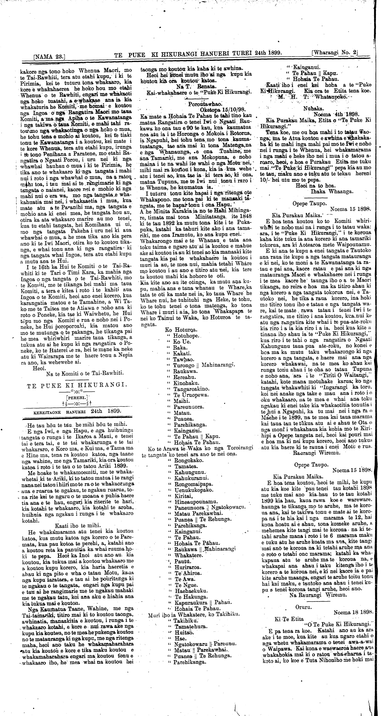 [NAMA 23]\_\_\_\_\_TE PUKE KI HIKURANGI HANUERI TUREI 24th 1899.\_\_\_\_\_\_[Wharangi No. 6 HE PANUITANGA. "TE PUKE KI HIKURANGI." KEREITAONE HANUERI 24 1899. E nga whanaunga e noho mai ra" koutou i nga pito e wha, me waenganui o tatau Motu, e noho nei tatau te [wi Maori, tena ra koutou, nga Taane, nga Wahine, nga Tamariki, nga Kaumatua, me nga Kuia, i roto i te tau hou o to tatau Ariki o Ihu Karaiti, kua mutu te tau tawhito, me ona ora, me ona male, kua timata tenei te tau hou, me ona ora, me ona mate, ko wai ka hua, ko wai ka tohu, engari kote whawhai o te ngakau kia taea atu ano e tatau tera tau hou e tu mai nei, heoi ma te Atua tatau e tiaki, kia kite ai tatau i nga mahi pai atawhai, a to tatau Ariki heoi te mihi. He Panuitanga tena kia mohio mai koutou mo te korero i panuitia e "Te Puke Ki Hikurangi," i te nama 8 wharangi 6 e ki ana taua kupu o tetahi waahi o te rarangi tua rima, me tiaki tonu o koutou Pepa, tae noa ki te tau, ka whakahoki mai ai kia whaka-paiperatia, ka whakahoki atu ai, engari mau ano e utu te Pane Kuini mo te tukunga mai, me te whakahokinga atu, kahore he utu mo te mahinga,'otira me titiro ano e koutou te tino rarangi, kia marama ai koutou, otira ko taua rarangi 5 i te wharangi tua 6 kua wha-kakorea e te Komiti o te Pepa, i rung i te timatanga mai o tenei Pepa ko te Kotahitanga te rangatira na ana nga whakahaere o te Pepa, he roa te takiwa o nga kai mahi o tenei Perehi e whanga haere ana ki nga tikanga heoi kihai i tae mai, na, e hoa ma, kua tino tuturu te hoki mai o tenei Pepa ki roto ki te ringa o Tamahau Mahupuku, me ona kai-whakahaere i raro i tona mana, na konei e hoa ma kahore e taea te whakarite taua kupu, na konei ka whakakorea taua whakapaiperatanga. Heoi ano na to koutou hoa. Purakau Maika Etita.