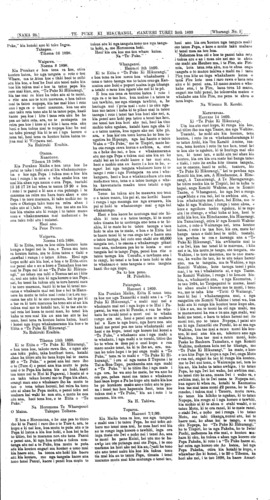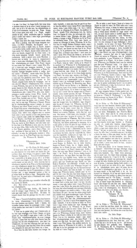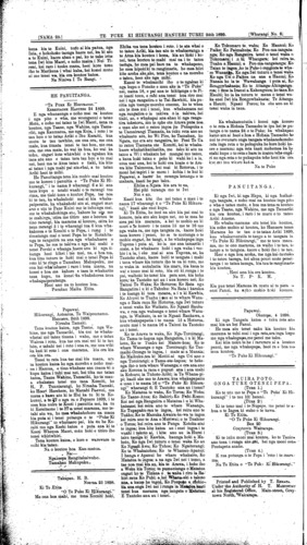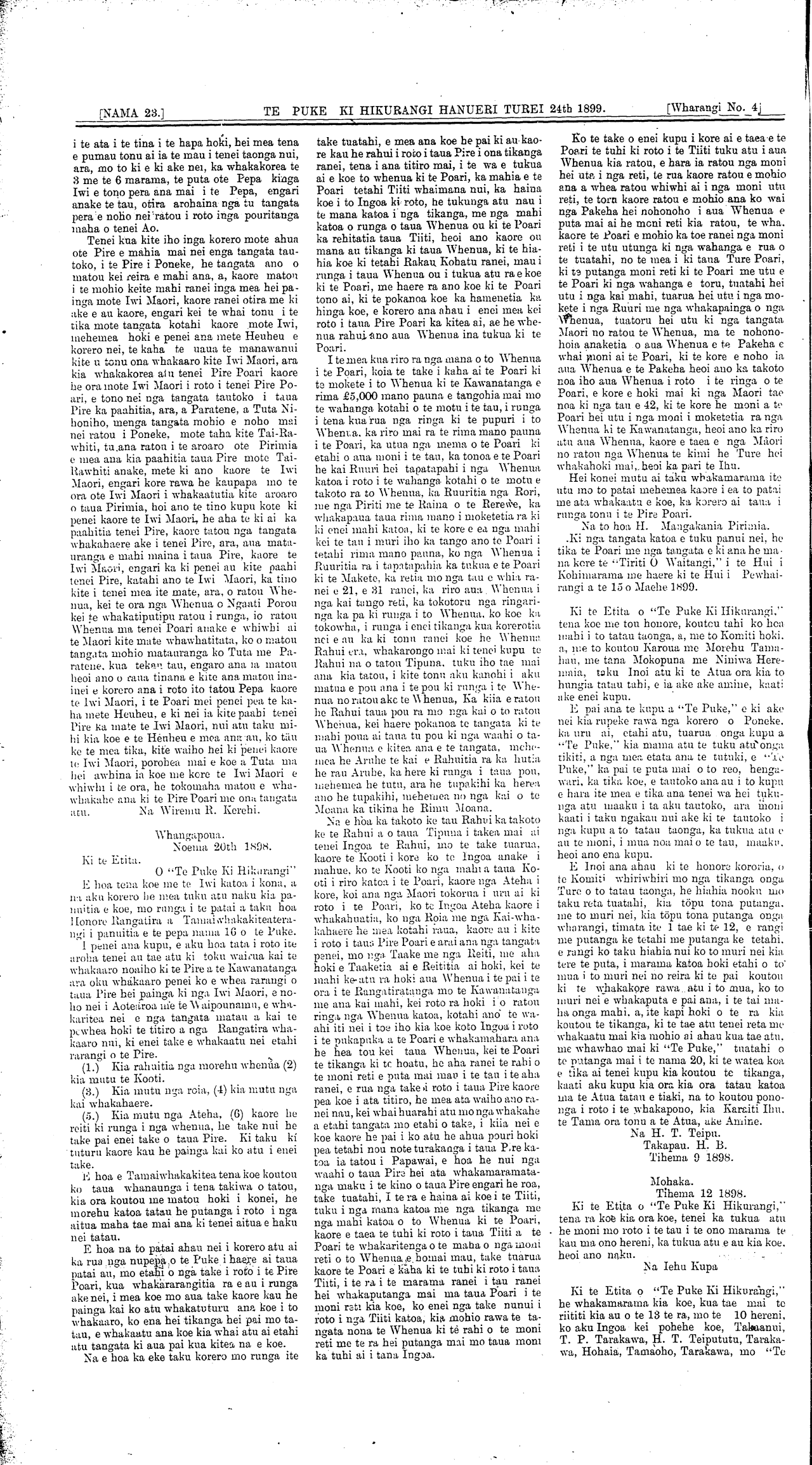 [NAMA 23.]\_\_\_\_\_\_\_\_\_\_\_TE PUKE KI HIKURANGI HANUERI TUREI 24th 1899.\_\_\_\_\_\_\_[Wharangi No. 4 Ki te Etita. O "Te Puke Ki Hikurangi" E hoa tena koe me te Iwi katoa i kona, a na aku korero he mea tuku atu naku kia panuitia e koe, mo ranga i te patai a taku hoa Honore Rangatira a Tamaiwhakakiteatera-n^i i panuitia e te pepa nama 1G o te Puke. 1 penei ana kupu, e aku hoa tata i roto ite aroha tenei au tae atu ki toku wairua kai te whakaaro noaiho ki te Pire a te Kawanatanga ara oku whakaaro penei ko e whea rarangi o taua Pire hei painga ki nga Iwi Maori, e noho nei i Aotearoa me te Waipounamu, e whakaritea nei e nga tangata matau a kai te pewhea hoki te titiro a nga Rangatira whakaaro nui, ki enei take e whakaatu nei etahi rarangi o te Pire. (1.) Kia rahuitia nga morehu whenua (2) kia mutu te Kooti. (8.) Kia mutu nga roia, (4) kia mutu nga kai whakahaere. (5.) Kia mutu nga Ateha, (6) kaore he reiti ki runga i nga whenua, be take nui he take pai enei take o taua Pire. Ki taku ki tuturu kaore kau he painga kai ko atu i enei take. E hoa e Tamaiwhakakitea tena koe koutou ko taua whanaunga i tena takiwa o tatou, kia ora koutou me matou hoki i konei, he morehu katoa tatau he putanga i roto i nga aitua maha tae mai ana ki tenei aitua e haku nei tatau. E hoa na to patai ahau nei i korero atu ai ka rua nga nupepa o te Puke i haere ai taua patai au, mo etahi o nga take i roto i te Pire Poari, kua whakararangitia ra e au i runga ake nei, i mea koe mo aua take kaore kau he painga kai ko atu whakatuturu ana koe i to whakaaro, ko ena hei tikanga hei pai mo tatau, e whakaatu ana koe kia whai atu ai etahi atu tangata ki aua pai kua kitea na e koe. Na e hoa ka eke taku korero mo runga ite