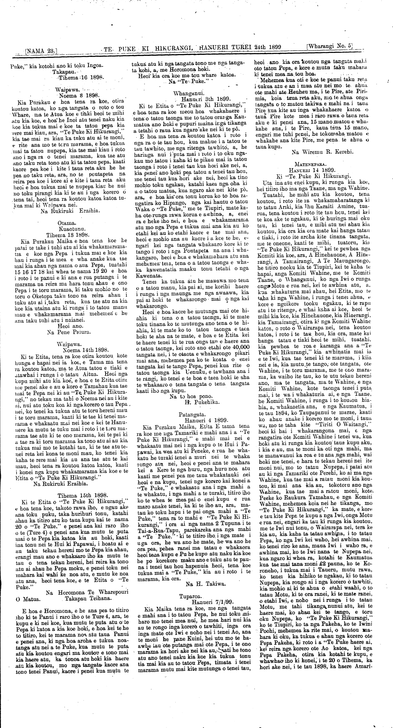 [NAMA 23.].\_ \_\_ \_ TE PUKE KI HIKURANGI, HANUERI TUREI 24th 1899\_\_\_\_\_[Wharangi No. 5] \_ Waipawa. Noema 3 1898. Kia Purakau e hoa tena ra koe, otira koutou katoa, ko nga tangata o roto o tou Whare, ma te Atua koe e tiaki heoi te inihi atu kia koe, e hoa he Inoi atu tenei naku kia koe kia tukua mai e koe ta tatou pepa kia rere mai kiau, ara, "Te Puke Ki Hikurangi," kia tae mai ra kiau ka tuku atu ai te moni, e rite ana mo te toru marama, e hoa tukua mai ta tatou nupepa, kia tae mai kiau i roto ano i nga ra o tenei marama, kua tae atu ano taku reta tono atu ki ta tatou pepa, kaati kaore pea koe i kite i taua reta aku he he pea no taku reta, ara, no te poutapeta na reira pea koe i kore ai e kite i taua reta aku heoi e hoa tukua mai te nupepa kiau he nui no toku pirangi kia ki te au i nga korero o tena tai, heoi tena ra koutou katoa katoa tukua mai ki Waipawa nei. Na Rukiruki Eraihia. Otama-Kuaotunu. Tihema 18 1898. Kia Purakau Maika e boa tena koe he patai te take i tuhi atu ai kia whakamarama-tia e koe nga Pepa i tukua mai e koe kia hau i runga i te mea e wha anake kua tae mai kia ahau nga nama o aua Pepa, tuatahi 15 16 17 18 kei whea te nama 19 20 e hoa i roto i te panui e ki ana e rua putanga i te marama na reira ma hara tonu ahau e ono Pepa i te toru marama, ki taku mohio no te toru o Oketopa taku tono na reira ahau i tuku atu ai i taku reta, kua tae atu na kia koe kia utaina atu ki runga i to tatou manu mau e whakamarama mai mehemea e he ana taku tuhi atu i naianei. Heoi ano. Na Pene Paiura.