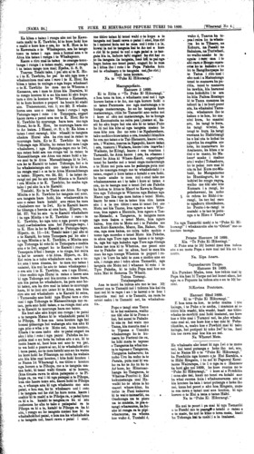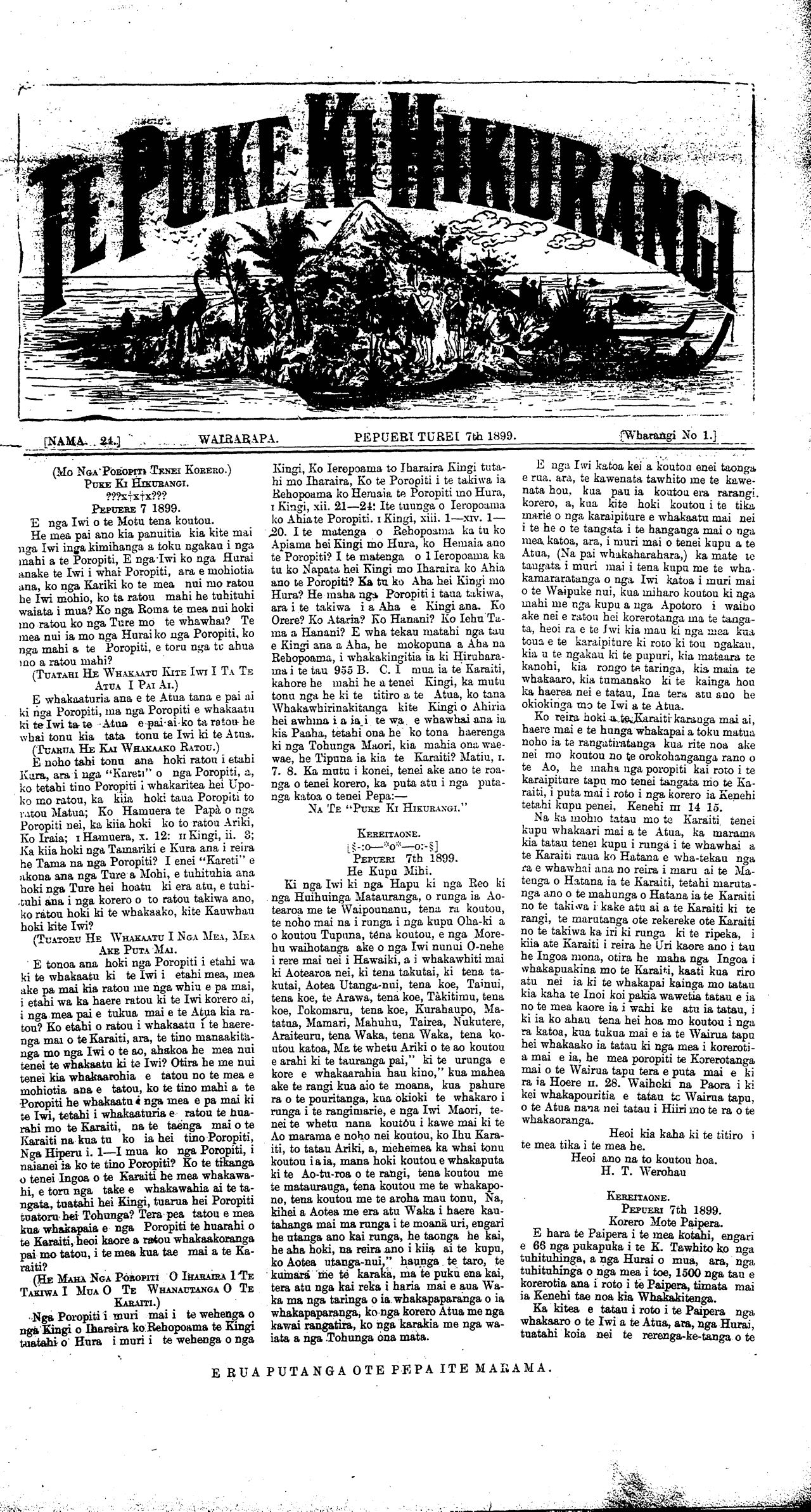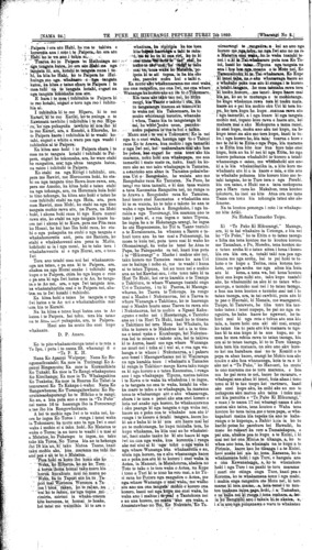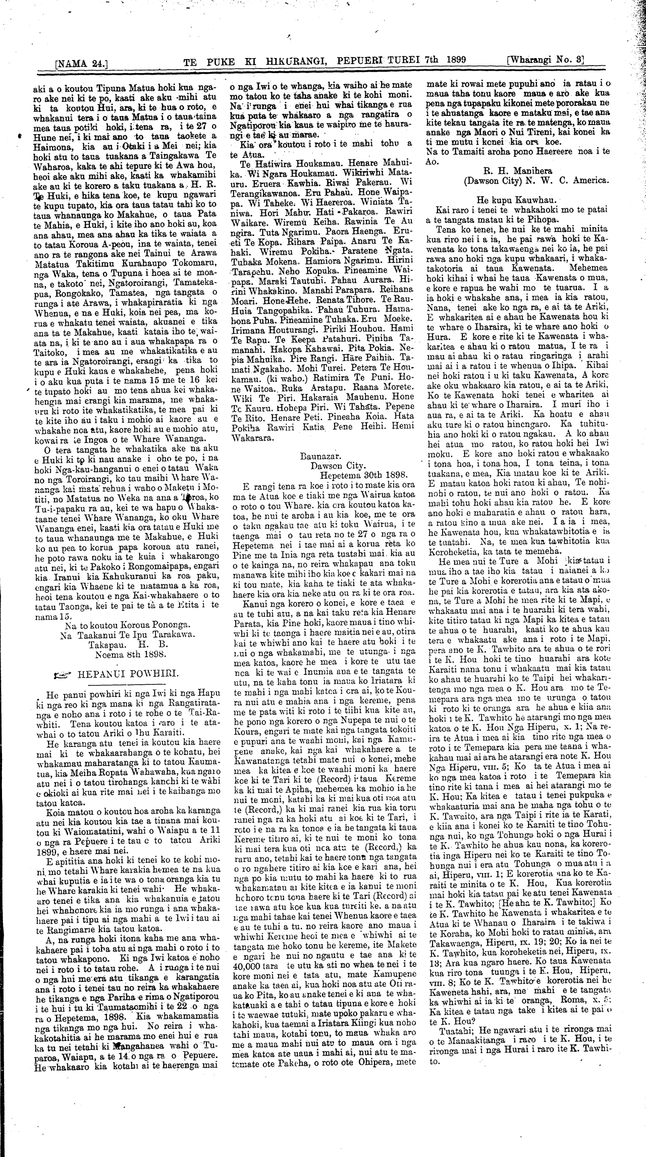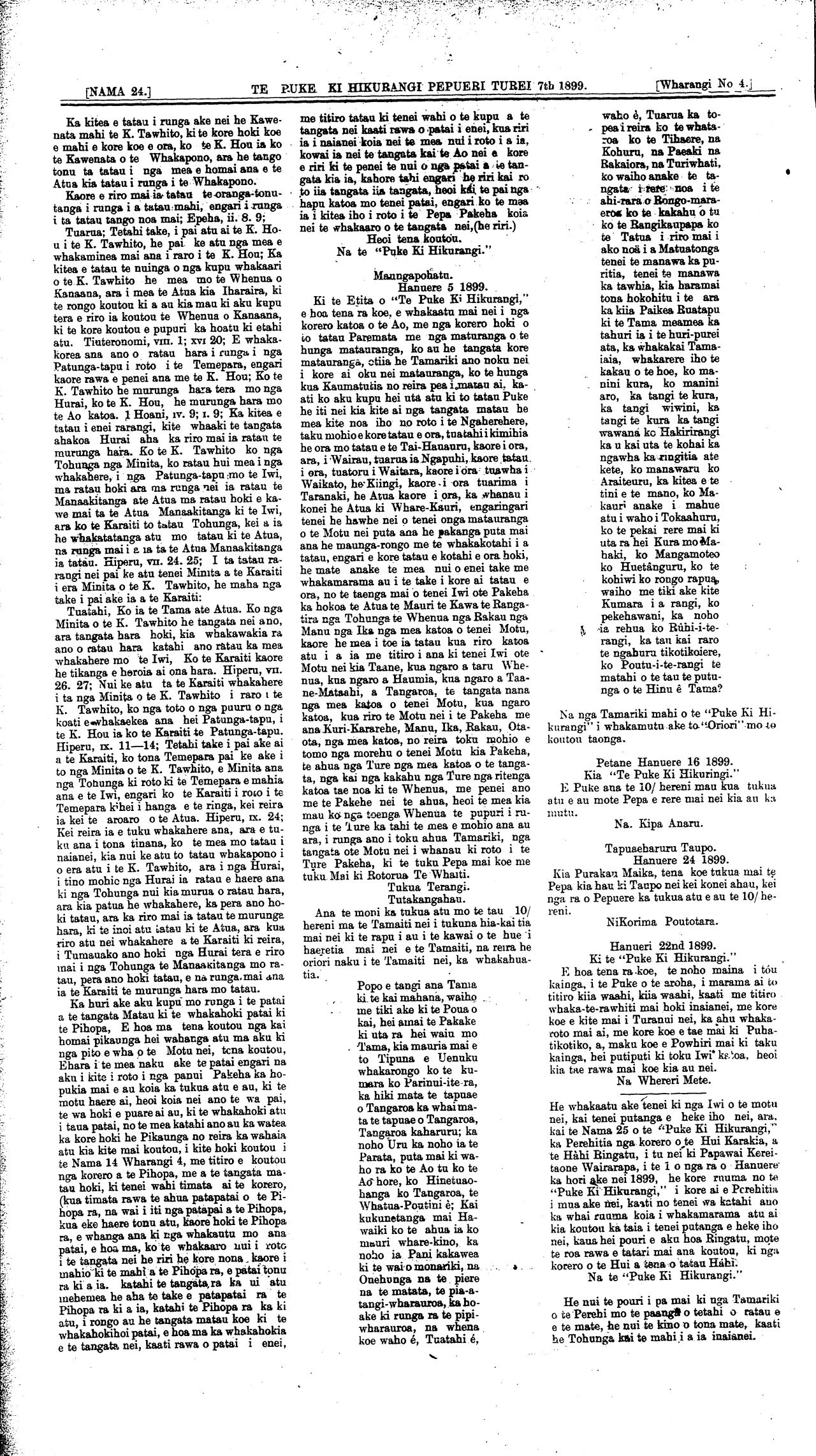 [NAMA 24.]\_\_\_\_\_\_\_\_\_\_TE PUKE KI HIKURANGI, PEPUERI TUREI 7th 1899\_\_\_\_\_[Wharangi No. 8] He panui powhiri ki nga Iwi ki nga Hapu ki nga reo ki nga mana ki nga Rangatiratanga e noho ana i roto i te rohe o te Tai-Ra-whiti. Tena koutou katoa i raro i te atawhai o to tatou Ariki o Ihu Karaiti. He karanga atu tenei ia koutou kia haere mai ki te whakaarahanga o te kohatu, hei whakamau maharatanga ki to tatou Kaumatua, kia Meiha Ropata Wahawaha, kua ngaio atu nei i o tatou tirohanga kanohi ki te wahi e okioki ai kua rite mai nei i te kaihanga mo tatou katea. Koia matou o koutou hoa aroha ka karanga atu nei kia koutou kia tae a tinana mai koutou ki Waiomatatini, wahi o Waiapu a te 11 o nga ra Pepuere i te tau o to tatou Ariki 1899, e haere mai nei. E apititia ana hoki ki tenei ko te kohi moni, mo tetahi Whare karakia hemea te na kua whai kuputia e ia i te wa o tona oranga kia tu he Whare karakia ki tenei wahi. He whakaaro tenei e tika ana kia whakanuia e tatou hei whahonore kia ia mo runga i ana whakahaere pai i tipu ai nga mahi a te Iwi i tau ai te Rangimarie kia tatou katoa. A, na runga hoki itona kaha me ana whakahaere pai i toha atu ai nga mahi o roto i to tatou whakapono. Ki nga Iwi katoa e noho nei i roto i to tatau rohe. A i runga i te nui o nga hui me era atu tikanga e karangatia ana i roto i tenei tau no reira ka whakahaere he tikanga e nga Pariha e rima o Ngatiporou i te hui i tu ki Taumataomihi te 22 o nga ra o Hepetema, 1898. Kia whakamamatia nga tikanga mo nga hui. No reira i whakakotahitia ai he marama mo enei hui e rua ka tu nei tetahi ki Mangahanea wahi o Tuparoa, Waiapu, a te 14 o nga ra o Pepuere. He whakaaro kia kotahi ai te haerenga mai