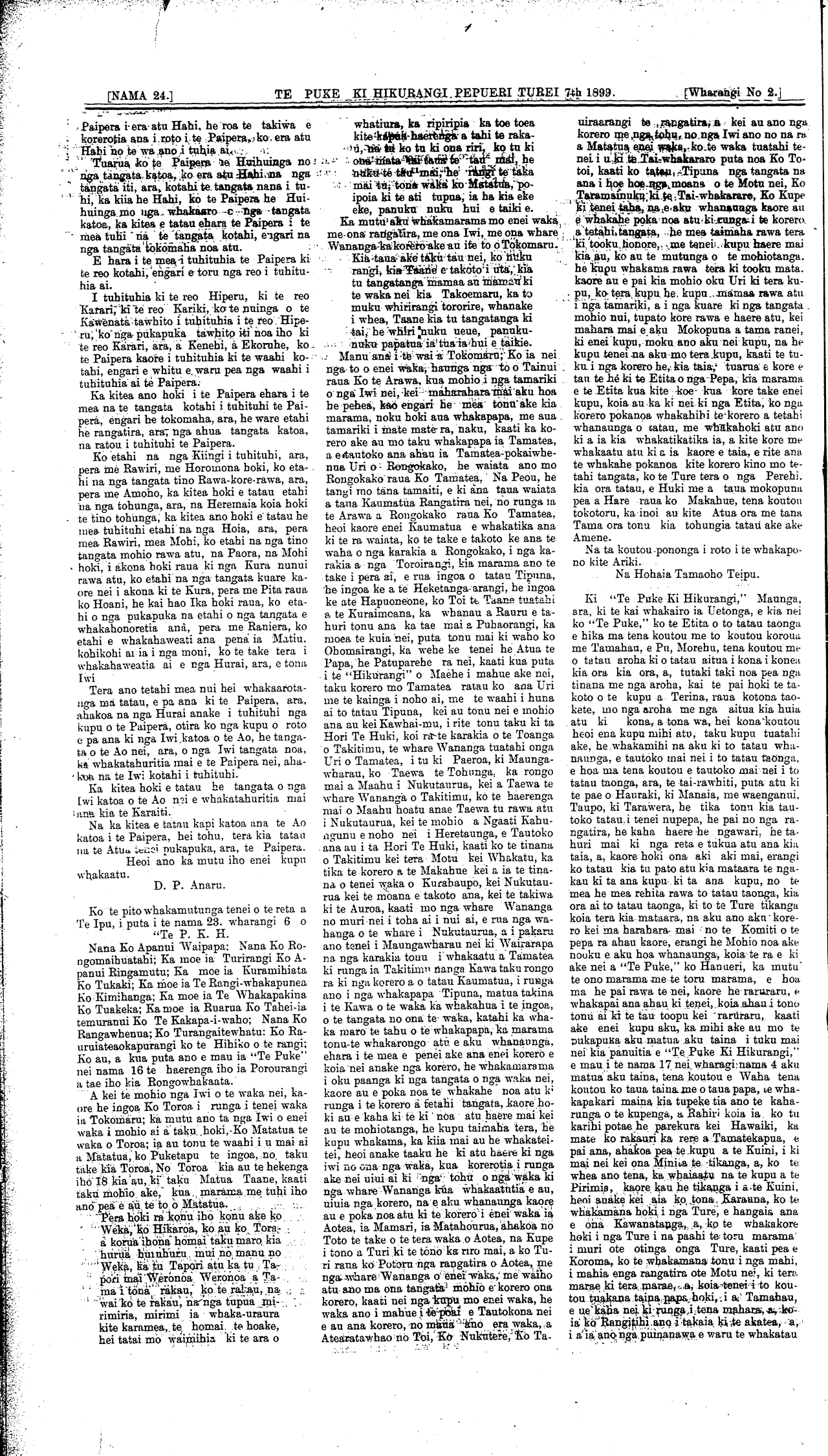 [NAMA 24.]TE PUKE KI HIKURANGI PEPUERI TUREI 7th 1899. , Wharangi No. 2. Rawiri Mohi Horomona Heremaia Paora Hoani D. P. Anaru Matatua Tokomaru te Arawa Tainui Tamatea-pokaiwhenua Uri o Rongokako Toroirangi Ohomairangi Hori Te Huki Paeroa Manungawharau Taewa Nukutaurua Maahu Takitimu Ngaati Kahungunu Whakatu Kurahaupo Wairarapa Aotea Kupe Matahourua Toi Atearatawhao Turi Potoru Mamari Matatua Hare Makahue Hohaia Tamaoho Teipu Uetonga Tamahau Terina Hauraki Manaia Taupo Tarawera Tamatekapua Ko te pito whakamutunga tenei o te reta a Te Ipu, i puta i te nama 23. wharangi 6 o "Te P. E. H. Nana Ko Apanui Waipapa; Nana Ko Ro-ngomaihuatahi; Ka moe ia Turirangi Ko A-panui Ringamutu; Ka moe ia Kuramihiata Ko Tukaki; Ka moe ia Te Rangi-whakapunea Ko Kimihanga; Ka moe ia Te Whakapakina Ko Tuakeke; Ka moe ia Ruarua Ko Tahei-ia temuranui Ko Te Kakapa-i-waho; Nana Ko Rangawhenua; Ko Turangaitewhatu: Ko Ra-uruiateaokapurangi ko te Hihiko o te rangi; Ko au, a kua puta ano e mau ia "Te Puke" nei nama 16 te haerenga iho ia Porourangi a tae iho kia Rongowhakaata. A kei te mohio nga Iwi o te waka nei, kaore he ingoa Ko Toroa i runga i tenei waka ia Tokomaru; ka mutu ano ta nga Iwi o enei waka i mohio ai ai taku hoki,Ko Matatua te waka o Toroa; ia au tonu te waahi i u mai ai