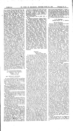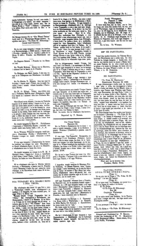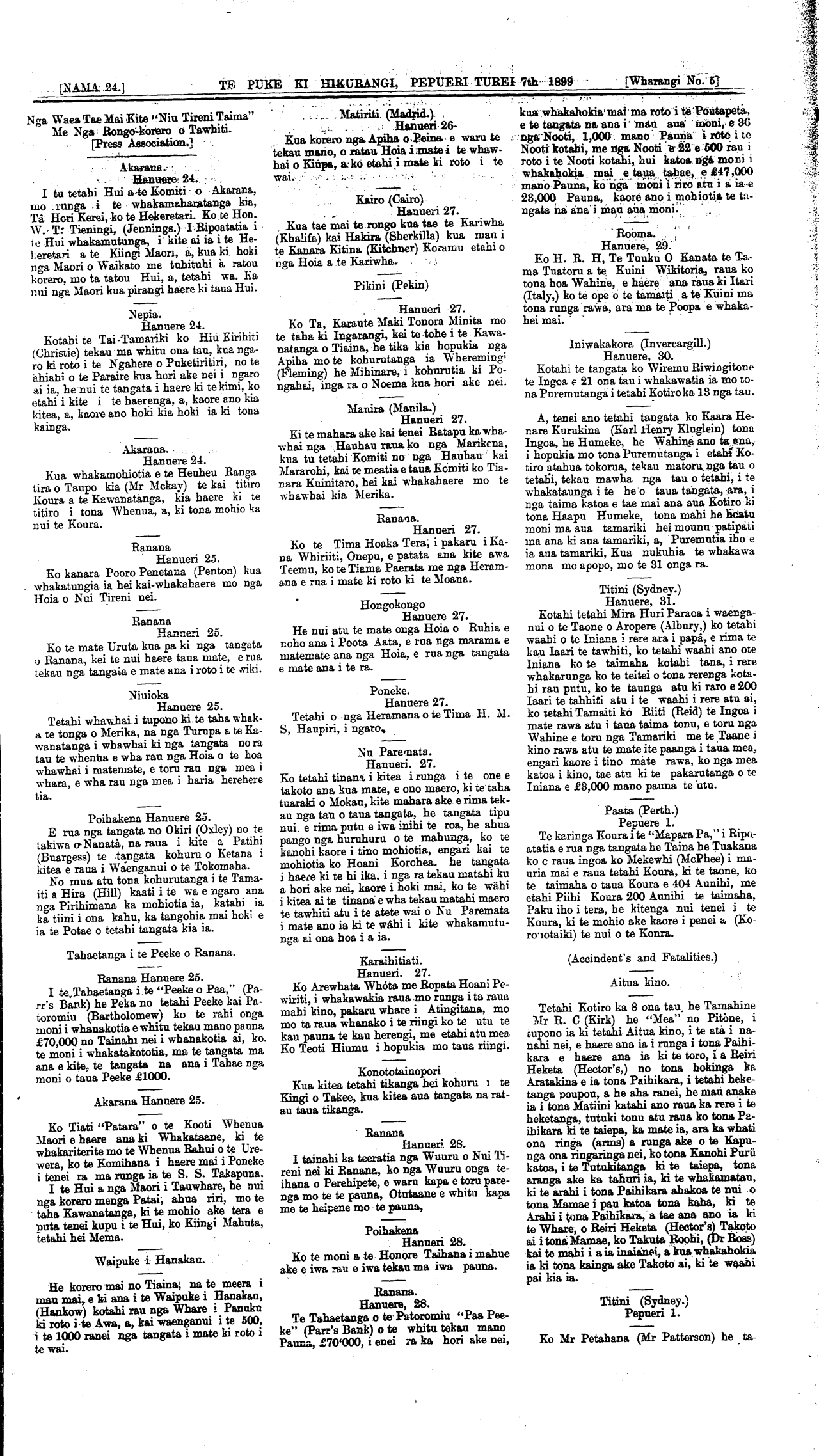 ..... [NAMA.24.TE PUKE KI HIKURANGI PEPUERI TUREI 7th 1899 [Wharangi No. 5 Aitua kino. Tetahi Kotiro ka 8 ona tau he Tamahine Mr R. C (Kirk) he "Mea" no Pitone, i tupono ia ki tetahi Aitua kino, i te ata i nanahi nei, e haere ana ia i runga i tona Paihikara e haere ana ia ki te toro, i a Reiri Heketa (Hector's,) no tona hokinga ka Aratakina e ia tona Paihikara, i tetahi heketanga poupou, a he aha ranei, he mau anake ia i tona Matiini katahi ano raua ka rere i te heketanga, tutuki tonu atu raua ko tona Paihikara ki te taiepa, ka mate ia, ara ka whati ona ringa (anus) a runga ake o te Kapunga ona ringaringa nei, ko tona Kanohi Puru katoa, i te Tutukitanga ki te taiepa, tona aranga ake ka tahuri ia, ki te whakamatau, ki te arahi i tona Paihikara ahakoa te nui o tona Mamae i pau katoa tona kaha, ki te Arahi i tona Paihikara, a tae ana ano ia ki te Whare, o Reiri Heketa (Hector's) Takoto ai i tona Mamae, ko Takuta Roohi, (Dr. Ross) kai te mahi i a ia inaianei, a kua whakahokia, ia ki tona kainga ake Takoto ai, ki te waahi pai kia is. Titini (Sydney.) Pepueri 1. Ko Mr Petahana (Mr Patterson) he ta-