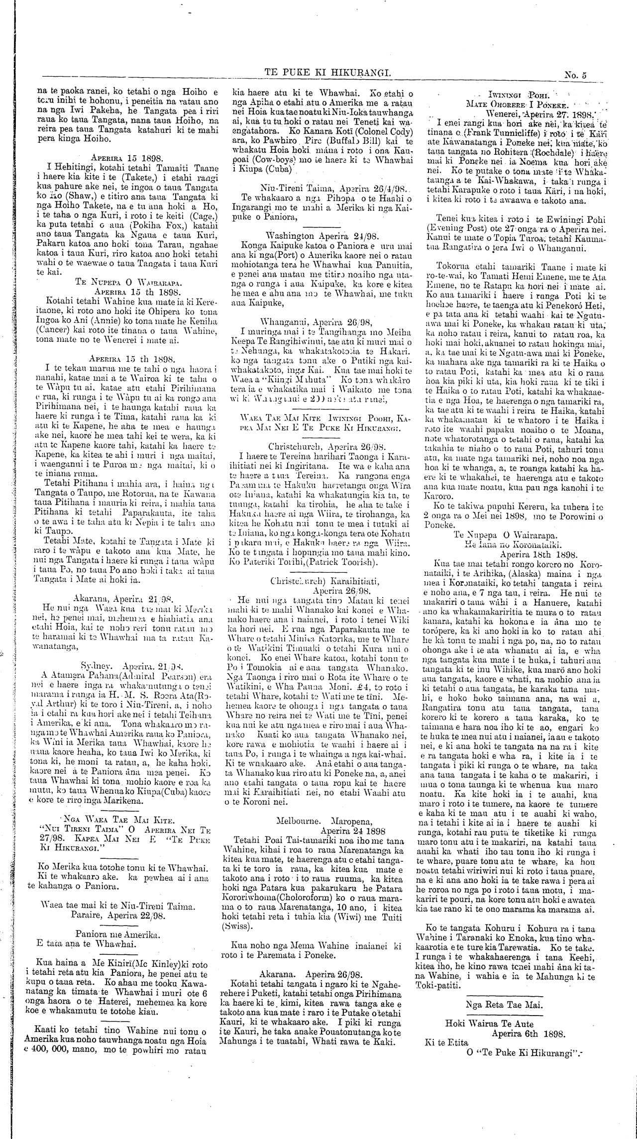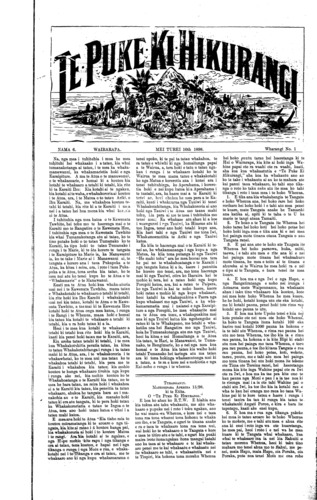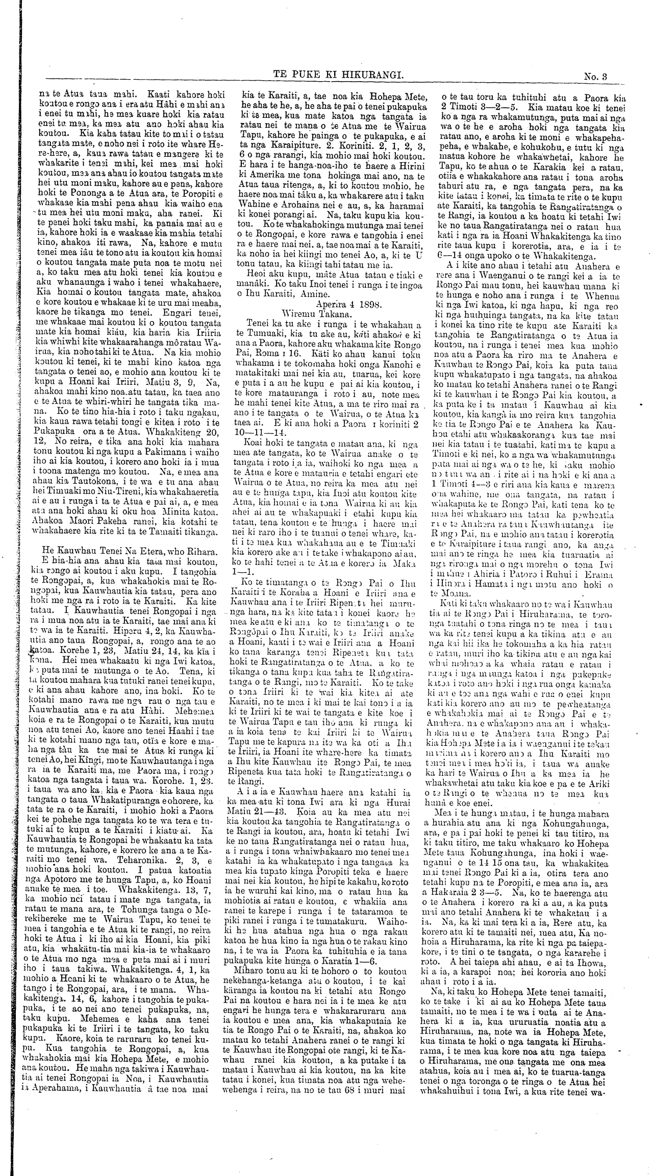 PUKE KI HIKURANGI NAMA 6.WAIRARAPA. MEI TUREI 10th 1898. Wharangi No. 1 Na, nga mea i tuhituhia i mua he mea tuhituhi hei whakaako i a tatau, kia whai tumanakotanga ai tatau, i te mea ka whakamanawanui, ka whakamarietia hoki e nga Karaipiture. A ma te Atua o te manawanui, o te whakamarie, e homai ki a koutou kia kotahi te whakaaro a tetahi ki tetahi, kia rite ki ta Karaiti Ihu: Kia kotahi ai te ngakau, kia kotahi ai te waha,e whakakororia ai koutou i te Atua ara, i te Matua o to tatau Ariki, o Ihu Karaiti. Na, me whakahoa koutou tetahi ki tetahi, kia rite ki a te Karaiti i mea nei i a tatau hei hoa mona kia whai kororia ai te Atua. I tuhituhia nga mea katoa o te Kawenata Tawhito, hei tohu mo te haerenga mai o te Karaiti mo te Rangatira o te Kawenata Hou, I tuhituhia nga mea o te Kawenata Tawhito kia whai Tumanakotanga atu ai tatau, ko te tino putake hoki o to tatau Tumanako ko te Karaiti, ka tipu hoki to tatau Tumanako i runga i te Marie, ki te ata korero te tangata i te Karaipiture ka Marie ia, ka Manawanui ia, ko te take i Marie ai i Manawanui ai, te tangata e korero ana i taua Pukapuka a te Atua, ka kitea i reira, ara, i roto i taua Pukapuka a te Atua, tona aroha kia tatau, ko te mea nui atu ko tenei kupu ko te Atua o te "Whakamarie" o te Manawanui. Kaati ma te Atua hoki kua whaka-aturia mai nei i te Kawenata Tawhito, mana tatau e Whakakotahi te whakaaro o tetahi ki tetahi, kia rite hoki kia Ihu Karaiti i whakakotahi mai nei kia tatau, kotahi te Atua o te Kawenata Tawhito, a taemai ki te Kawenata Hou kotahi hoki te Atua onga mea katoa, i runga i te Rangi i te Whenua, mana hoki e homai kia tatau kia kotahi te whakaaro a tetahi ki tetahi, kia u ra hoki tatau ki a ia. Heoi i te mea kua kotahi te whakaaro a tetahi ki tetahi kua rite hoki kia te Karaiti, kaati kia penei hoki taiau me te Karaiti, ara, Kia aroha tatau tetahi ki tetahi, i te mea kua Whakakotahitia peratia tatau, ka kitea to tatau Whakakotahitanga i runga i ta tatau mahi ki te Atua, ara, i te whakakororia i te whakawhetai, ko te mea nui ma tatau ko te whakahoa tetahi ki tetahi, kia pera me te Karaiti i whakahoa kia tatau; kia mohio koutou te hunga whakaaro tirohia nga kupu i runga ake nei, kia mohio koutou ko te Whakahoatanga o te Karaiti kia tatau, no te mea he hara tatau, na reira hoki i whakahoa ai a te Karaiti kia tatau, kia peneitia ta tatau whakaaro, ahakoa he tangata hara au i ma-nakohia au e te Karaiti, kia manako hoki tatau ki era atu tangata, ki te pera hoki tatau • ka Whakakororiatia e tatau te Ingoa o te Atua, tera ano • hoki tatau katoa e whai i a tatau mahi katoa. E mea ana hoki te Atua "Kia tiaho raia to koutou maramatanga ki te aroaro o nga tangata, kia. kite ai ratau i a koutou hanga pai, kia whakakororia ai hoki i to koutou Matua i te rangi. Ara kia kotahi ai te ngakau, e nga Hapu mohio kite rapu i nga tikanga e ora ai tatau, tena koutou, e hapai nei i nga tikanga o runga, i nga Motu e rua, e whakakotahi nei i te Tikanga e ora ai tatau, nae te whakaaro ano ki nga kupu whakamarama o