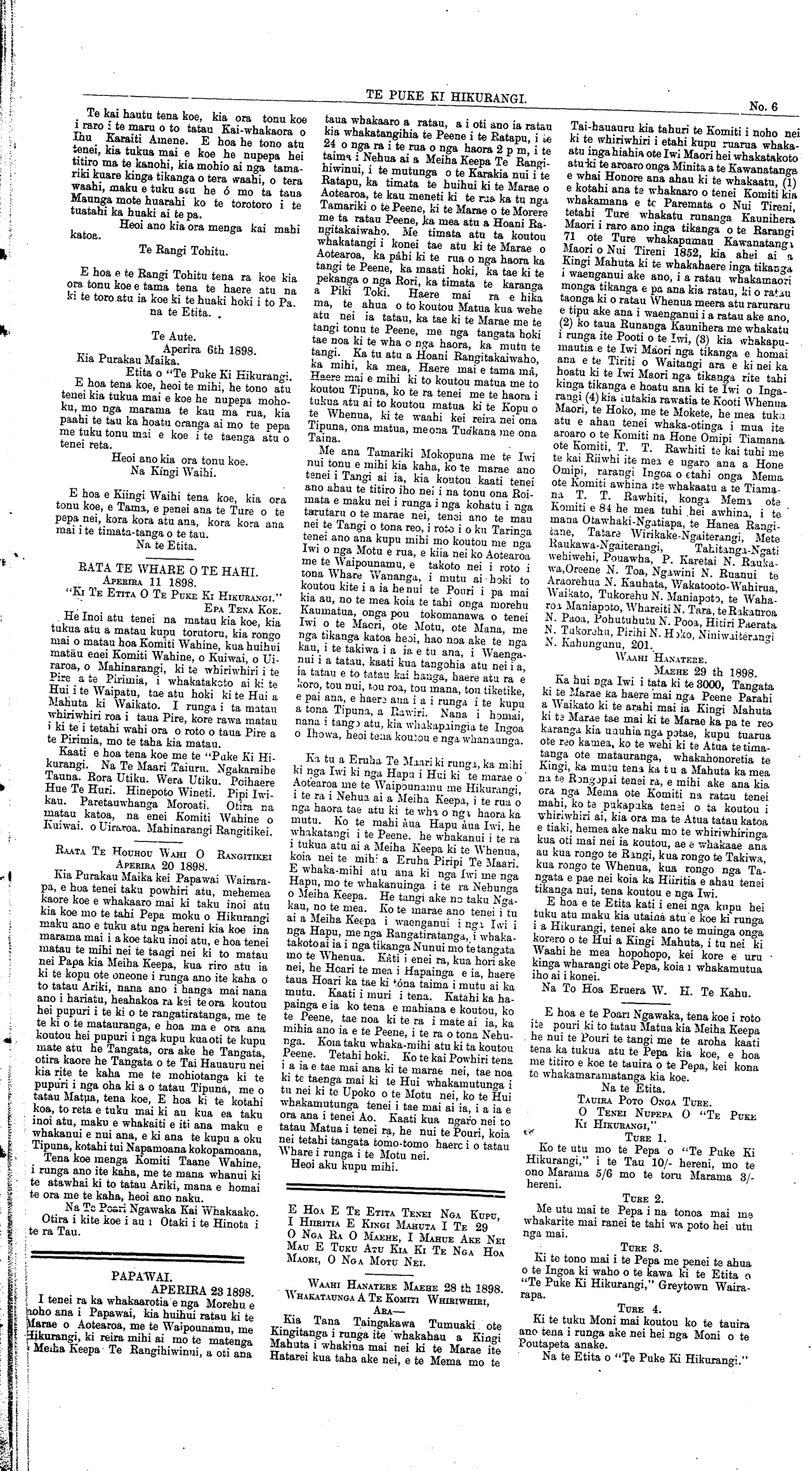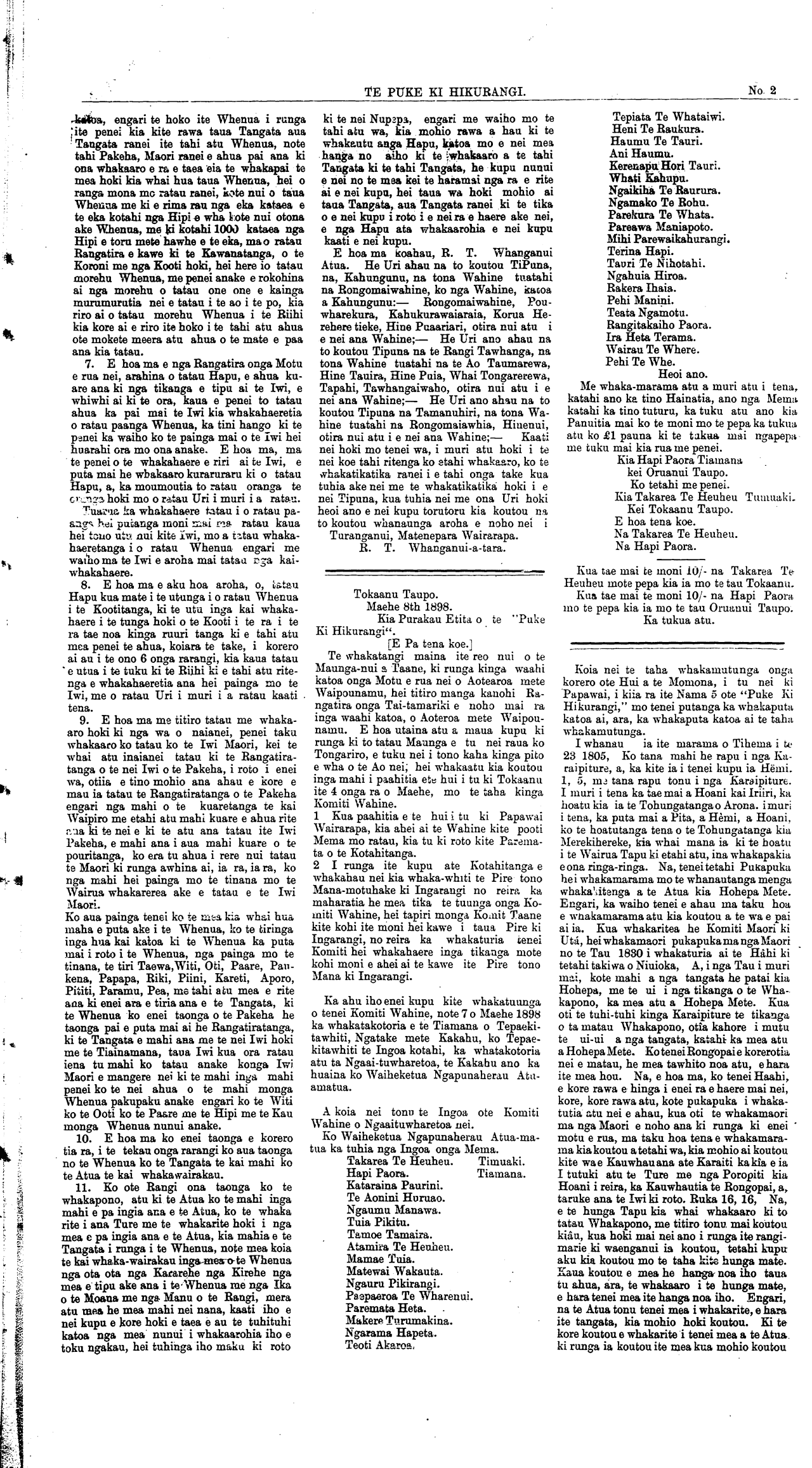 TE PUKE KI HIKURANGI. A koia nei tonu te Ingoa ote Komiti Wahine o Ngaaituwharetoa nei. Ko Waiheketua Ngapunaherau Atua-rna-tua ka tuhia nga Ingoa onga Mema. Takarea Te Heuheu. Timuaki. Hapi Paora.Tiamana. Kataraina Paurini. Te Aonini Huruao. Ngaumu Manawa. Tuia Pikitu. Tamoe Tamaira. Atamira Te Heuheu. Mamae Tuia. Matewai Wakauta. Ngauru Pikirangi. Paepaeroa Te Wharenui. Paremata Heta. Makere Turumakina. Ngarama Hapeta. Teoti Akaroa. Tepiata Te Whataiwi. Heni Te Raukura. Haumu Te Tauri. Ani Haumu. Kerenapu Hori Tauri. Whati Kahupu. Ngaikiha Te Raurura. Ngamako Te Rohu. Parekura Te Whata. Pareawa Maniapoto. Mihi Parewaikahurangi. Terina Hapi. Tauri Te Nihotahi. Ngahuia Hiroa. Rakera Ihaia. Pehi Manini. Teata Ngamotu. Rangitakaiho Paora. Ira Heta Terama. Wairau Te Where. Pehi Te Whe. Heoi ano. Me whaka-marama atu a muri atu i tena, katahi ano ka tino Hainatia, ano nga Mema katahi ka tino tuturu, ka tuku atu ano kia Panuitia mai ko te moni mo te pepa ka tukua atu ko £1 pauna ki te tukua mai ngapepa me tuku mai kia rua me penei. Kia Hapi Paora Tiamana kei Oruanui Taupo. Ko tetahi me penei. Kia Takarea Te Heuheu Tumuaki- Kei Tokaanu Taupo. E hoa tena koe. Na Takarea Te Heuheu. Na Hapi Paora. Kua tae mai te moni 10/- na Takarea Te-Heuheu mote pepa kia ia mo te tau Tokaanu. Kua tae mai te moni 10/- na Hapi Paora mo te pepa kia ia mo te tau Oruanui Taupo. Ka tukua atu.