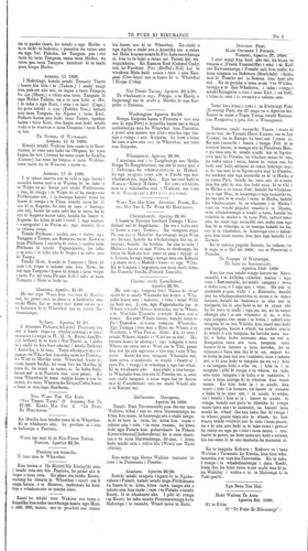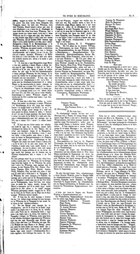 TE PUKE KI HIKURANGI. " Rarena Noa. " Parakira Ti Rihana. " Tirikama Panga. " Paranihi Mi Raimana. " Hoani Henare Mete. " Hori Tihiteera. " Hipa Te Karanati. " Hoani Wi Teira. " Merina Mi Merare. " Anatane Rona. " Matiaha Whohi Kauri. " Aperehana O Ena Wururawhi. Kua tautokona e nei Tangata hei Apotoro hei matakite hei whakaatu i nga mea e wha-kakitea mai ana e te Atua kia ratau, hei Tumuaki mo te Hunga Tapu o nga ra o muri nei, a, i te Ao katoa hoki, a, tautokona ana e te whakaminenga, aia e nga ringaringa katoa, ko Hoani Mete kia tautokona hei peteriaka ko te Tangata e hiahia ana kia whakaatutia he manaakitanga mona mo haere ki taua Tangata. Kua whakaritea a Hima Pi Tanga, a Tare Wheriteita, a Honatana, E. Kimapara, a P. Henare Ropata, a Hori Renara, a Riirona S. Weera, a Hohepa Makamarana, hei Timuaki mo nga Whitu-tekau e tonoa nei ki ta Kauwhau. Wiremu P. Perehitana, hei Timuaki mo nga Pihopa me Ropata T. Pata-na he Kaunihera tuatahi kia ia me Hoani R Winita he Kaunihera tuarua, i roto i te Pihopatanga. Ko Parakirana Ti. Riraha, me Hooni Heke raua ko Tare, W. Penerohe hei kai Tuhituhi tikanga me nga whakapapa mo te Hahi, a tautokona ana e te whakaminenga, i ara katoa o ratau ringaringa,. Ko Etera Who Rihara, me Etera Ti Tiwinihana, hei Tumuakimo Niu Tireni, a tautokona ana, ara i tu nga ringiringi katoa, muri iho ka tu a Etera T. Tiwinihana ka mihi ki te whakaminenga ka mea i hui nga Mema o te Tohungatanga i tenei ahiahi ka hori ake nei i mea atu ahau kua riro mai i a ratau te Tohungatanga o te Atua. No reira ka mea atu hoki ahau ki a koutou kua riro mai hoki i a koutou te raneatanga Oue Rongo Pai no te mea kua riro tatau hei Tangata hou he mai na te iriiri rumakitanga, a kua riro mai hoki he whakapakanga o nga ringaringa o nga pononga ate Atua, kua riro mai hoki t3 Wairua Tapu i a tatau, no reira nga Tangata katoa i roto i tenei Hihi, nga Taane nga Wahine kaua e hoki ki te hara i nga ra e takoto mai nei no te mea ki te hara ano tatau kino noa atu to tatau whakamutunga, na e hoa ma kia mahara tonu koutou ki enei mea no te mea kei te titiro mai o tatau hoa kua mate atu nei, me he mea kei konei ratau kua ki tonu mai ratau kia tatau kia u ki te mahi pai i nga wa katoa. Me nga Anahera me te Atua, kei te titiro tonu mai ratau ki a tatau mahi, ahakoa pai ahakoa kino.
