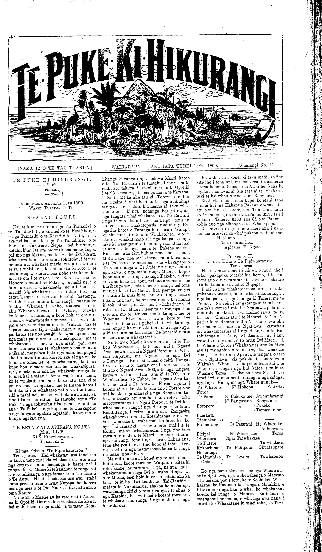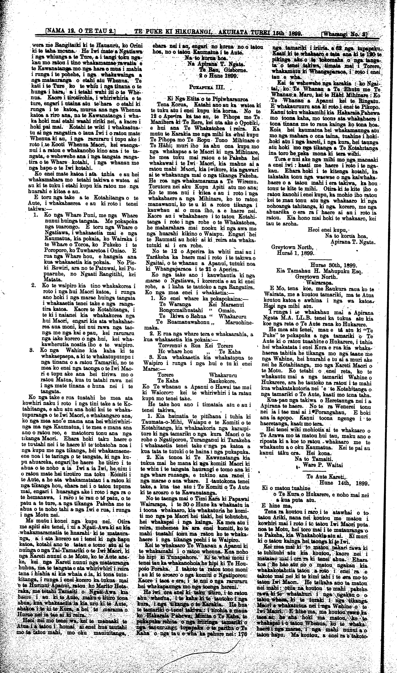 [NAMA 12. O TE TAU 2.] TE PUKE KI HIKURANGI AKUHATA TUREI 15th 1899 Wharangi No. 2 Rangitiki Hauauru Orini Ngatiawa Wairaka Ngaati Rangitihi Matata Merito Hetaraka Apirana T. Ngata Te Rau, Gisborne Opotiki Whangaparaoa Te Whanau a Apanui Te Houpoto Poraka Ngatiporou Hakaraia Pahewa Te Kaha Tamahau H. Mahupuku Esq. Greytown North Wairarapa Hukarere Ware P. Waitai Te Aute Kareti