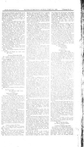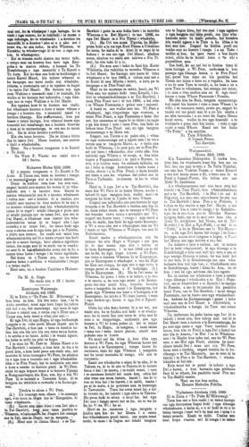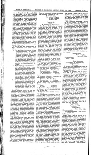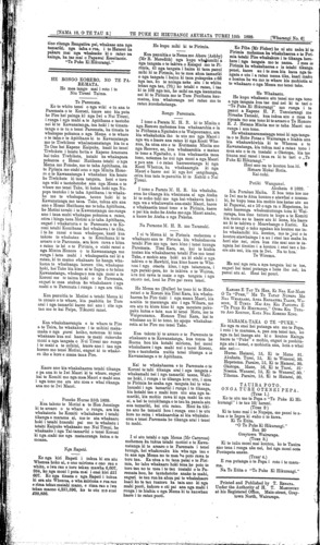 [NAMA. 12. O TE TAU 2.]\_\_\_\_\_\_TE PUKE KI HIKURANGI AKUHATA TUREI 15th 1899.\_\_\_\_\_[Wharangi No. 6] KAHORE E TAU TE HEE, KI NGA KAI-MAHI O TE "PUKE," ME To TATAU NUPEPA Mo NGA WHAKAARO, ANGA RANGATIRA TAANE, WAHINE, E TUKUA MAI ANA KIA PANUITIA E "TE PUKE KI HIKURANGI," OTIRA KIA TUPATO ANO KOUTOU, KAUA NGA KORERO KINO. MARAMA-TAKA O TE "PUKE." Ko nga ra enei hei putanga atu mo te Pepa, i roto i te marama, a, pau noa tenei tau, ko nga ra hei taenga atu ki o koutou Kainga kaore te "Puke" e mohio, engari te poohita-nga atu i konei, e mohiotia ana, koia e whai ake nei:— • Hurae. Hatarei, 15, Ki te Mane 31. Akuhata. Turei, 15, Ki te Wenerei, 30. Hepetema. Paraire, 15, Ki te Hatarei, 30. Oketopa. Mane, 16, Ki te Turei, 31* Noema. Wenerei, 15, Ki te Wenerei; 30. " Tihema. Paraire, Io, Ki te Hatarei, 30. TAUIRA POTO. ONGA TUBE OTENEI PEPA. (TURE 1.) Ko te utu mo te Pepa o "Te Puke Ki Hikurangi" i te tau 10/ hereni. (TURE 2) Ki te tono mai i te Nupepa, me penei te a-hua o te Ingoa ki waho o te kawa. Ki Te Etita. "O Te Puke Ki Hikurangi." Box 20 Greytown Wairarapa. (TUBE 3.) Ki te tuku moni mai koutou, ko te Tauira ano tena i runga ake nei, hei nga moni oota Poutapeta anake. (TURE 4.) E rua putanga o te Pepa i roto i te marama. Na Te Etita o "Te Puke Ki Hikurangi."