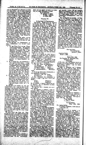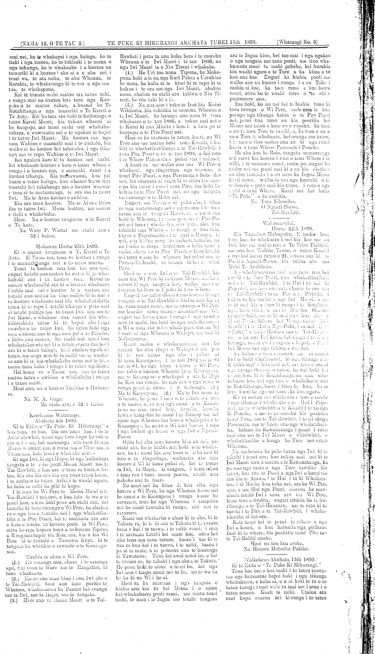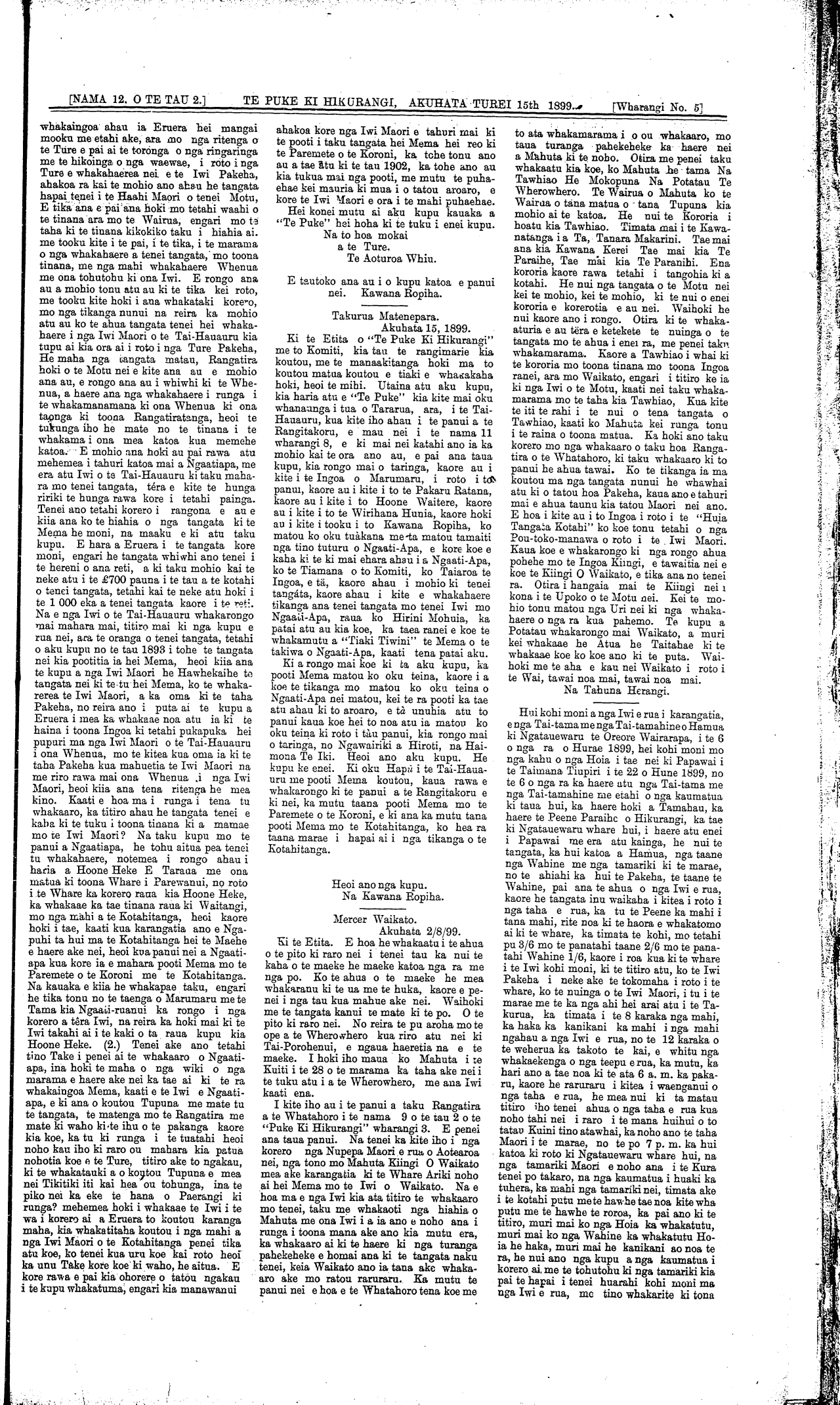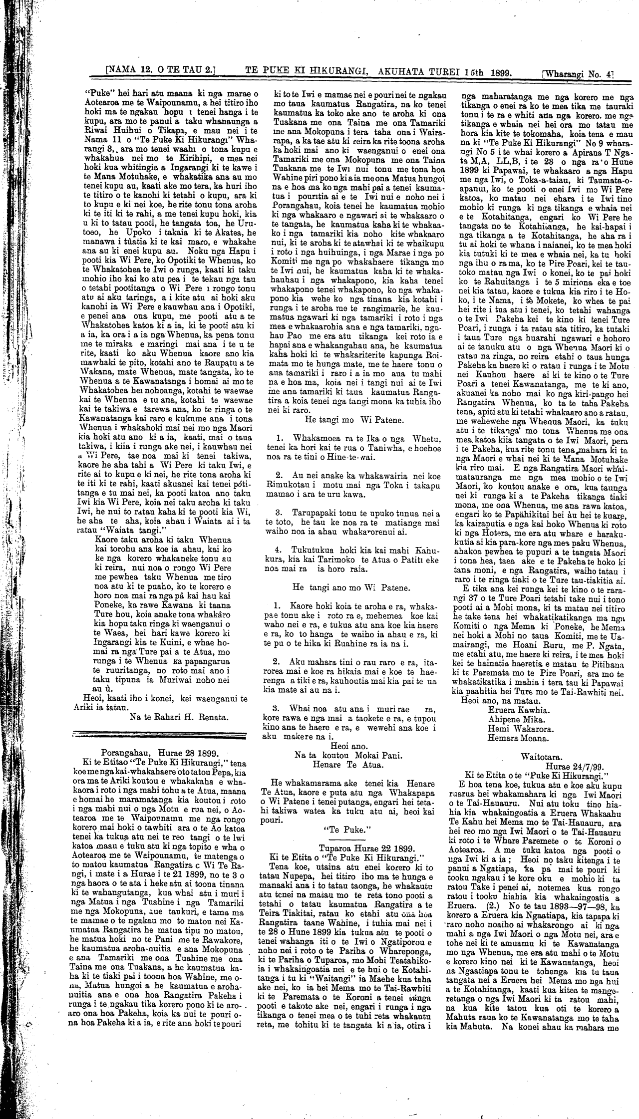 [NAMA 12, O TE TAU 2.]TE PUKE KI HIKURANGI, AKUHATA TUREI 15th 1899 [Wharangi No. 5] Takurua Matenepara. Akuhata 15, 1899. Ki te Etita o "Te Puke Ki Hikurangi" me to Komiti, kia tau te rangimarie kia koutou, me te manaakitanga hoki ma to koutou matua koutou e tiaki e whakakaha hoki, heoi te mihi. Utaina atu aku kupu, kia haria atu e "Te Puke" kia kite mai oku whanaunga i tua o Tararua, ara, i te Tai-Hauauru, kua kite iho ahau i te panui a te Rangitakoru, e mau nei i te nama 11 wharangi 8, e ki mai nei katahi ano ia ka mohio kai te ora ano au, e pai ana taua kupu, kia rongo mai o taringa, kaore au i kite i te Ingoa o Marumaru, i roto i to panui, kaore au i kite i to te Pakaru Ratana, kaore au i kite i to Hoone Waitere, kaore au i kite i to te Wirihana Hunia, kaore hoki au i kite i tooku i to Kawana Kopiha, ko matou ko oku tuakana me ta matou tamaiti nga tino tuturu o Ngaati-Apa, e kore koe e kaha ki te ki mai ehara ahau i a Ngaati-Apa, ko te Tiamana o to Komiti, ko Taiaroa te Ingoa, e ta, kaore ahau i mohio ki tenei tangata, kaore ahau i kite e whakahaere tikanga ana tenei tangata mo tenei Iwi mo Ngaati-Apa, raua ko Hirini Mohuia, ka patai atu au kia koe, ka taea ranei e koe te whakamutu a "Tiaki Tiwini" te Mema o te takiwa o Ngaati-Apa, kaati tena patai aku. Ki a rongo mai koe ki ta aku kupu, ka pooti Mema matou ko oku teina, kaore i a koe te tikanga mo matou ko oku teina o Ngaati-Apa nei matou, kei te ra pooti ka tae atu ahau ki to aroaro, e ta unuhia atu to panui kaua koe hei to noa atu ia matou ko oku teina ki roto i tau panui, kia rongo mai o taringa, no Ngawairiki a Hiroti, na Haimona Te Iki. Heoi ano aku kupu. He kupu ke enei. Ki oku Hapu i te Tai-Haua-uru me pooti Mema koutou, kaua rawa e whakarongo ki te panui a te Rangitakoru e ki nei, ka mutu taana pooti Mema mo te Paremete o te Koroni, e ki ana ka mutu tana pooti Mema mo te Kotahitanga, ko hea ra taana marae i hapai ai i nga tikanga o te Kotahitanga. Heoi ano nga kupu. Na Kawana Ropiha.