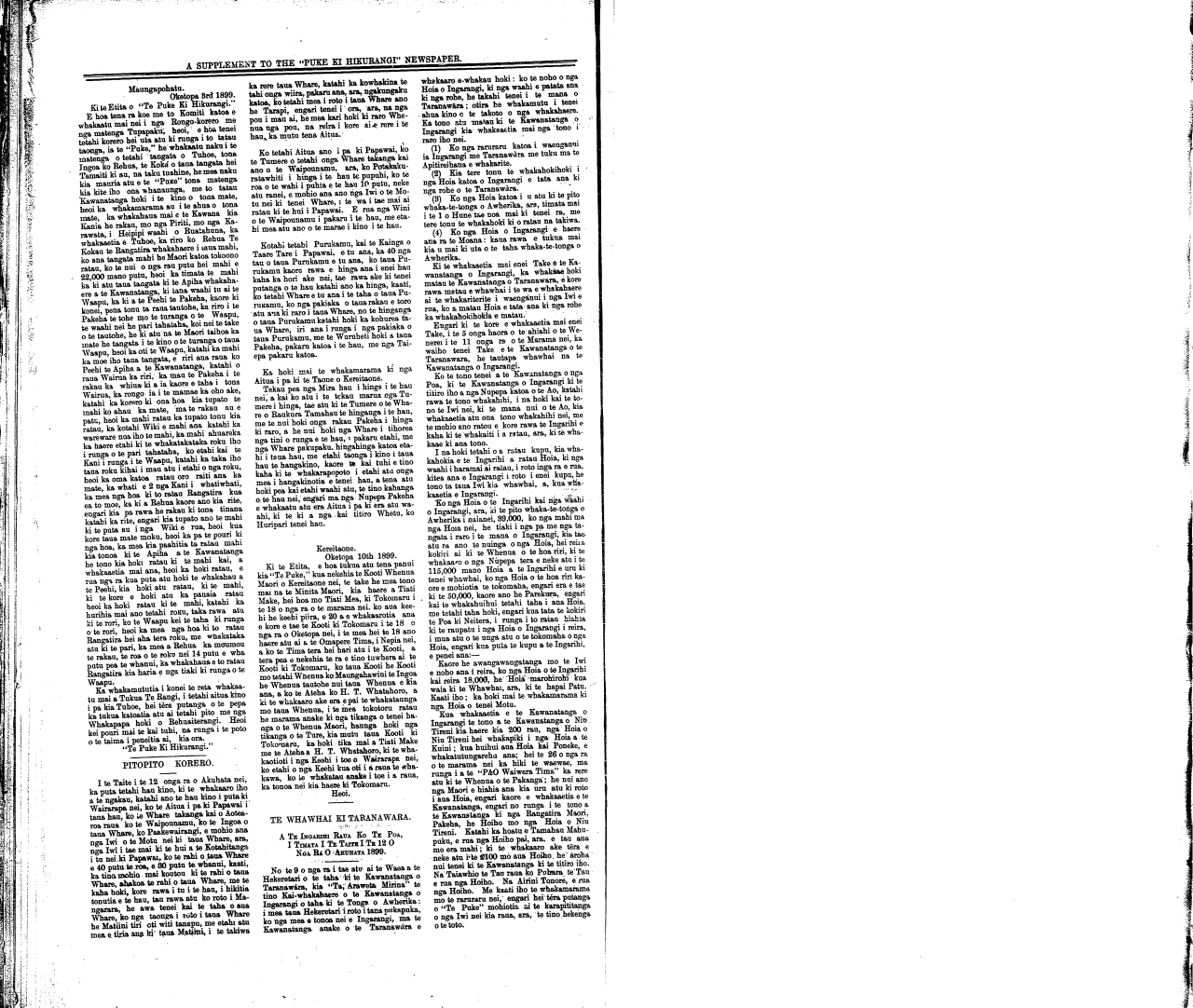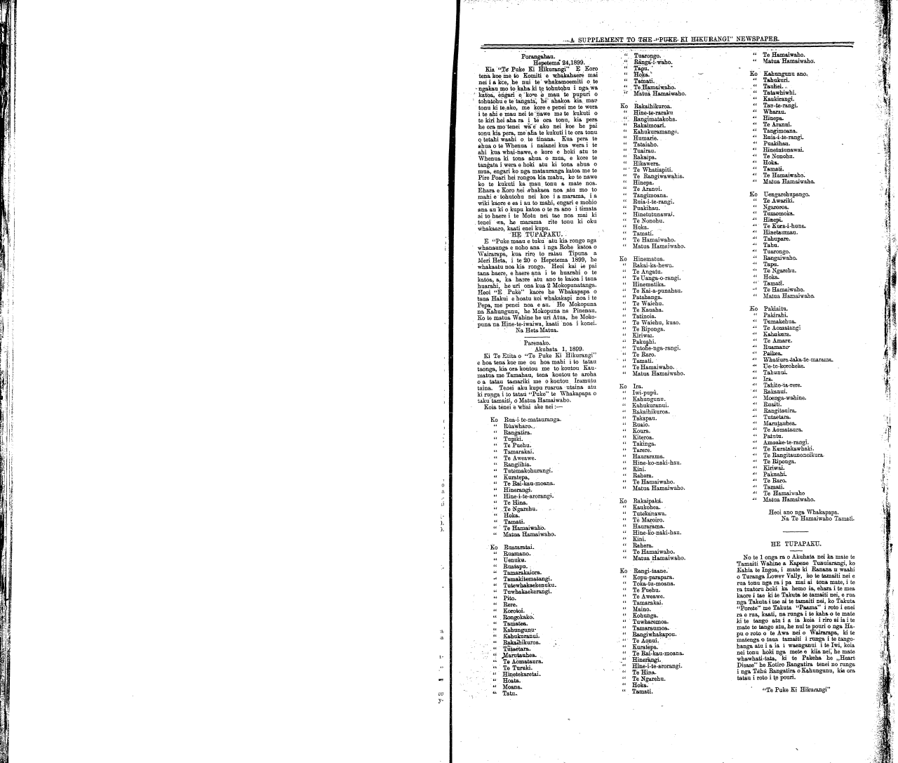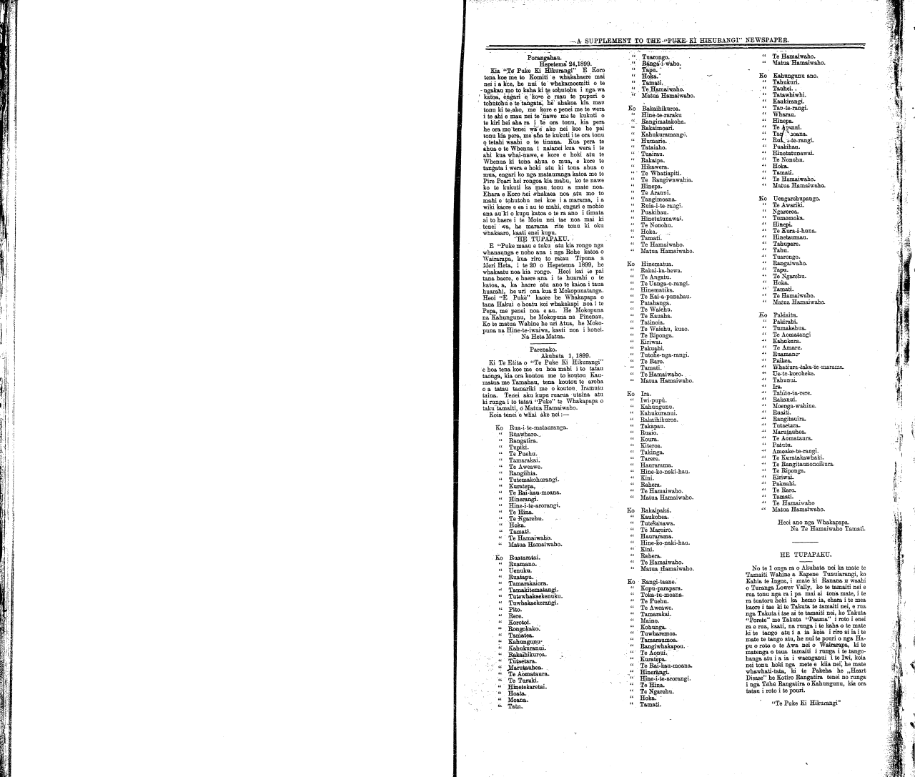 A SUPPLEMENT TO THE "PUKE KI HIKURANGI" NEWSPAPER. PITOPITO KORERO. I te Taite i te 12 onga ra o Akuhata nei, ka puta tetahi hau kino, ki te whakaaro iho a te ngakau, katahi ano te hau kino i puta ki Wairarapa nei, ko te Aitua i pa ki Papawai i taua hau, ko te Whare takanga kai o Aotearoa raua ko te Waipounamu, ko te Ingoa o taua Whare, ko Paakewairangi, e mohio ana nga Iwi o te Motu nei ki tana Whare, ara, nga Iwi i tae mai ki te hui a te Kotahitanga i ta nei ki Papawai, ko te rahi o taua Whare e 40 patu te roa, e 80 puta te. whanui, kaati, ka tina mohio mai koutou ki te rahi o tana Whare, ahakoa te rahi o taua Whare, me te kaha hoki, kore rawa i tu i te hau, i hikitia tonutia e te hau, tau rawa ata ko roto i Mangatara, he awa tenei kai te taha o aua Whare, ko nga taonga i roto i taua Whare he Matiini tiri oti witi tanapu, me etahi ata mea e. tiria ana ki taua Matiini, i te takiwa