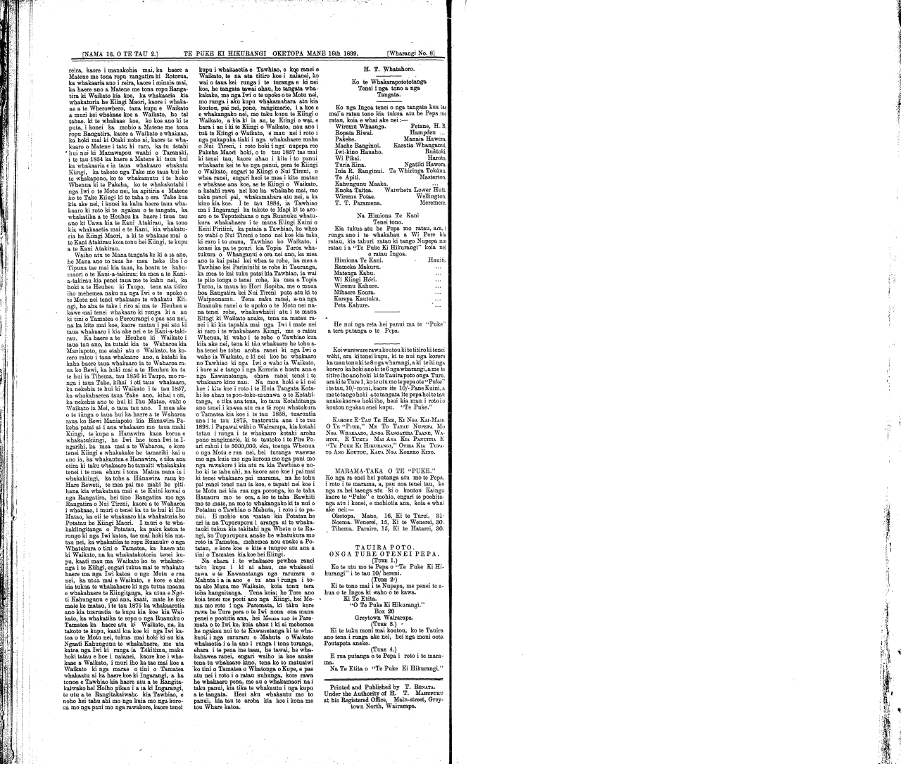 [NAMA 16. O TE TAU 2.]\_\_\_\_\_TE PUKE KI HIKURANGI OKETOPA MANE 16th 1899.\_\_\_\_\_\_[Wharangi No. 8] Koi wareware rawa koutou ki te titiro ki tenei wahi, ara ki tenei kupu, ki te nui nga korero ka mau tonu ki te 8 nga wharangi, a ki te iti nga korero ka hoki ano ki te 6 nga wharangi,a me te titiro iho ano hoki ki te Tauira poto onga Ture, ara ki te Ture 1, ko te utu mo te pepa ote "Puke" i te tau, 10/- moai, kaore ite 10/- Pane Kuini, a me te tango hoki a te tangata ite pepa hei te tau anake kaore e hoki iho, heoi kia mau i roto i o koutou ngakau enei kupu. "Te Puke." KAHORE E TAU TE HEE, KI NGA KAI-MAHI O TE "PUKE," ME To TATAU NUPEPA Mo NGA WHAKAARO, ANGA RANGATIRA TAANE, WAHINE, E TUKUA MAI ANA KIA PANUITIA E "TE PUKE KI HIKURANGI," OTIRA KIA TUPATO ANO KOUTOU, KAUA NGA KORERO KINO. MARAMA-TAKA O TE "PUKE." Ko nga ra enei hei putanga atu mo te Pepa, i roto i te marama, a, pau noa tenei tau, ko nga ra hei taenga atu ki o koutou Kainga kaore te "Puke" e mohio, engari te poohita-nga atu i konei, e mohiotia ana, koia e whai ake nei:— Oketopa. Mane, 16, Ki te Turei, 31-Noema. Wenerei, 15, Ki te Wenerei, 30. Tihema. Paraire, 15, Ki te Hatarei, 30. TAUIRA POTO. ONGA TURE OTENEI PEPA. (TURE 1.) Ko te utu mo te Pepa o "Te Puke Ki Hikurangi" i te tau 10/ hereni. (TUBE 2-) Ki te tono mai i te Nupepa, me penei te a-hua o te Ingoa ki waho o te kawa. Ki Te Etita. "O Te Puke Ki Hikurangi." Box 20 Greytown Wairarapa. (TURE 3.) Ki te tuku moni mai koutou, ko te Tauira ano tena i runga ake nei, hei nga moni oota Poutapeta anake. (TUBE 4.) E rua putanga o te Pepa i roto i te marama. Na Te Etita o "Te Puke Ki Hikurangi."