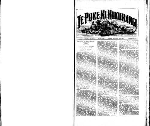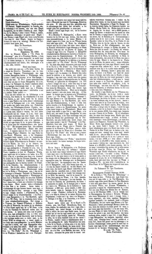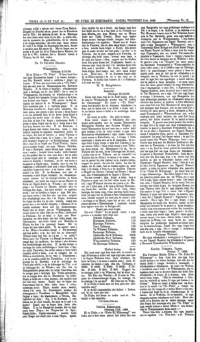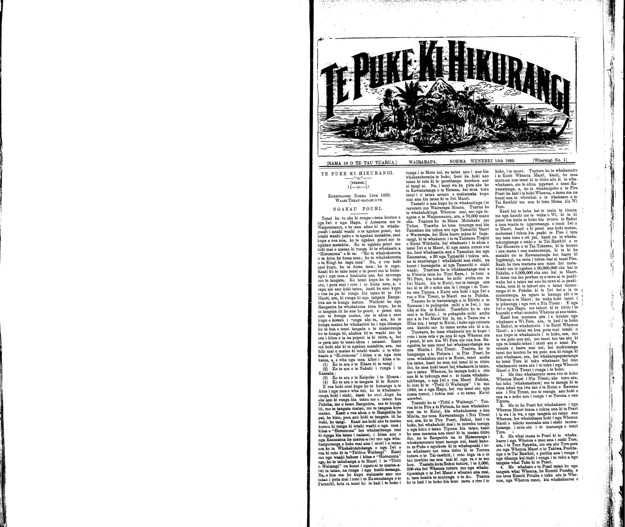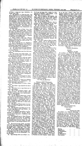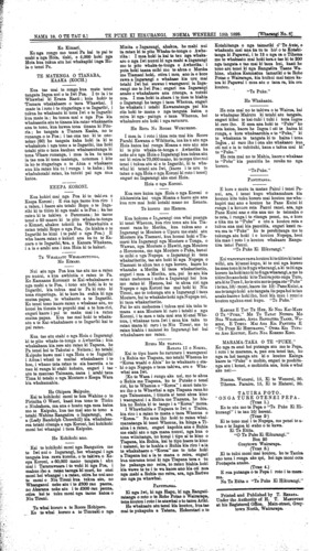 [NAMA 18. O TE TAU 2.]\_\_\_\_\_TE PUKE KI HIKURANGI NOEMA WENEREI 15th 1899.\_\_\_\_[Wharangi No. 7] TE WHAWHAI KI TE APITI O KOROPA. No te Paraire te torť o nga ra o Noema, ka tono mai nga Poa ki te Ingarihi kia mau te rongo i tenei ra tae noatia te mane, i whakaae nga kai whakahaere o te Inggrihi ki te tono a te Poa, engari i runga i tenei ritenga, kia kaua nga Poa e neke atu i nga waahi i noho nei ratou, kaati no te awatea ka tukua e te Ingarihi to ratau Puruna kia rere ki runga, hei matakitaki i nga mahi a nga Poa, ka kite iho e haere ana nga Poa, heoi ano ka timata tonu iho te whawhai o te Ingarihi ki te Poa, ko te waahi i tu ai te tino whawhai i tenei rangi ko te takiwa ki te whakatetonga o te Pa o te Ingarihi, i tonoa tetahi ropu eke Hoiho e te Tianara o te Ingarihi kia haere ki taua takiwa, kia mohio ai ia ki nga mahi a nga Poa o taua takiwa, heoi ka tata atu nga Hoia ki nga hiwi o reira ka kite iho ratau e noho ana nga Poa, i waenganui o nga hiwi, ko te waahi e kiia nei ko te Paahi o Koropa, kua oti ia ratau te whakanoho a ratau Purepo, heoi ka tuku whakaatu mai nga Hoia eke Hoiho ra. ki to ratau Tianara "Ta Hori Waiti" me to ratau noho ano i reira, no te taenga o te rongo kia "Tianara Ta Hori Waiti" ka tukua e ia tetahi ropu Hoia haere waewae hei whakapiki i te ropu eke Hoiho, ka tae nei nga Hoia haere waewae o te Ingarihi ki tetahi waahi e tata atu ana ki nga Poa, ka pikitia e ratau te hiwi, kai tua nei te Poa e noho ana tae noa ratou ki te tihi o taua hiwi, katahi ano ka tukua ta ratau kokiri whakararo ki nga Poa, ka mate kotahi rau i nga Peneti a te Ingarihi, a, whati kino ana nga Poa, ka rere hoki ratau ki te parae i tenei wa i whakapiri haere nga ropu eke Hoiho i nga hiwi, no te whatinga o nga Poa ka kokiri mai ratau ki te whawhai ki nga Poa, kotahi mano nga Poa i mate, e rua mano i riro Herehere i te Ingarihi.
