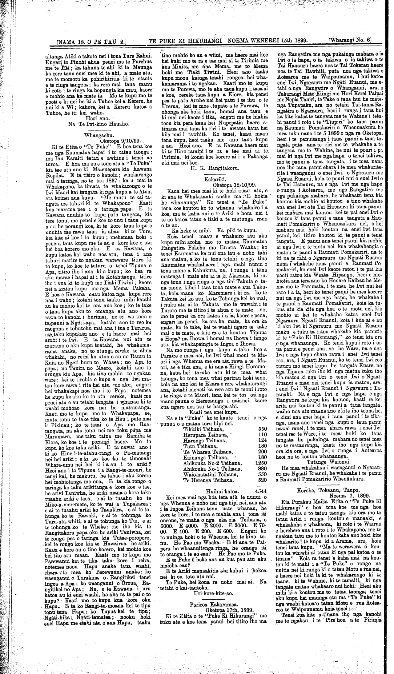 [NAMA. 18. O TE TAU 2.]TE PUKE KI HIKURANGI NOEMA WENEREI 15th 1899.\_\_\_\_[Wharangi No. 6] Kakariki. Oketopa 12/10/99. Kaua hei mea mai ki te hoki auau atu, e ki ana te Whakatauki anehe ma "E hokia he whanaunga" Ko tenei e "Te Puke" tena koe koutou ko to whanau whakairo i a koe, ma te kaha nui o te Ariki e hora nei i te ao katoa tatau e tiaki a te mutunga rano o te ao. Ka heke te mihi. Ea piki te kupu. Koia tenei maau e whakairo atu aku kupu mihi aroha, mo to matau Kaumatua Rangatira Pakeha mo Eruera Waaka; ko tenei Kaumatua ka nui ona tau e noho tahi ana matau, a ko ia tonu tetahi o nga tino Kaumatua whakahaere i nga mahi nunui o tona mana a Kahukura, na, i runga i tona matenga i mate atu ai ia ki Akarana, ki runga tonu i nga ringa o nga tini Takuta o taua taone, kihei i taea tona mate e aua Takuta, koia maua ko Maremare i ki ra, ko te Takata kei ko atu, ko te Tohunga kei ko mai, i nuku ata ai te Takuta mo te wawahi i te Turoro me te titiro i te ahua o te mate, na, mo te penei ka ora katoa i a ia, kaore e pena, engari ka penei, ka ora ka mate, ka ora ka mate, ko te take, kei te waahi ngaro te take mai o te mate, e kiia ra e to koutou Tipuna e Hopa? na Ihowa i homai na Ihowa i tango atu, kia whakapainga te Ingoa o Ihowa. Na mo runga i nga kupu a taku hoa a Paraire e mea nei, he Iwi whai moni te Maori i nga Whenua me era atu rawa a te Maori, ae e tika ana, e ki ana a Kiingi Horomona, kaua hei tarake atu ki te mea whai taonga, ko tona mea whai parirau hoki tena, koia na ano kei te E kara e rere whakaterangi ana, kotahi meneti ka rere atu te moni i roto i te ringa o te Maori, tena kei te toe oti nga mano pauna o Heretaunga i naianei, kaore kua ngaro noa ata te hanga-ahi. Kaati pea enei kupu. Na e te "Puke" ko te kaute tenei o nga • punua o a matau toru hipi nei. Tikitiki Teihana,550 Herupara Teihana," 110 Haronga Teihana, 124 Tutu Teihana, 180 ' Te Wharau Teihana, 200 Kainanga Teihana, 180 Ahikouka No-2 Teihana, 1250 Ahikouka No-1 Teihana, 880 Waiomatatini Teihana, 550 Te Herenga Teihana, 520 Huihui katoa.4544 Kei mea mai nga hoa tera atu te nunui o nga Whenua e noho nei nga nipi nei, aua atu i te Ingoa Teihana tonu nate whanau, he kore te kore, i te mea e mahia ana i tona iti oneone, te maha o nga eka oia Teihana, e 6000. E 4000. E 2000. E 2000. E 70-00. E 400. E 200. E 600. Engari ko te nuinga hoki o te Whenua, kei te kino tonu. He Pao mo Waaka:—E ki ana te Paipera he whaanuitanga ringa, he oranga iti te oranga i te ao eau? He Pao mo te Puke. E te Puke e heke ana au kua pau atu aku . maioha eau? E te Ariki manaakitia tau kahui i hokoa nei ki ou toto utu nui. Te Pake, hei kona ra noho mai ai. Na tetahi o kai-tautoko. Uri-kore-kite-ao.