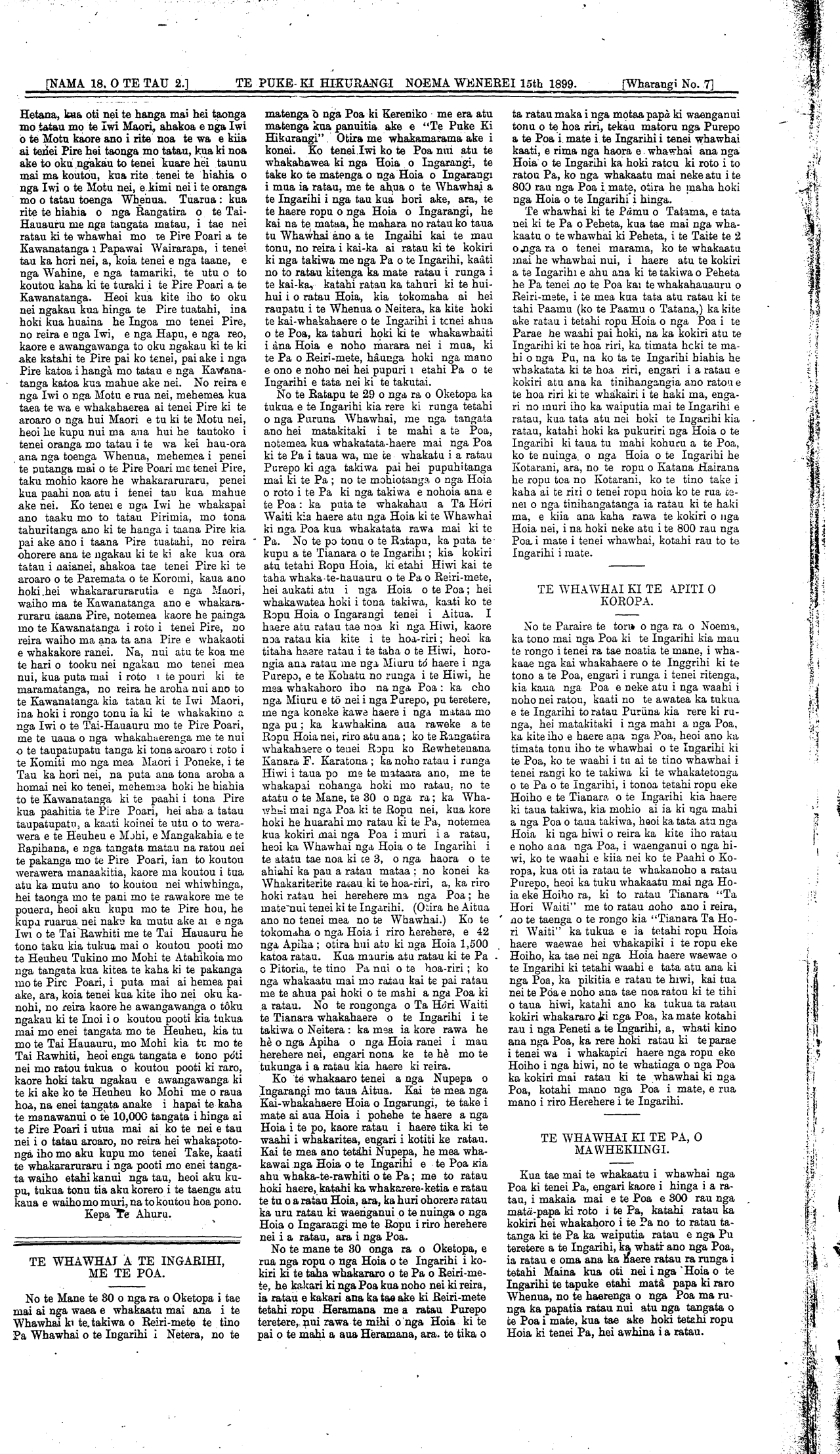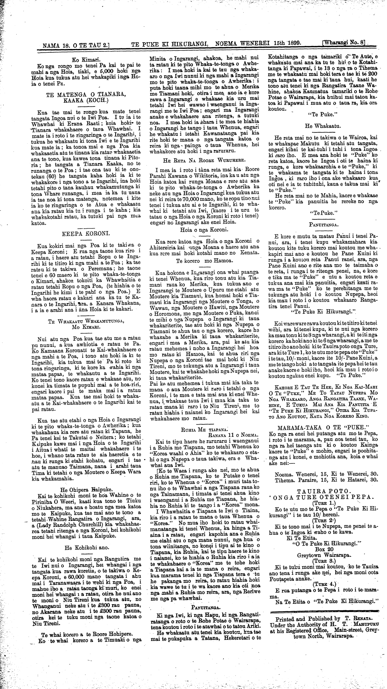 [NAMA. 18, O TE TAU 2.\_\_\_\_TE PUKE KI HIKURANGI, NOEMA WENEREI 15th 1899.[Wharangi No. 2J Matatara waahi o Upokongaro Whanganui Hepetema 18th, 1899. Ki Te Etita o ''Te Puke Ki Hikurangi" e hoa tena koe, ma te tika ma te pono ma te aroha tatau e tiaki i roto i te maru o to tatau Ariki o Ihu Karaiti. E hoa tukua atu e koe enei kupu ruarua hei titiro iho ma oku hoa Wahine i nga pito e wha o to tatau Motu whiti atu ki te Waipounamu, mo tetahi Wahine ko Hera te Upokoiri he Tamahine na Kawana Hunia, Rangatira o Ngati-Apa, he Tamahine na Kuta Tamahine a Maihi Ngapapa, Rangatira o Ngaati-te-Upokoiri ki Heretaunga. Mo tetahi pukapuka i tuhia mai i te tekau-ma-whitu o nga ra o Oketopa i te tau 1898. Penei mai nga kupu:—Kia Moepuke ana nga whariki hei utu mo to piupiu me o poi i riro mai nei i au i te matenga o Taitoko, me mahi mai hoki e koe tetahi piupiu whakairo me tetahi tatua whakairo moku. Heoi ka mahia e ahau nga taonga mo taua Wahine, he mea whakairo katoa, i te mea e whakaotioti ana au i aua taonga, ka tae mai tetahi pukapuka na Raukura Ruahoata, penei mai nga kupu —Kia Moepuke Rangitahua kua tae mai a Hera te Upokoiri ki te ki mai kia tukua atu e ahau he piupiu mona, utua atu ana e ahau ae, kua rite i au te hiahia o te Upokoiri, engari taupuaria mai i nga ra o Hepetema 1899, me tetahi pukapuka i tuhia e ahau i te 21 o nga ra o Akuhata 1899, penei nga kupu :—Kia, Hera te Upokoiri, ka tae atu au i nga ra o Hepetema ki te kawe atu i nga taonga mou i te 30 o Akuhata, ka Waea atu au ki a Hera te Upokoiri ka tae atu au i te tahi o Hepetema, katahi nei maua ka haere i te tahi o Hepetema, i Wurupere ka Waea atu ano maua ki a Hera, i te 7 o nga haora-i te ahiahi ka tae maua ki Hehitingi, to maua taenga atu kua kore i tona kaainga, heoi kararu maua, ao ake i te Rahoroi ka kite maua i a Mohi -te Atahikoia, me Anaru te Wanikau me etahi tangata, katahi maua
