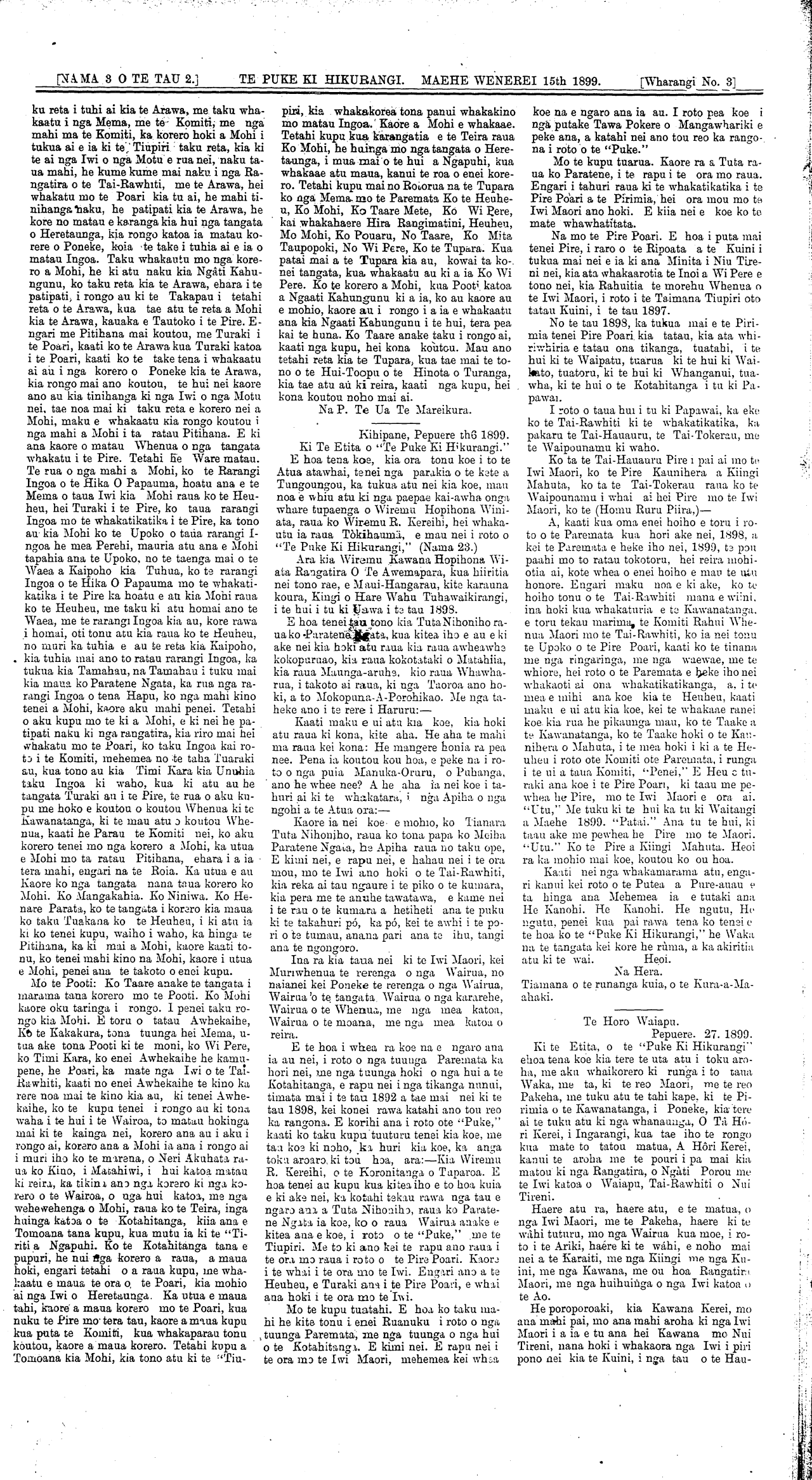 [NAMA 1, O TE TAU 2.]TE PUKE KI HIKURANGI, MAEHE WENEREI 15th 1899. [Wharangi No. 2] Tiriti O Kohimarama Tiriti O Waitangi Aotearoa Tamatea-Mai-Tawhiti Tamatea-Pokaiwhenua Tamatea-Ure-Haea Wairarapa Karaitiana Te Korou Tamawhakakitea R. A. Tuhokairangi Pane Te Uruorangi Koroneho Arona A. W. Tuhua Kingi Ngatuere Pahira Anaru Pahoro Paraone Ropoama Meihana T. Morehu Tuhua Te Otina Te Aroatua Te Arorangi Hohua Ema Anaru Wiramina Ropoama Wata Arama Wirihata Hoani Pohotu Rawinia Hamuera Apikara Hamuera Metapere Ngatuere Arete Mahupuku Ateneta Pahira Te Kura W. Mahupuku Momokiingi Te Takou Ani Ratima H. H. Te Miha R. T. Whanganuiatara Heni Piripi Hangahanga-kiterangi Wikitoria E. Te Maari Nikorama Te Mari Ene Niko Te Maari Nati Amorangi Mihi Amorangi Hukinga Kereama Hone Kereama Hori Te Tauria Mere Te Tauria Heemi Paratene Kaki Pera Tui Morehu Kaki Rawhira Mataira Repa Pera Tui Henare Mokai Rotia Paratene Ngakooti Matenga Hera Tutu Pane Tunuiarangi Terina Purakau Tutu Te Whaiti E. P. Te Maari Ihaka Kuaha Rawinia Meihana Taukuta Raharuhi Pani Te Ata Tuhokairangi Hera Karauria Kahu Tutura Rina Ihakara Ihaka Whakake Te Iwi Ngaroto Taka Heemi Te Miha Ruiha Te Miha Iraia Te Whaiti Maikara Te Whaiti Whanau Tane Te Maari Whare Ihaka Ehetere Mita Pani Mita Hariata Repa Amiria te Maari Waipatu Tamahau Mahupuku Timi Kara