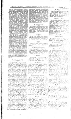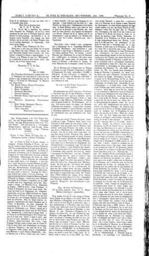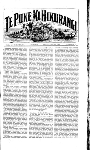 • [NAMA 7. O TE TAU 2.]TE PUKE KI HIKURANGI. MEI WENEREI 31st 1899.\_\_\_\_\_\_[Wharangi No. 4] tukua e Pariora nga Moutere o Piripaina, kia Marikena no te rongonga o Akuingaro kua riro ia Marikena aua Moutere, katahi ia ka tono kia tukua mai e Marikena te inana whakahaere o ratau Moutere kia ratau ano, kaore a, Marikena i whakaae, katahi ka ki atu a Akuingaro, he aha te painga o to ma- tau kaha ki te pana i te muna o te Paniora, ka eke mai ano he inana ke ki runga io matau, ka, whakatutia tonutia iho tona Ka- wanatanga, hei arai atu i te mana o Marikena. Ka timata i konei te whawhai, e mahi mai nei i Piripaina, i waenganui i a Marike- na me nga Piripino, kua maha nga marama e whawhai ana, kaore ano taua Iwi i hinga, ko nga hoia a Marikena kai reira e 40,000 no tenei wiki ka tukua atu e Marikena 13,000 hoia, hei apiti atu ki nga hoia e 40,000 ka hui ka 53,000 i te timatanga mai o te whawhai tae noa mai ki tenei marama, kua neke atu i te ono te kau miriona moni a Marikena kua pau, kaati kaore ano kia tata te mutu te whawhai, kai te kaha tonu nga Piripino, e ki ana hoki Akuingaro e kore ia e mutu te whawhai, a kia tae ra ano ki tona mutunga ko te Ture a Akuingaro mo ana Tianara, me ana hoia ki te puta he ngakau mataka ia ana Tianara, ki te puta ranei he kupu mana Tianara kia mutu te whawhai, me haere ki raro i te mana o Marikena, ka whakamatea kaore ia e pai kia noho he ta- ngata ngakau mataku i roto i te Iwi, kua ki katoa nga Nupepa o te Ao nei, tae noa ki Marikena, i te whakamiharo ki tenei tangata toa kua tapa e nga lwi Pakeha tona Ingoa ko Naporiana, tuarua, ko te tangata nei he tangata iti mama noa iho ki te titiro atu, he Tamariki tonu ka 28 ona tau, no te timata- nga o tenei wiki ku tae mai te Waea whaka- atu i tono atu a Paniora, kia tukua nga herehere a Paniora kai a Akuingaro e pupuri ana, ka utua atu o Paniora nga moni kotahi miriona Tara, ka utua atu e Akuingaro kia homai ra no e Paniora, kia ono miriona Tara ka tukua atu ai e iti nga herehere o Paniora, i akona te tangata nei ki nga reo katoa, i a ia o noho ana i te Kuru Pirihi Katorika, he nai nga korero mo te tangata nei, kaore e taea te tuhi atu. Te taenga o to Kawana ki Rarotonga.