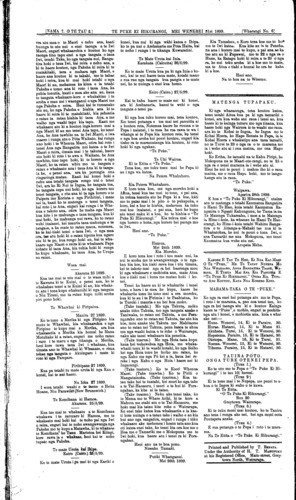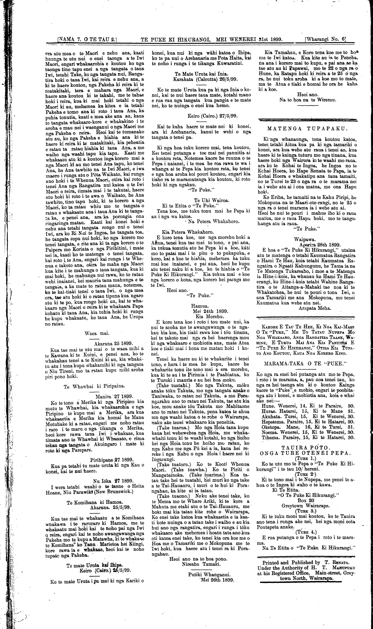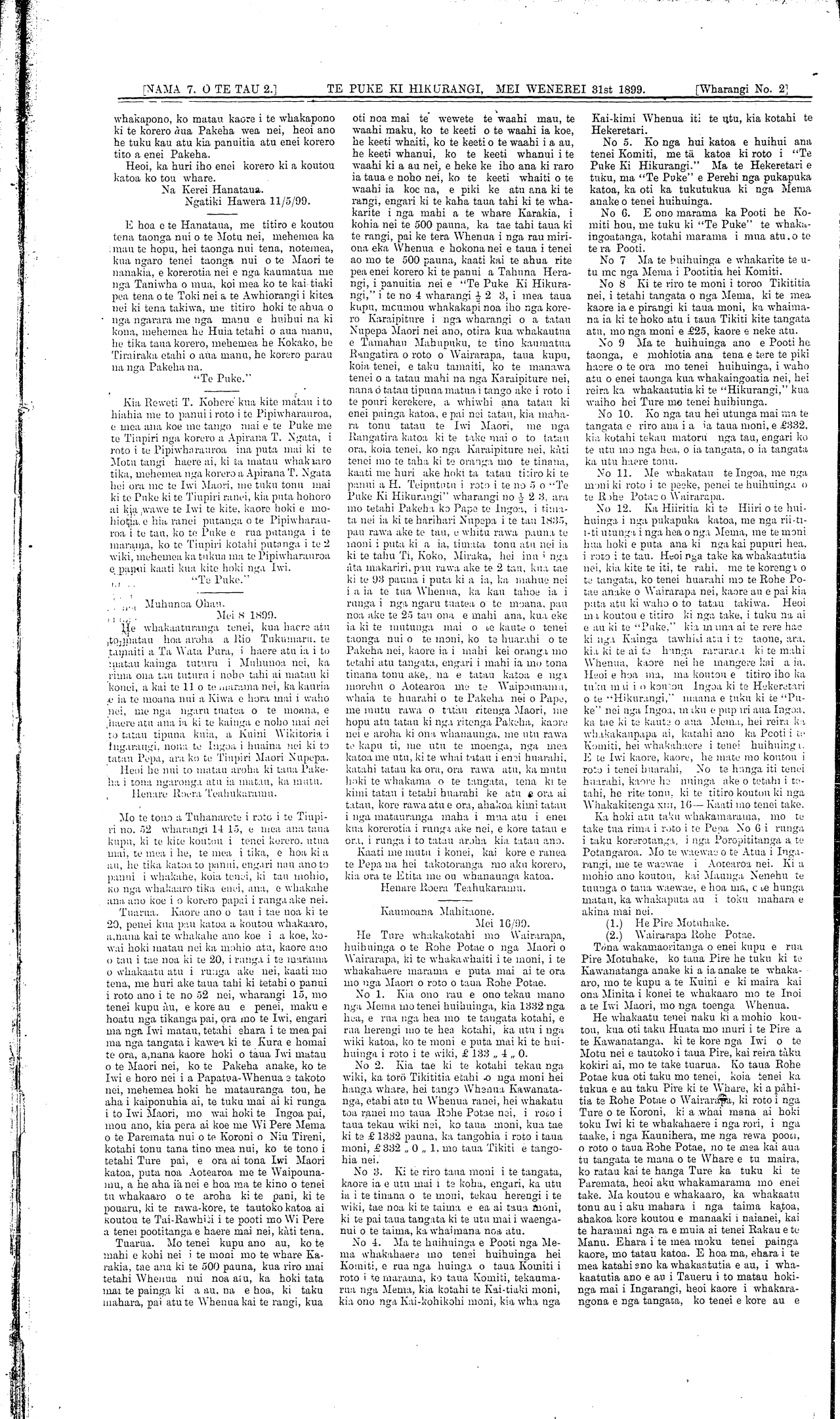 [NAMA 7, O TE TAU 2.]TE PUKE KI HIKURANGI. MEI WENEREI 31st 1899.\_\_\_\_\_\_[Wharangi No. 3] hoha ki te whakaatu i te ora mo toku Iwi i te huarahi tika hoki. Heoi Na to koutou hoa. Na T. T T. Te Tau. P S. No te 26 o Aperira, ka whanau taku Tamaiti he Wahine, ite te 11 o tenei marama ka tae mai te Pirimia raua ko tana Kotiro ki toku kainga, ka Iriiritia e ia te Ingoa o taua Tamaiti, hei Ingoa mo tana Kotiro, mo te ra hoki o te Kuini Tiupiri, ara, mo to matau haerenga ki Ingarangi, koia tenei taua Ingoa. Ko Meri Tuari Wikitoria Te Tan. Heoi ano, e aku hoa koi hoha, ko te kaute o nga Maori kai toku Whare, ara, matau ko aku Tamariki kotahi tekau matau, me tuku katoa i naianei te kaute o nga tangata, o ia Whare, o ia Whare, ki roto i te "Hikurangi" ki a mohiotia ai kai te piki haere ranei nga Maori, kai te hoki haere ranei. Heoi. Taiawhio T. T. Te Tau. Hamua. Mei 19 1899. Kia Tamahau Muhupuku, e tama tena koe. E whakaatu atu ana ahau ki a koe mo nga Ingoa o nga tangata hei tukunga mai mo te Pepa o "Te Puke Ki Hikurangi" ki Hamua nei, koia tenei. Ko Haora Tatere, Hamua Poutapeta. " Heremaia Maika, ... " Hona Tutemiha, ... " Hakaraia Haratiere, ... " Painetu Ngatata, ... " Hetariki Matae, Ngawapurua Wurupe- re Poutapeta. Hamuera, Karaitiana, Horowhenua Rewini. " Mohi Ihaka, Raupanui Hamua. " Himiona Wirihana, Heoi, tena koe. Hamuera Tangatakino.
