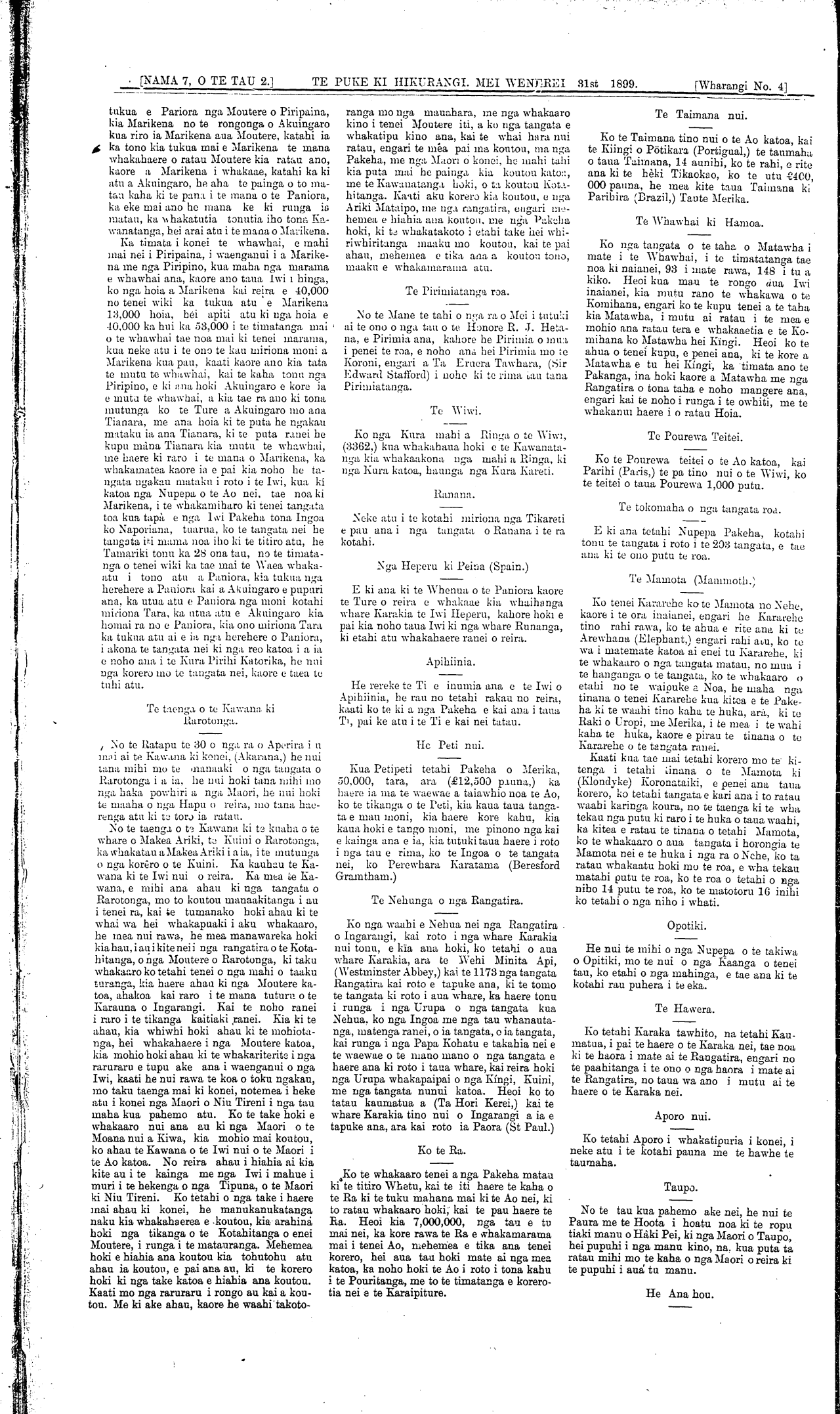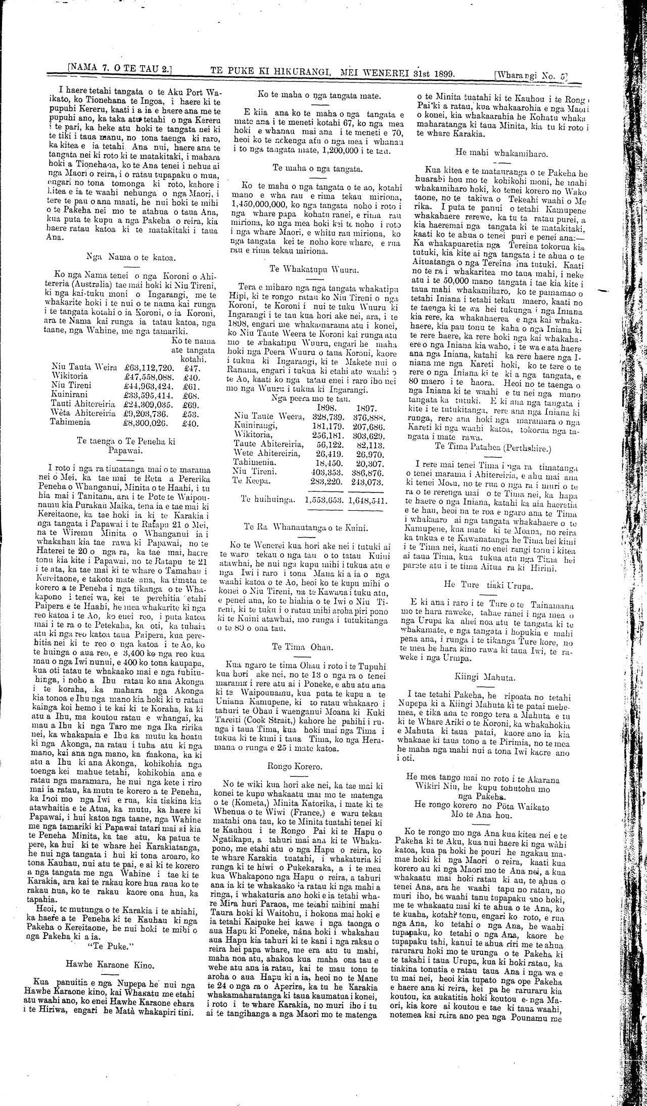 [NAMA 7. O TE TAU 2.]TE PUKE KI HIKURANGI, MEI WENEREI 31st 1899.\_\_\_\_\_[Wharangi No. 5] haere tetahi tangata o te Aku Port Wa- kato, ko Tionehana te Ingoa, i haere ki te pupuhi Kereru, kaati i a ia e haere ana me te pupuhi ano, ka taka atu tetahi o nga Kereru i te pari, ka heke atu hoki te tangata nei ki te tiki i taua manu, no tona taenga ki raro, ka kitea e ia tetahi. Ana nui, haere ana te tangata nei ki roto ki te matakitaki, i mahara hoki a Tionehana, ko te Ana tenei i nehua ai nga Maori o reira, i o ratau tupapaku o mua, engari no tona tomonga ki roto, kahore i kitea e ia te waahi nehunga o nga Maori, i tere te pau o ana maati, he nui hoki te mihi o te Pakeha nei mo te atahua o tana Ana, kua puta te kupu a nga Pakeka o reira, kia haere ratau katoa ki te matakitaki i taua Ana. Nga Nama o te katoa. Ko nga Nama tenei o nga Koroni o Ahi- tereiria (Australia) tae mai hoki ki Niu Tireni, ki nga kai-tuku moni o Ingarangi, me te whakarite hoki i te nui o te nama kai runga i te tangata kotahi o ia Koroni, o ia Koroni, ara te Nama kai runga ia tatau katoa, nga taane, nga Wahine, me nga tamariki. Ko te nama ate tangata kotahi. Niu Tauta Weira Ł'6:3,112,720. Ł47. WikitoriaŁ47,558,088. Ł40. Niu TireniŁ44,963,424. ŁG1. KuiniraniŁ33,595,414. Ł68. Tauti Ahitereiria Ł24,309,035. Ł69. Weta Ahitereiria Ł9,208,736. Ł53. TahimeniaŁ8,800,020. Ł40.