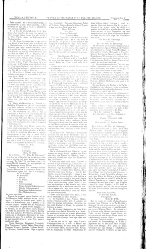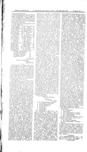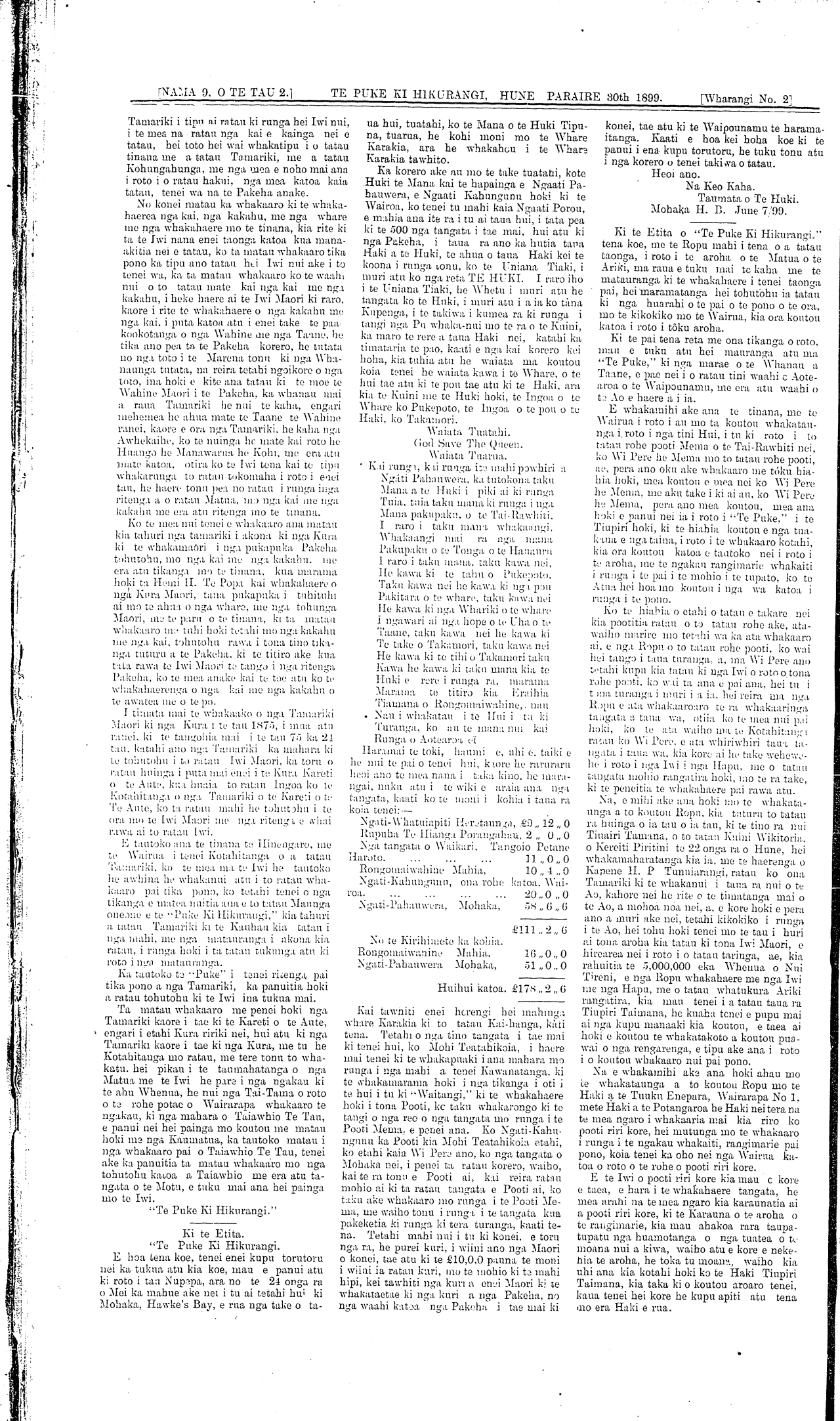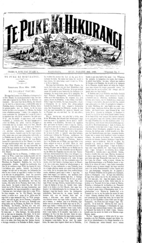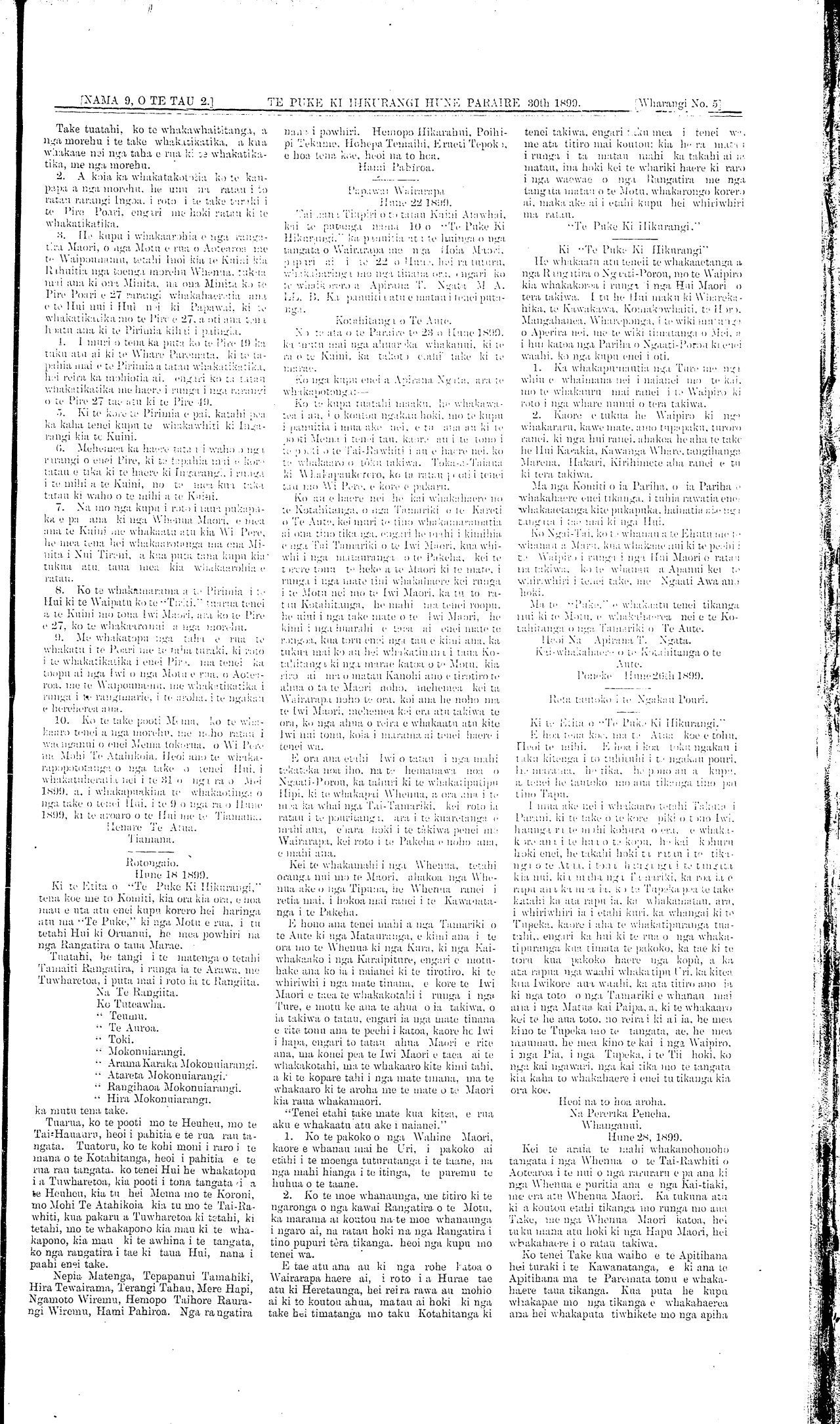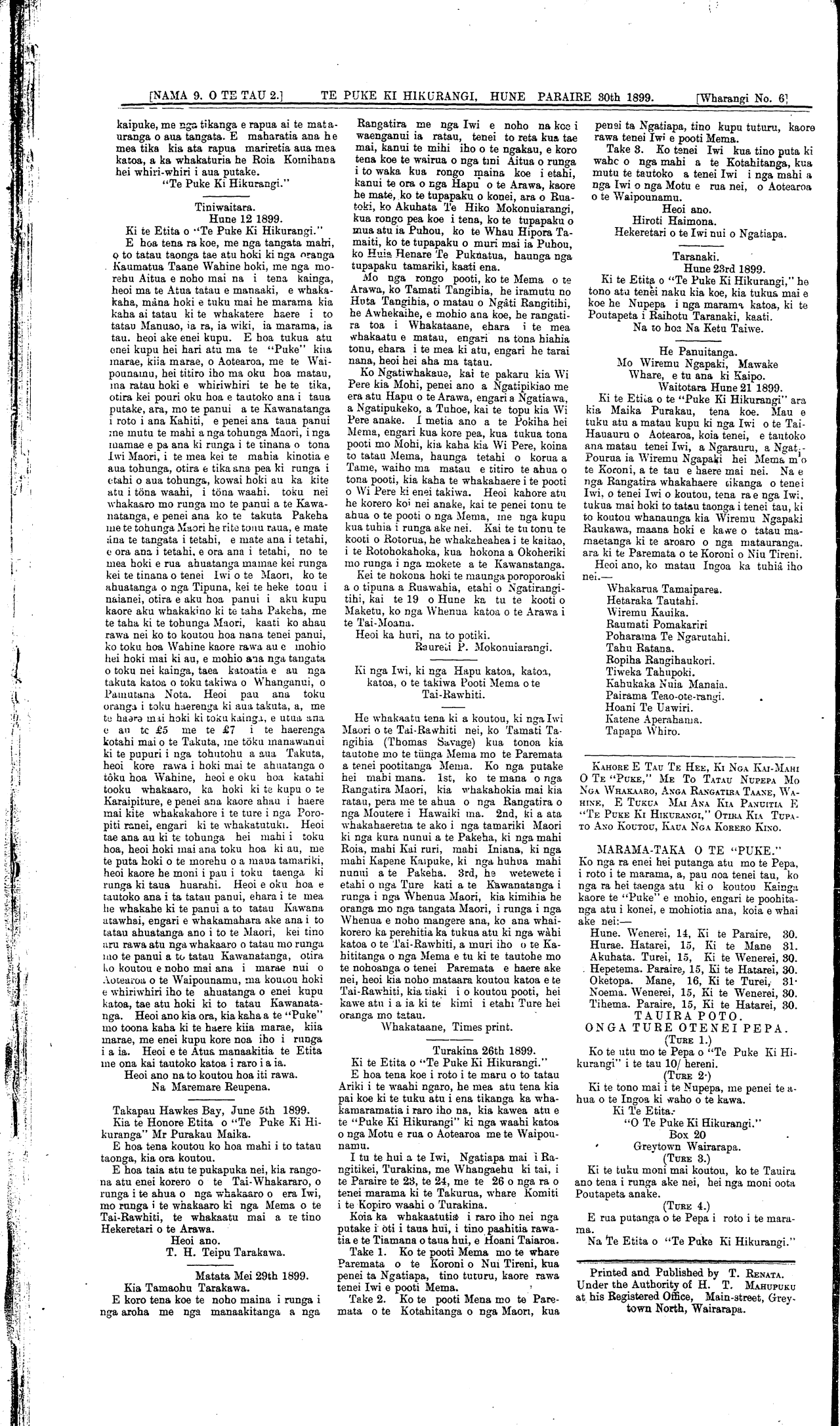 [NAMA 9. O TE TAU 2.]TE PUKE KI HIKURANGI, HUNE PARAIRE 30th 1899.\_\_\_\_[Wharangi No. 6 KAHORE E TAU TE HEE, KI NGA KAI-MAHI O TE "PUKE," ME To TATAU NUPEPA Mo NOA WHAKAARO, ANGA RANGATIRA. TAANE, WA- HINE, E TUKUA MAI ANA KIA PANUITIA E "TE PUKE KI HIKURANGI," OTIRA KIA TUPA- TO ANO KOUTOU, KAUA NGA KORERO KINO. MARAMA-TAKA O TE "PUKE." Ko nga ra enei hei putanga atu mo te Pepa, i roto i te marama, a, pau noa tenei tau, ko nga ra hei taenga atu ki o koutou Kainga kaore te "Puke" e mohio, engari te poohita- nga atu i konei, e mohiotia ana, koia e whai ake nei:— Hune. Wenerei, 14, Ki te Paraire, 30. Hurae. Hatarei, 15, Ki te Mane 31. Akuhata. Turei, 15, Ki te Wenerei, 30. Hepetema. Paraire., 15, Ki te Hatarei, 30. Oketopa. Mane, 16, Ki te Turei, 31- Noema. Wenerei, 15, Ki te Wenerei, 30. Tihema. Paraire, 15, Ki te Hatarei, 30. TAUIRA POTO. ONGA TURE OTENEI PEPA. (TURE 1.) Ko te utu mo te Pepa o "Te Puke Ki Hi- kurangi" i te tau 10/ hereni. (TURE 2) Ki te tono mai i te Nupepa, me penei te a- hua o te Ingoa ki waho o te kawa. Ki Te Etita. "O Te Puke Ki Hikurangi." Box 20 'Greytown Wairarapa. (TUKE 3.) Ki te tuku moni mai koutou, ko te Tauira ano tena i runga ake nei, hei nga moni oota Poutapeta anake. (TUKE 4.) E rua putanga o te Pepa i roto i te mara- ma. Na Te Etita o "Te Pake Ki Hikurangi." Printed and Published by T. RENATA. Under the Authority of H. T. MAHUPUKU at his Registered Office, Main-street, Grey- town North, Wairarapa.