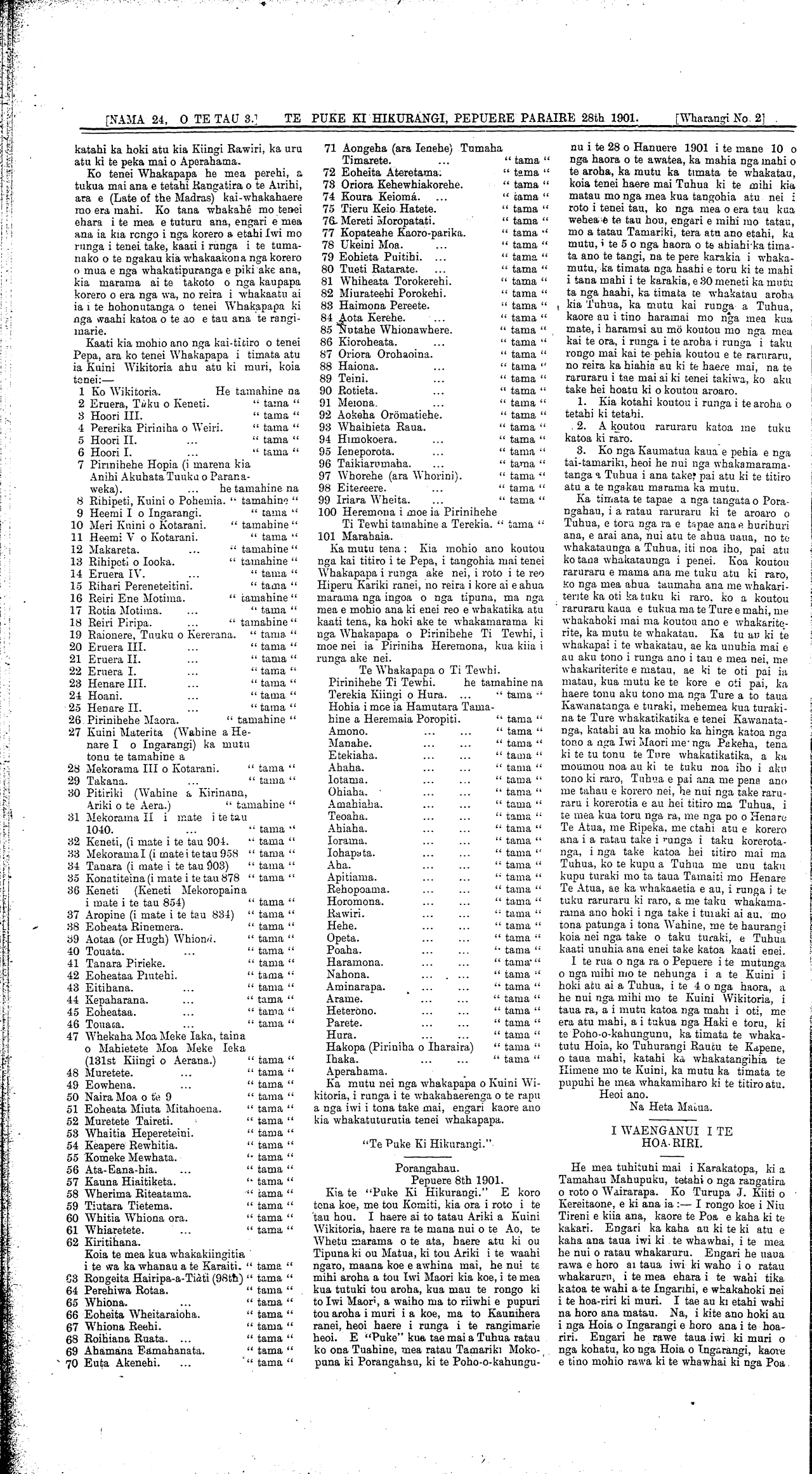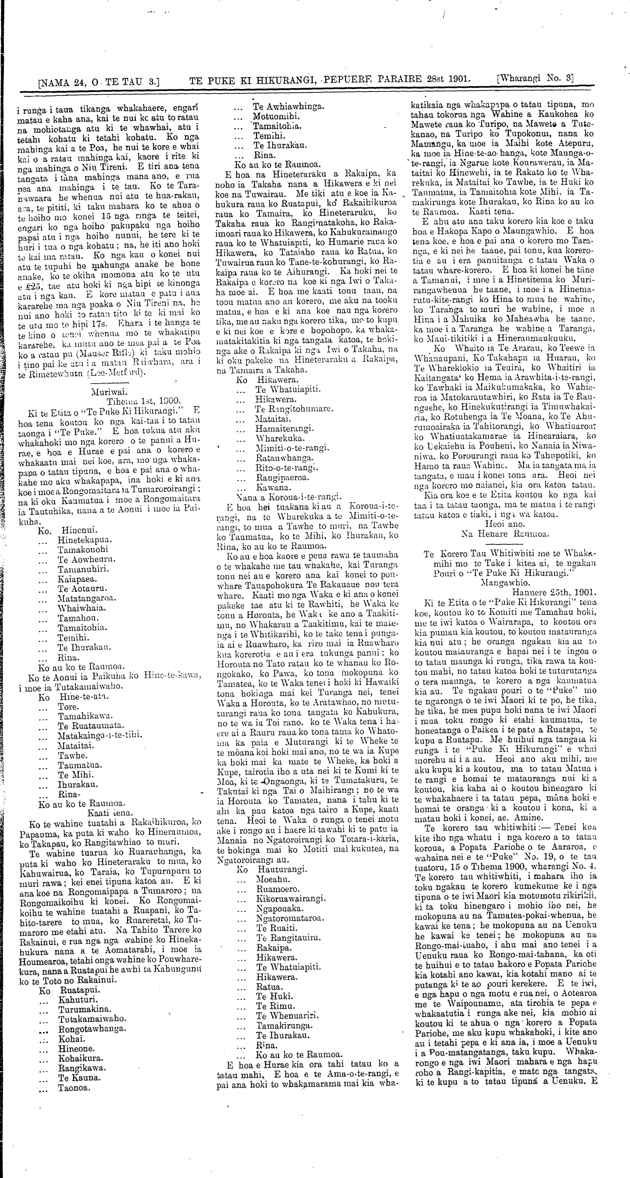 [NAMA 24, O TE TAU 3.] TE PUKE KI HIKURANGI, PEPUERE PARAIRE 28th 1901. [Wharangi No. 2] .