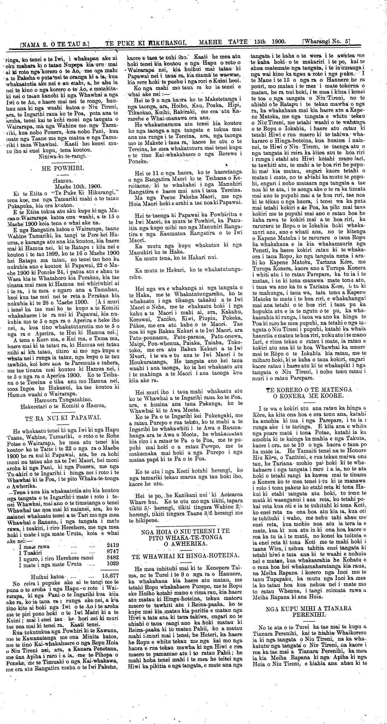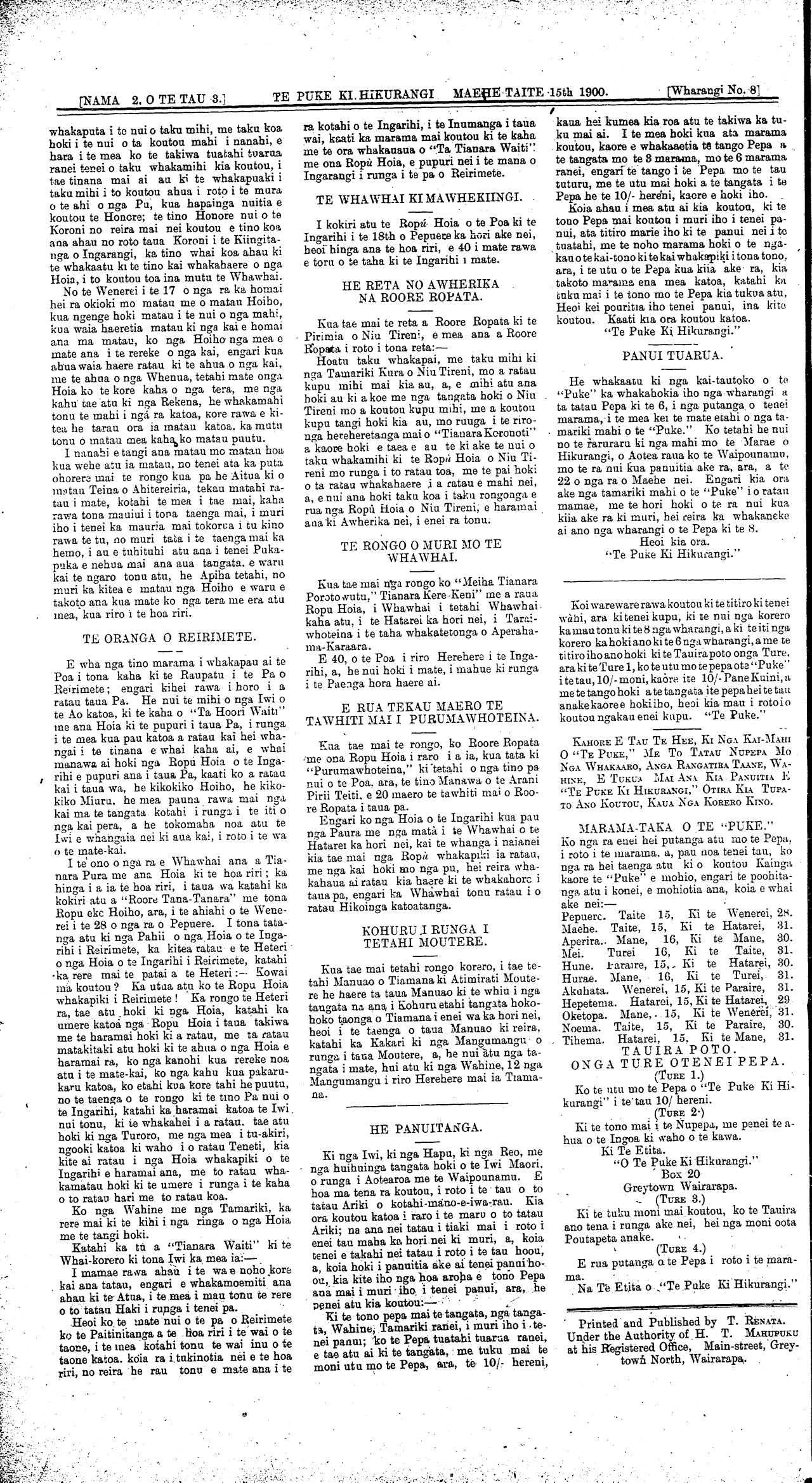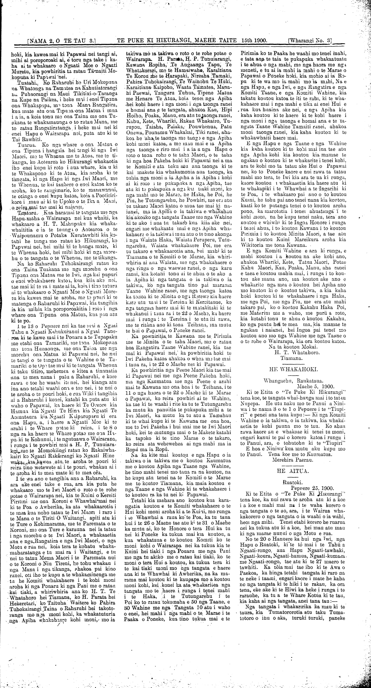 \_\_[NAMA 2, O TE TAU 3.] TE PUKE KI HIKURANGI, MAEHE TAITE 15th 1900. [Wharangi No. 2;