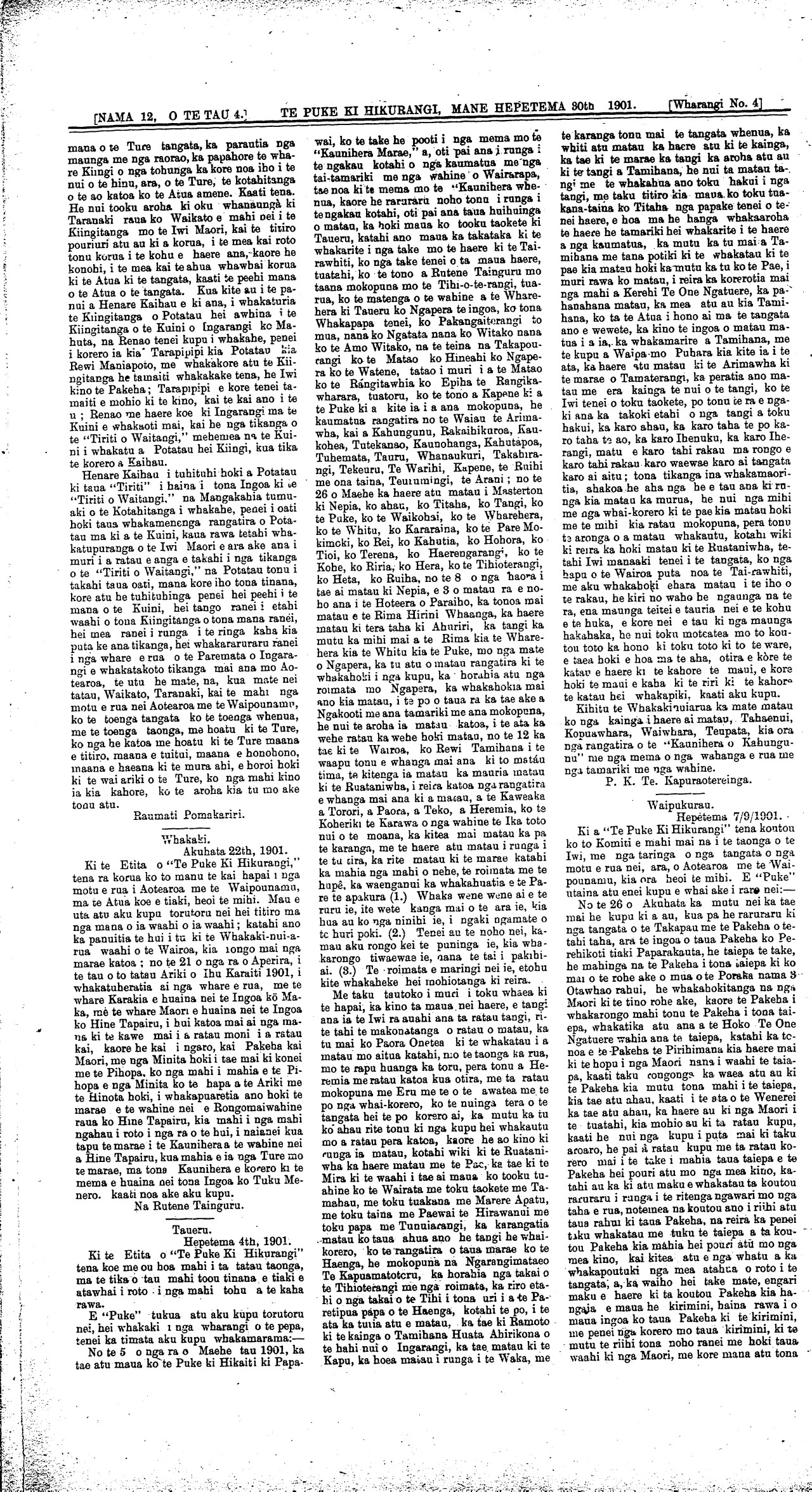 Te Puke Ki Hikurangi 1897-1913: Volume 4, Number 12. 30 September 1901 |