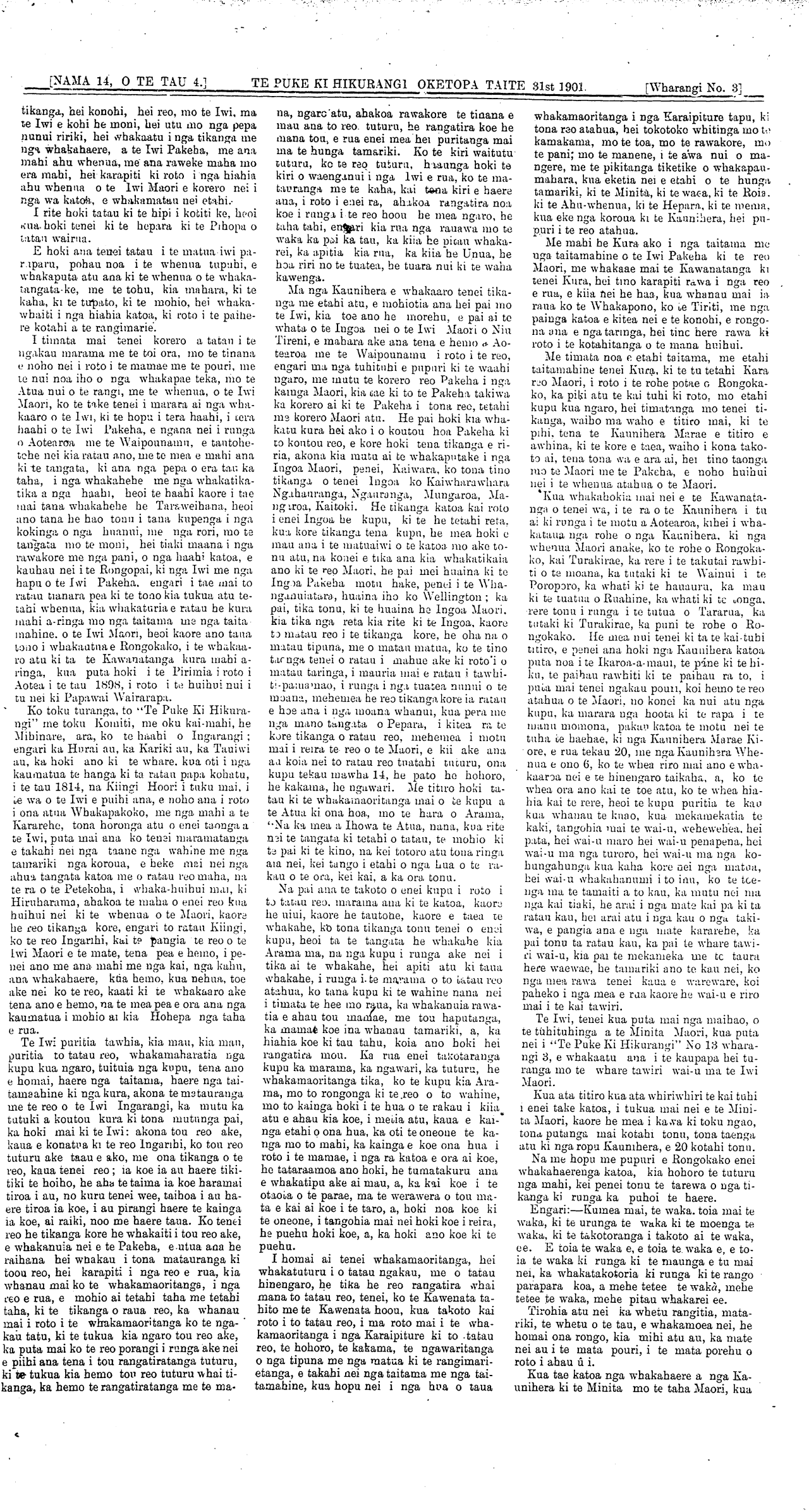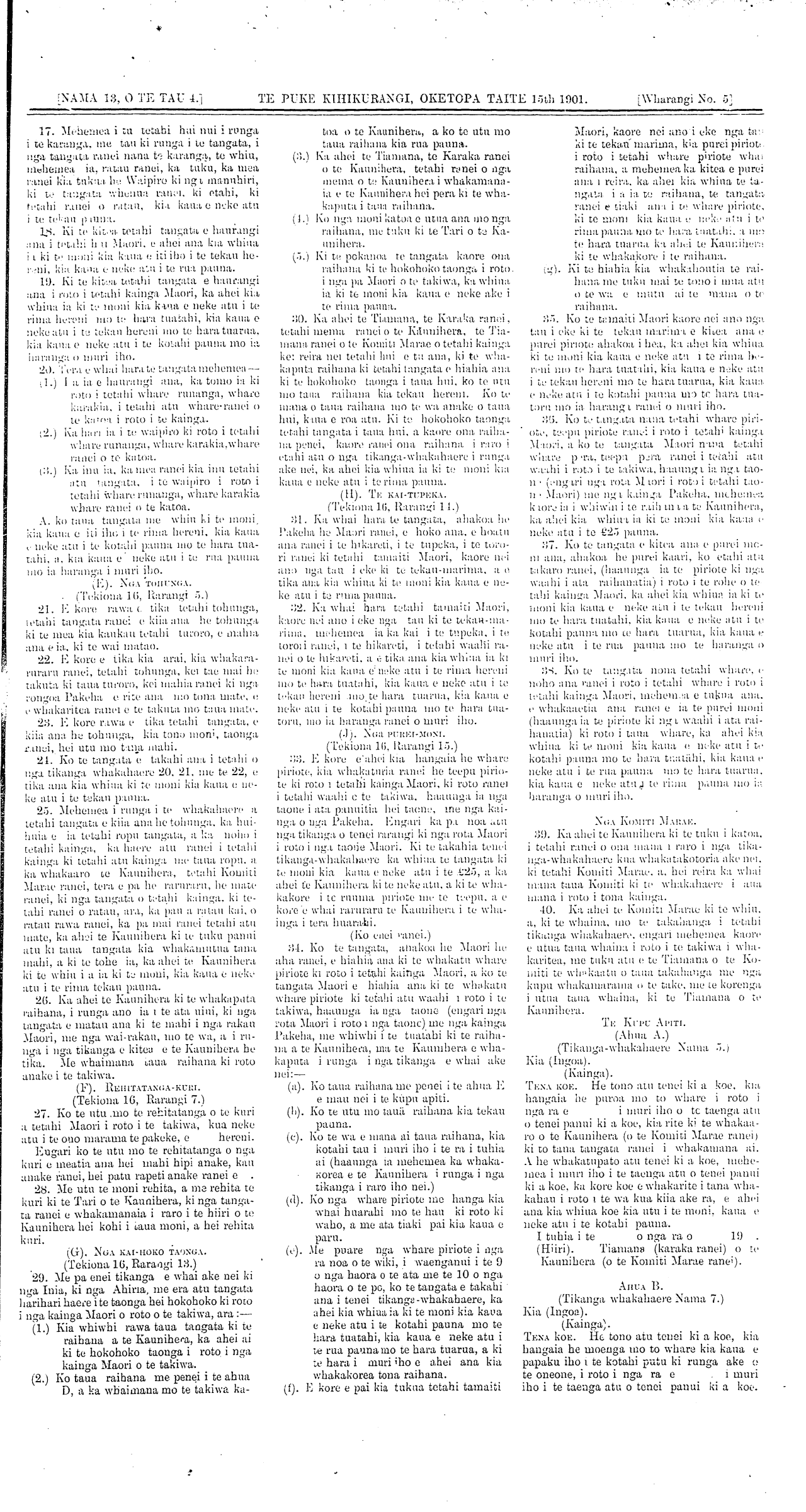 \_[NAMA14, O TE TAU 4.]\_\_\_TE PUKE KI HIKURANGI. TAITE OKETOPA 15th 1901. [Wharangi No. 7] MAUI POMARE M.D. HE TUPAPAKU Ngaati Kauhata Mohi Winiata Hepi Te Wheoro Cambridge Kemureti Waikato Kereama Paoe A. Tahitangata Awahari Tamatea ia Iwi-pupu Kahunguae ia Rongomaiwahine Kahutapere ia Teaorangi Kokakore ia Teaonui Hinetekawa ia Tutakamaiwaho Hineteata ia Makoro Kotore ia Hinemanuhiri Hinehika ia Tutaki Maro ia Tiratahi Tenaoterangi ia Tepurewa Tekauheke ia Hinerangi kuao Koropio ia Hineapa Rawinia Kiki ia Tohea, (no ngapuhi) Mere Kiki ia Wi Tangira Teratuawaru ia Hikihiki Wi Apanui Haruatai ia Hinenepounamu Tutamure, koia nei te kai raupatu i Maungakahia Tutamure Tamaireia ia Teruaheke Tepupuha ia Taiarorua Tamatea-totohanga ia Muia Hinetewaiware ia Tutekohi Tamatami ia Kahukuraao Teruahoro ia Pukaiurenui Tirapare ia Tawhiri Taua-tangihia ia Teranaki Taharakau ia Tuhangatewai Rongomatahunga ia Tehungaiwaho Tirapurua ia Torohina Tehoata ia Tirakino Rongokako ia Tamatea-ariki Hineapa ia Koropio Porourangi ia Hamo Hau Rakaipo Rakaiwetenga ia Wakatotara Tepua-ate-haurangi ia Urumania Tawakeurunga ia Uruwhakirangi Hinekehu ia Tangihiakotea Whaene-moerua Materoa ia Tamaterongo Hinetu ia Rongomaiawhio Rongomai-mihiao ia Tamahuki Tawhiri ia Tirapare Tauatangihia ia Terangikaki Taharakau ia Tuhanga-te-wai Wairoa Turanga Kura-a-mahaki Whanauaki Rongowhakaata Ngaati-porou Hoani Ruru
