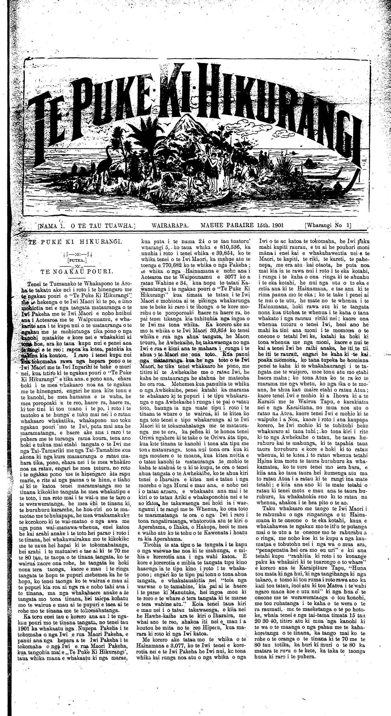 [NAMA.1 O TE TAU TUAWHA.] WAIRARAPA. MAEHE PARAIRE 15th. 1901 [Wharangi No 1]