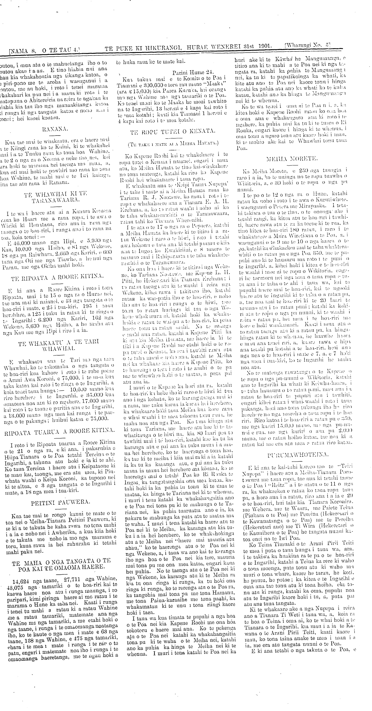 [NAMA 8, O TE TAU 4.]\_\_\_\_\_TE PUKE KI HIKURANGI, HURAE WENEREI 31st 1901. [Wharangi No. 2]