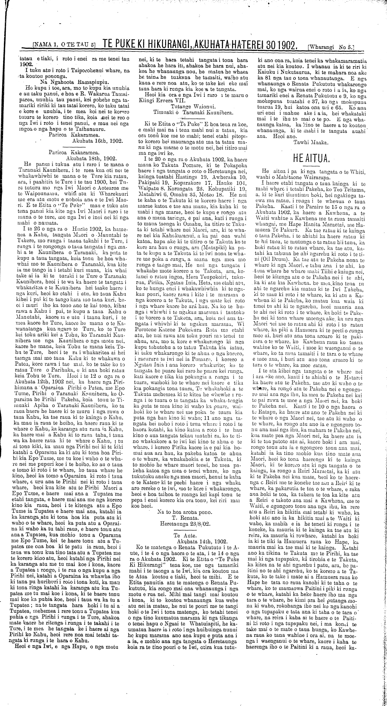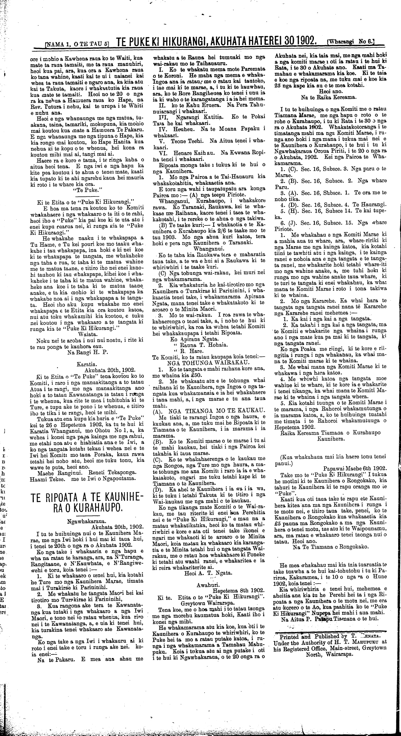 Te Puke Ki Hikurangi 1897-1913: Volume 5, Number 1. 30 August 1902 |