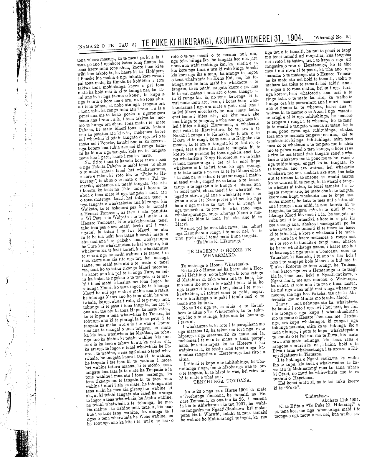 NAMA 22 O TE TAU 5 TE PUKE KI HIKURANGI, AKUHATA WENEREI 31, 1904. Wharangi No. 2