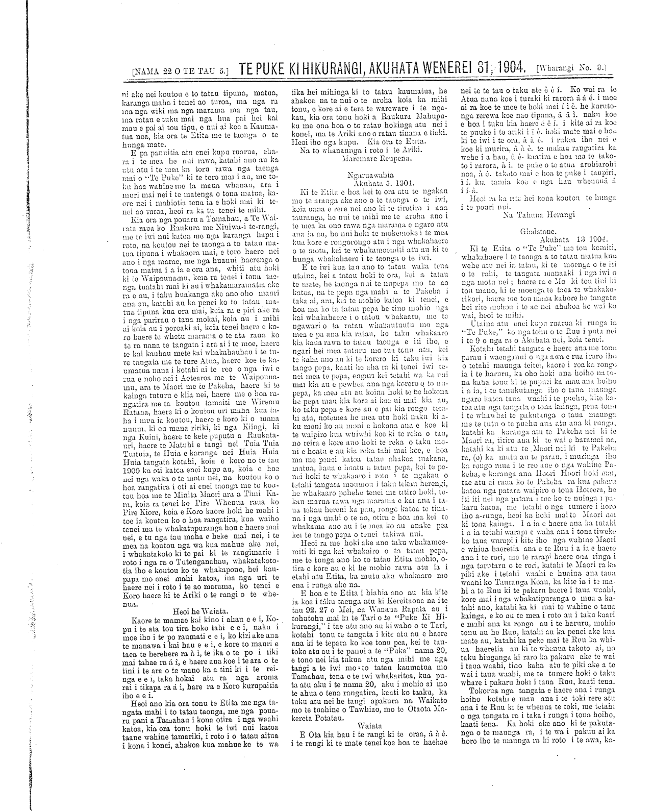 NAMA 22 OTE TAU 5] TE PUKE KI HIKURANGI, AKUHATA WENEREI 31, 1904. Wharangi No. 8