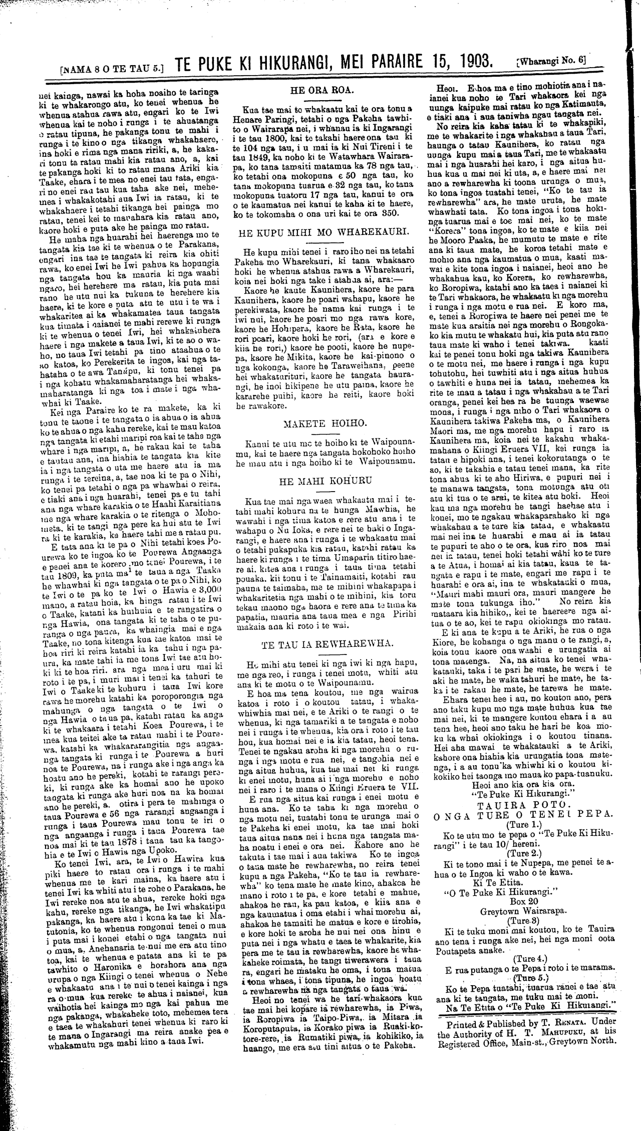 NAMA 8 O TE TAU 5 TE PUKE KI HIKURANGI, MEI PARAIRE 15, 1903. Wharangi No. 6