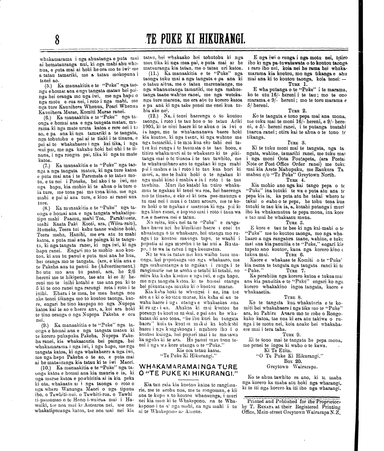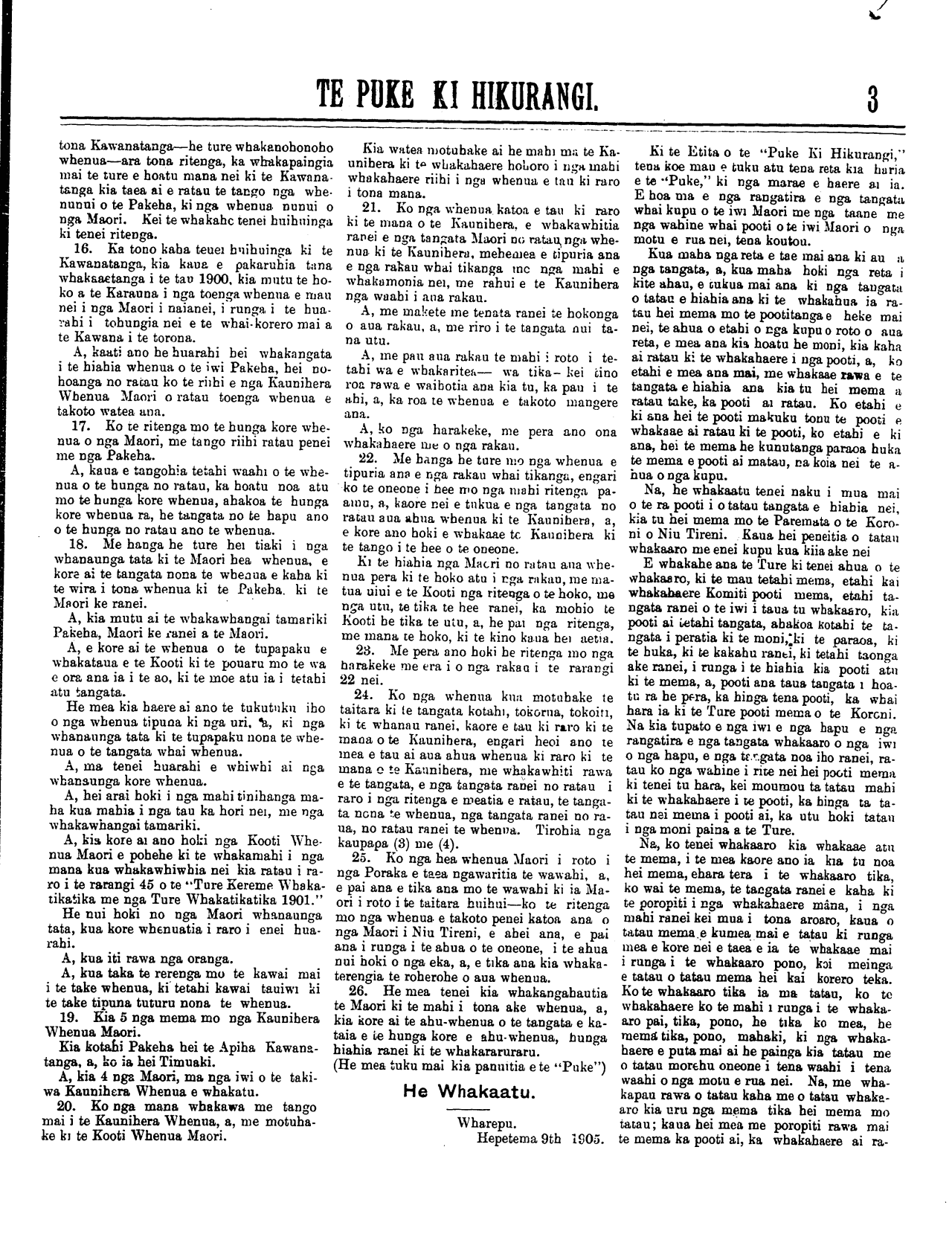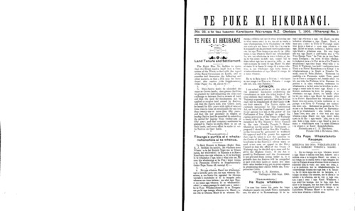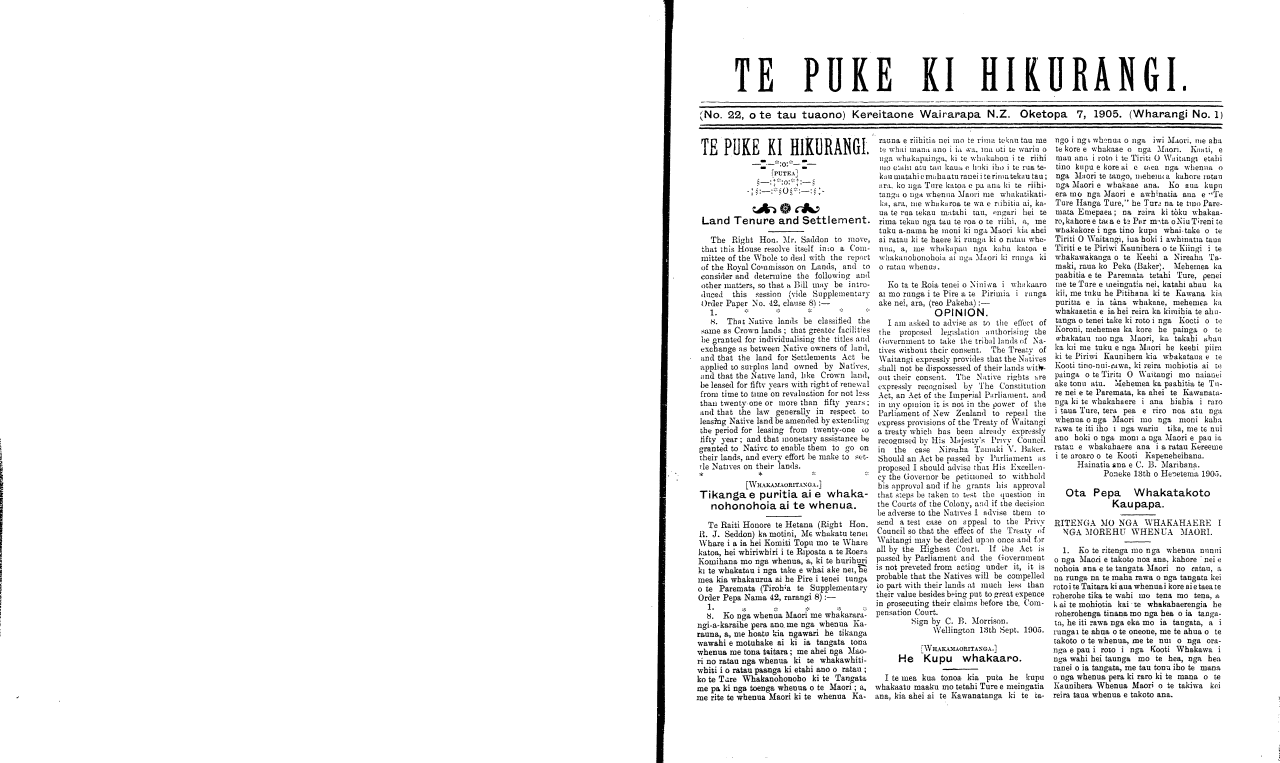 (No. 22, o te tau tuaono) Kereitaone Wairarapa N.Z. Oketopa 7, 1905. (Wharangi No. 1)
