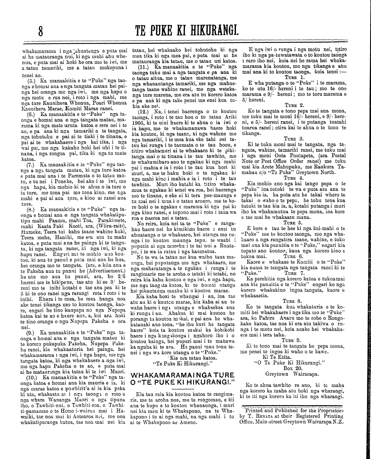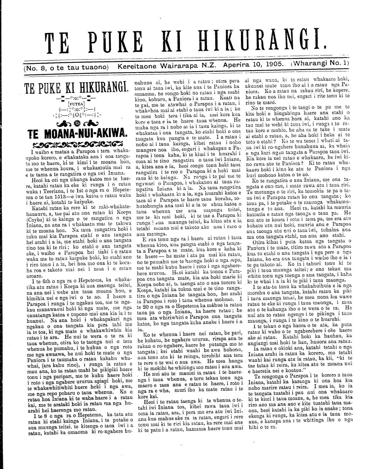 (No. 8, o te tau tuaono) Kereitaone Wairarapa N.Z. Aperira 10, 1905. (Wharangi No. 1)