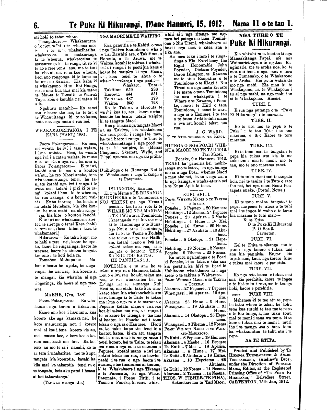 6. Te Puke Ki Hikurangi, Mane Hanueri, 15,1912. Nama 11 o te tau 1.