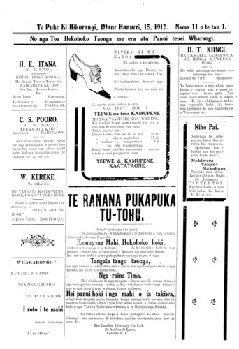 Te Puke Ki Hikurangi, Mane Hanueri, 15,1912. Nama H o te tau 1. No nga Toa Hokohoko Taonga me era atu Panui tenei Wharangi. H. E. ITANA. (H. E. ETON.) KIMIHI HOKO RONGOA HE KIMIHI TINOPAI TENEI KEI WAIRARAPA NEI MO NGA AHUA RONGOA KATOA KEI KUINI TIRITI MAHITAONE Te nama o te WAEA KORERO 31. Te nama o te P.O. Box. 61 C. S. POORO. (C. S. BALL.) TEERA TUI KAHU Kuini tiriti MAHITAONE Kei au nga tino tawhe papai rao nga wahanga e wha o te tau, ka mahia e au nga ahua mahi kahu katoa e hiahiatia ana e te tangata mo te utu iti. W. KEREKE. (W. CRAGG.) HE TANGATA KATIKATI MA- KAWE, HOKO TUPEKA HOKI, Kaore e ngaro tenei haapu i te tauhou ko te "HAAPU KEI TE KOKI." o KUINI TIRITI, MAHITAONE. WHAKARONGO? KA MAHIA E MATOU NGA MEA E HIAHIA- TIA ANA E KOUTOU I roto i te mahi PEREHI PUKAPUKA NA TE "PUKE" TITIRO KI TE KATOA Ta matau e kii atu nei. Aata titiro ki nga Puutu me nga Hu o roto i to matau Toa. Kei maharahara, koianei nga Puutu huatau kua tae mai kei a matau. A, mo te ahua hoki o te utu. NGA PUUTU HOU A TEEWE me tona KAMUPENE MO NGA TAANE ME NGA WAHINE Kei tawhiti te pai o enei mo te utu iti, e rite ana ki nga utu nui. Titiro ki enei na: Puutu taane, tino pai ko te utu 13 9. Puutu taane, whero, mahi hou 17 6 Puutu wahine whero, pango ranei 9 6 Ka piki whakarunga. Kaati, haere mai kia mahia atu e matau tetahi o enei pea puutu mou. TEEWE & KAMUPENE. KAATATAONE. TE RANANA PUKAPUKA TU-TOHU. (Kotahi putanga i te tau.) He pukapuka hei whakahangai i te tuhituhi a nga tangata whai-mahi, ki nga Ingarihi. Kamupene Mahi, Hokohoko hoki, i roto i ia wahanga o te taonga. A, hei tu-tohu hoki ki nga tangata e haere ana ki Ingarangi i Ranana me ona rohe katoa Kei roto ano hoki i tenei pukapuka te rarangi ingoa o nga Tangata tango taonga me nga taonga e tukutukua ana e ratau, me nga taonga makete o nga Koroni, me o era atu motu hoki. Nga raina Tima Hei whakaatu ki nga tangata e haere ana ki runga tima, i nga wahapu hei rerenga mona, a, hei whakaatu hoki i nga taima e rere ai nga tima i tena wahapu, i tena wahapu. Hei panui hoki i nga mahi o ia takiwa, a nga tino tangata mahi, tangata tango taonga hoki, me era atu tu tangata whai-mahi, i roto i nga tino taone nunui, a, i waenganui ano hoki o nga Takiwa Mahi-ahu-whenua, o te Kiingitanga Kotahi. Ka tukua atu he kape o tenei pukapuka ka utua hoki te tukunga atu, mehemea ki te tukua mai he poutapeta oota mo te moni £1. The London Directory Co. Ltd. 25 Abchurch Lane, London E. C. D. T. KIINGI HE TANGATA HANGA WHA- RE, HANGA KAWHENA HOKI. He wahi mahinga tawharau toa, mahinga toa hoki. Porootiwe Tiriti Katataone. Te hono rakau o nga ahua mahi katoa e mahia ana e tenei ta- ngata i roto i te wa poto. Nga ahua mahi whare katoa e mahia ana. He Kai-whakahaere nehua nga tupapaku hoki. Ka haria nga tupapaku ki nga waahi katoa o Wairarapa nei. Niho Pai Mehemea he niho pai ou, haere kia ti- rohia kia rongoatia Mehemea koe e hiahia ana kia pai o niho haere kia: Makiwera Takana Makahana Tangata unu iho. (Kei tawahi o te Maku- ihi Hoteera.) CARTERTON Kei nga Mane o nga wiki katoa ka haere ki