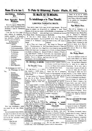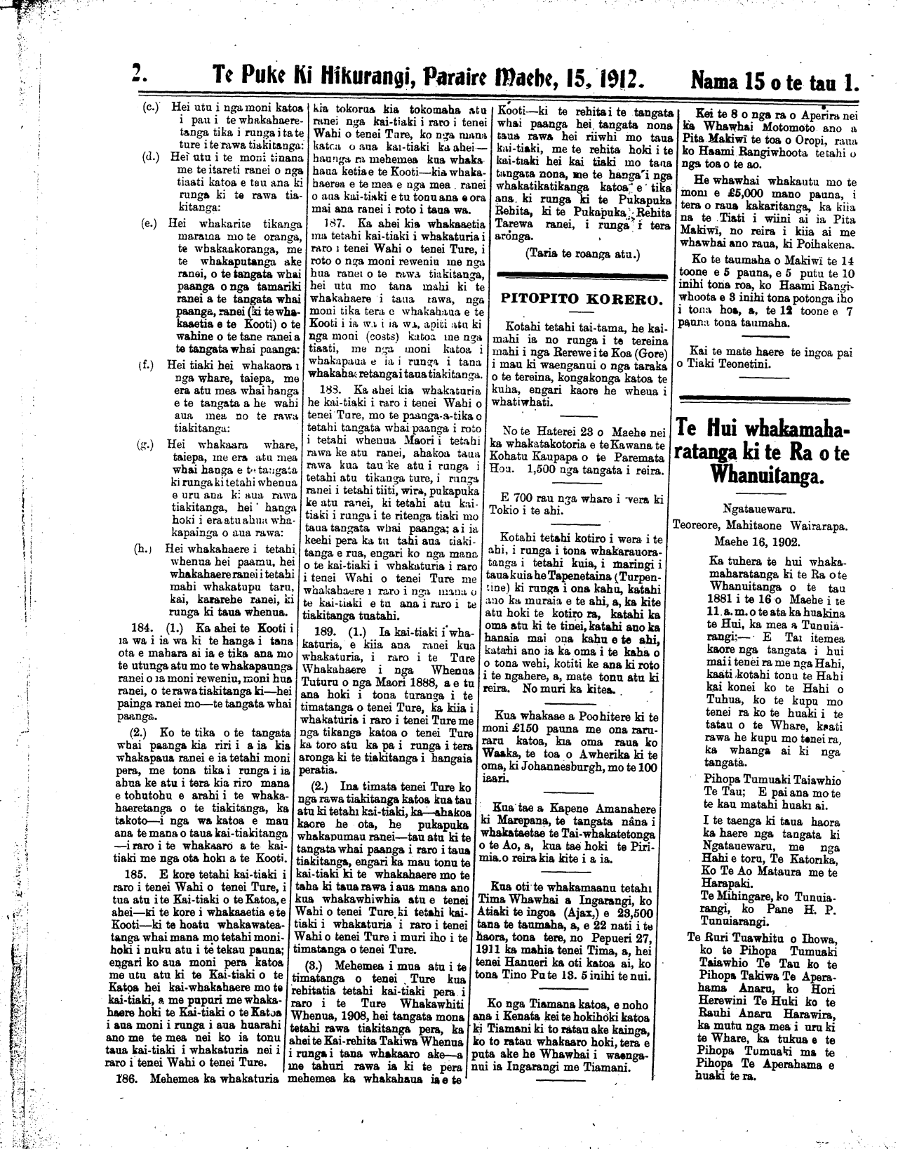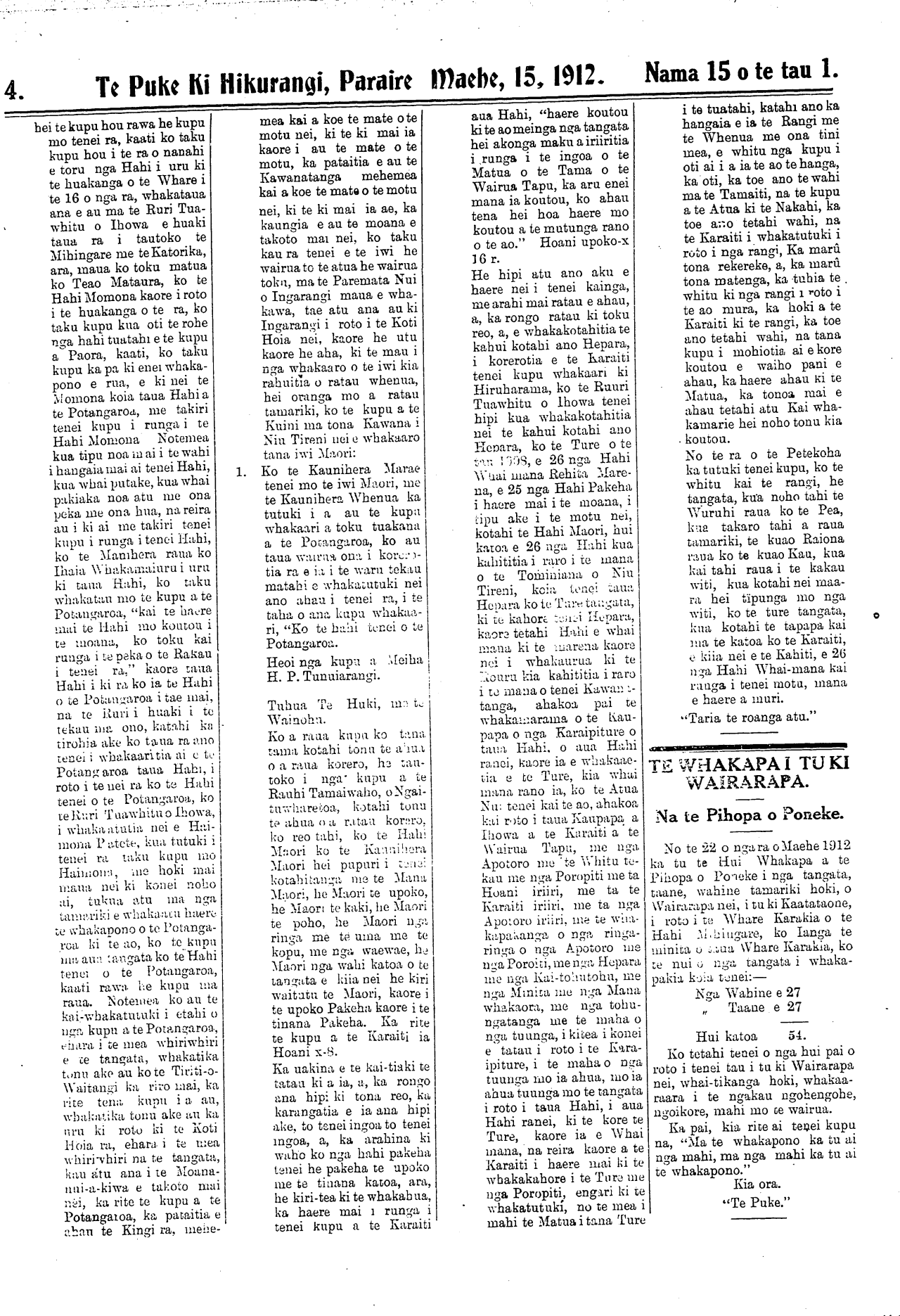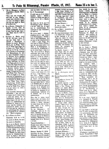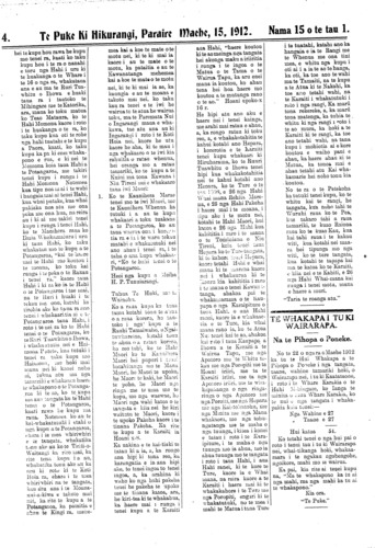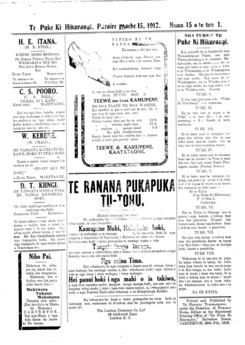 Te Puke Ki Hikurangi, Paraire Maehe, 15,1912. Nama 15 o te tau 1