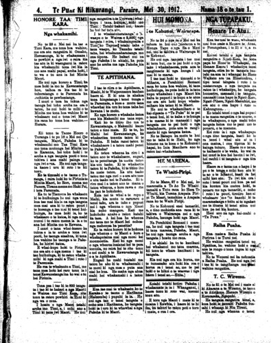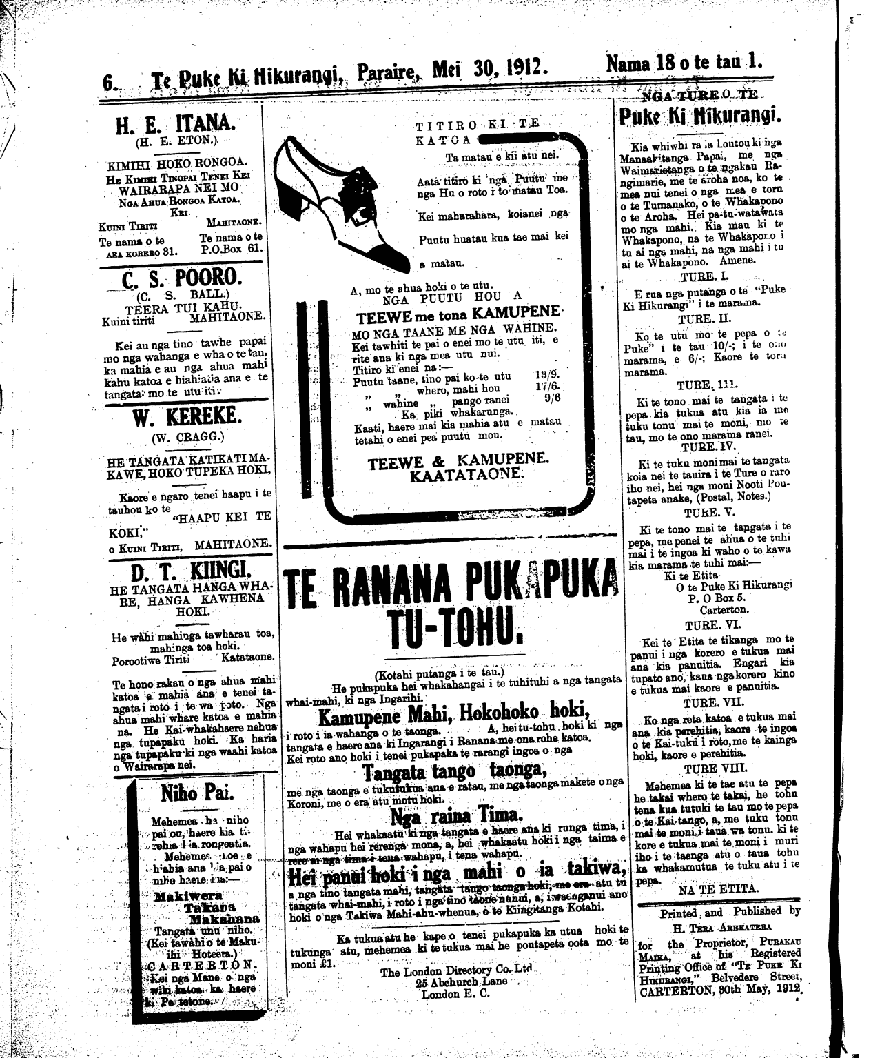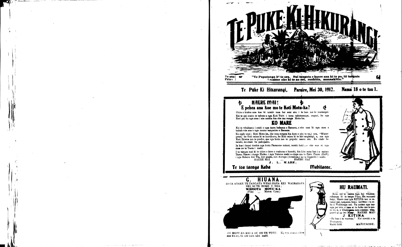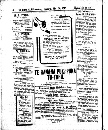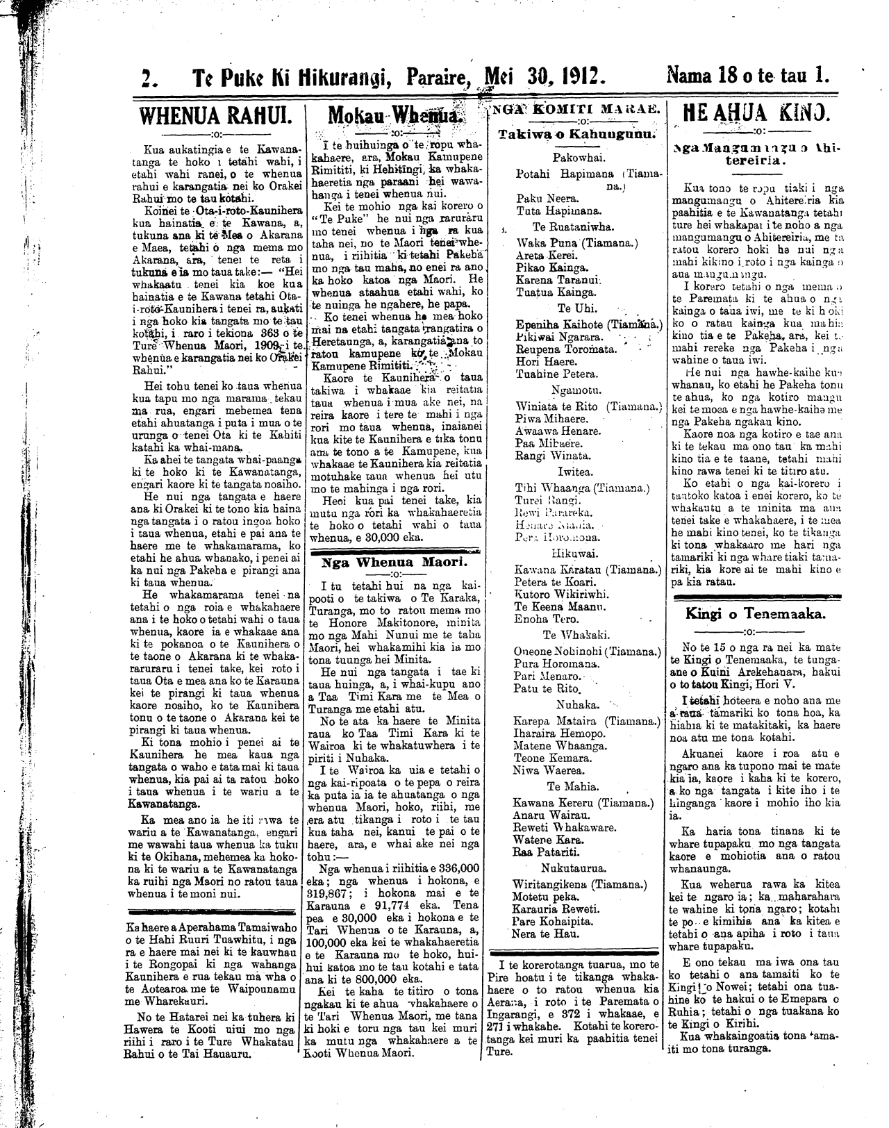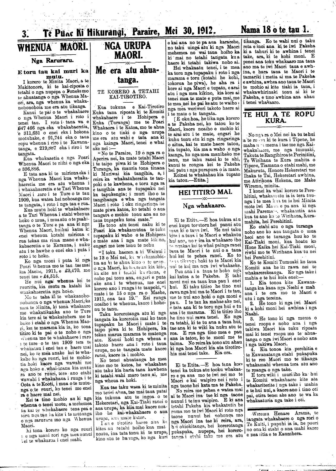 Te Puke Ki Hikurangi, Paraire, Mei 30, 1912.     Nama  18 o te tau 1.