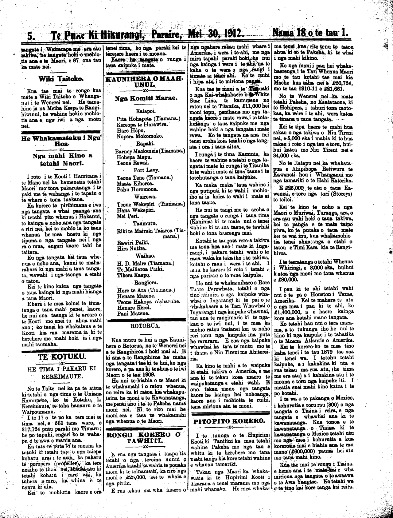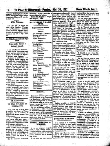 Te Puke ki Hikurangi, Paraire, Mei 30, 1912.   Nama  18 o te tau 1.