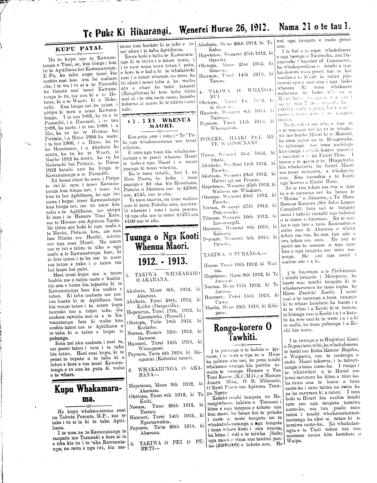 Te Puke Ki Hikurangi, Wenerei Hurae 26, 1912. Nama 21 o te tau 1.