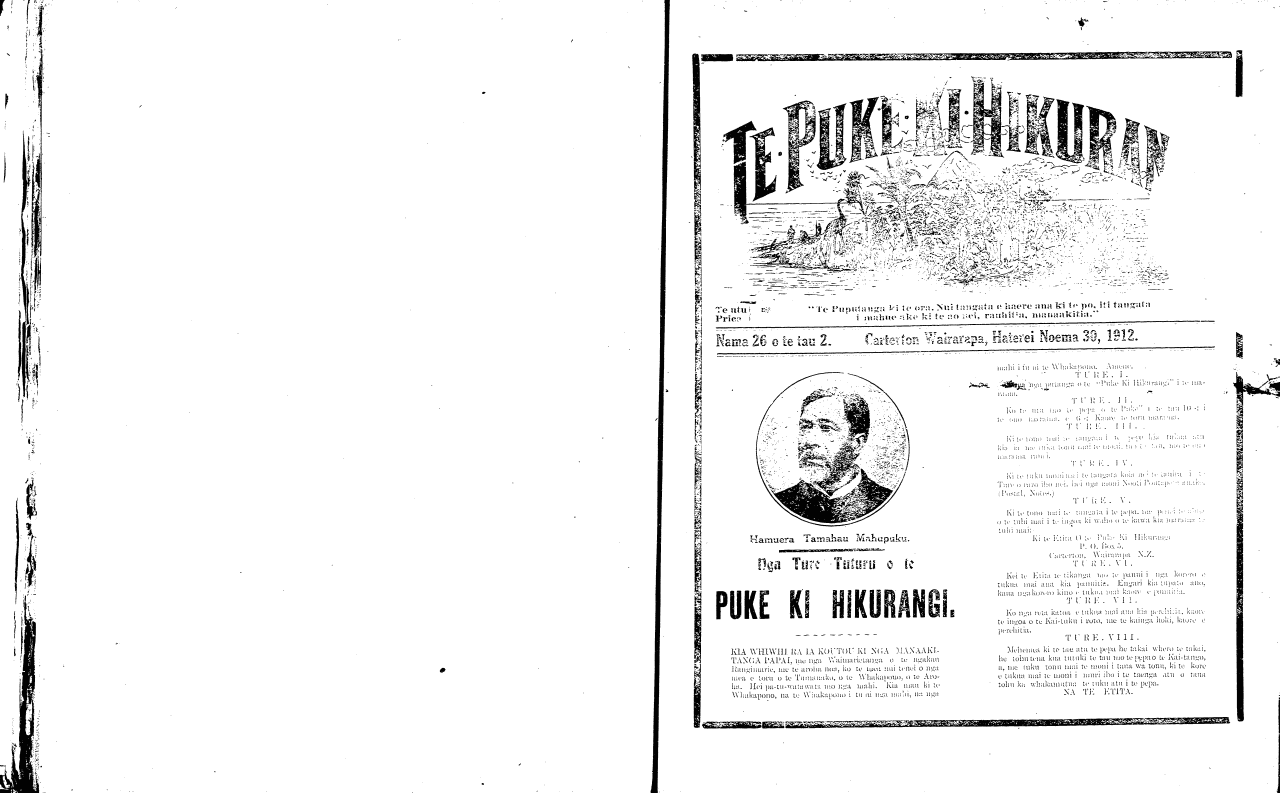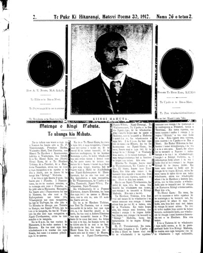 Nama 26 o te tau 2. Te Puke Ki Hikurangi, Haterei, Noema 30, 1912. Ngati-Tuwharetoa, Ngai-Terangi, Ngati-Whiti, Ngati-Kahungunu, ara, ki te tautoko i te kupu a Te Heuheu. Otira i patai a Timi raua ko te Heuheu me haere Maori ranei tatau ki runga ki te mate ra, me haere pakeha ranei, ko te whakautu a nga iwi me haere pakeha, engari ko te manu- ka anake e whakatakoto ki runga i te tupapaku, engari me maemae ano. Heoi nga kupu o tenei po. Ka hiki. I te ata o te rua tekau, i te 11 a.m. ka whakawhiti atu i runga i te paati, ka whiti katoa nga tangata ki tera taha, ko te kaute i tenei wa e whitu rau (700). Ka haere ka kitea atu te whare rae nga haki e rere ana, ka kitea mai hoki e nga tangata mahi i nga pu-repo ka timata te pupuhi, e rima nga pu i te paku- tanga kotahi, e rua tekau nga pakutanga, a ka timata hoki te tangihanga ki te maemae, ka whakatata atu ki te marae ka haere mai te peene me te mahi tonu ano nga pu-repo ara nga (kenana), he hanga whakaaroha, a ka tae mai te peene ki mua nga iwi ka timata te tangi, ko tenei peene ko te peene tona a Mahuta, ka tae ki te kokinga o te rori, e hangai atu ana ki te teneti o te tupapaku, e tu ana nga hoia Maori i nga taha e rua o te rori, i o ratau rae tonu o ratau ringa e whakanui ana ki nga whakaeke, ka haere atu nga manuhiri i waenganui i nga hoia ka tae ki te timatanga atu o nga kai-pohiri, e wha mano i tetahi taha o te rori e wha mano i tetahi taha o nga kai-pohiri tae noa ki te teneti i takoto ai te tupapaku, me te whakahua ano i ta ratau pohiri. " Toia mai te Waka," ka mutu ta tetahi taha ka riro i tetahi. Ka haere a Matotoru ki te whakatakoto i te Manuka ki runga i te tupapaku, ka hoki mai ka whakahuatia te maemae a te tangihanga Ripiripia, Haehaea; tuakina, Haparangitia te Upoko o te Ngarara kai-tangata Hue-e. Koiana tonu te tangi i roto i te rua haora he maemae anake, a ka tahi ano ka timata ki te tangi, nui atu te tangi o Timi Kara, o te Heuheu Tukino, o Teri Te Paerata, otira o nga rangatira katoa me nga iwi, Ngati-Haua, Maniapoto, Ngati-Tuwhareto, Te Arawa, Ngai-Terangi, Ngati- Mahuta, Ngati Koroki, Taranaki, Whanganui, Ngatiapa, Ngati Kahungunu, Ngatiawa, Te Wai- pounamu, me te Whare Potae, i te taha o te whare o Mahuta e tangi kapo ana, ka roa e tangi ana ka tukua nga taonga, ringinga roimata o nga tangihanga, Ngati Kahungunu ki Heretaunga, Ngati Kahungunu ki Wairarapa, Ngati Tuwharetoa, otira o te maha noatu o nga iwi i whakaheke ki