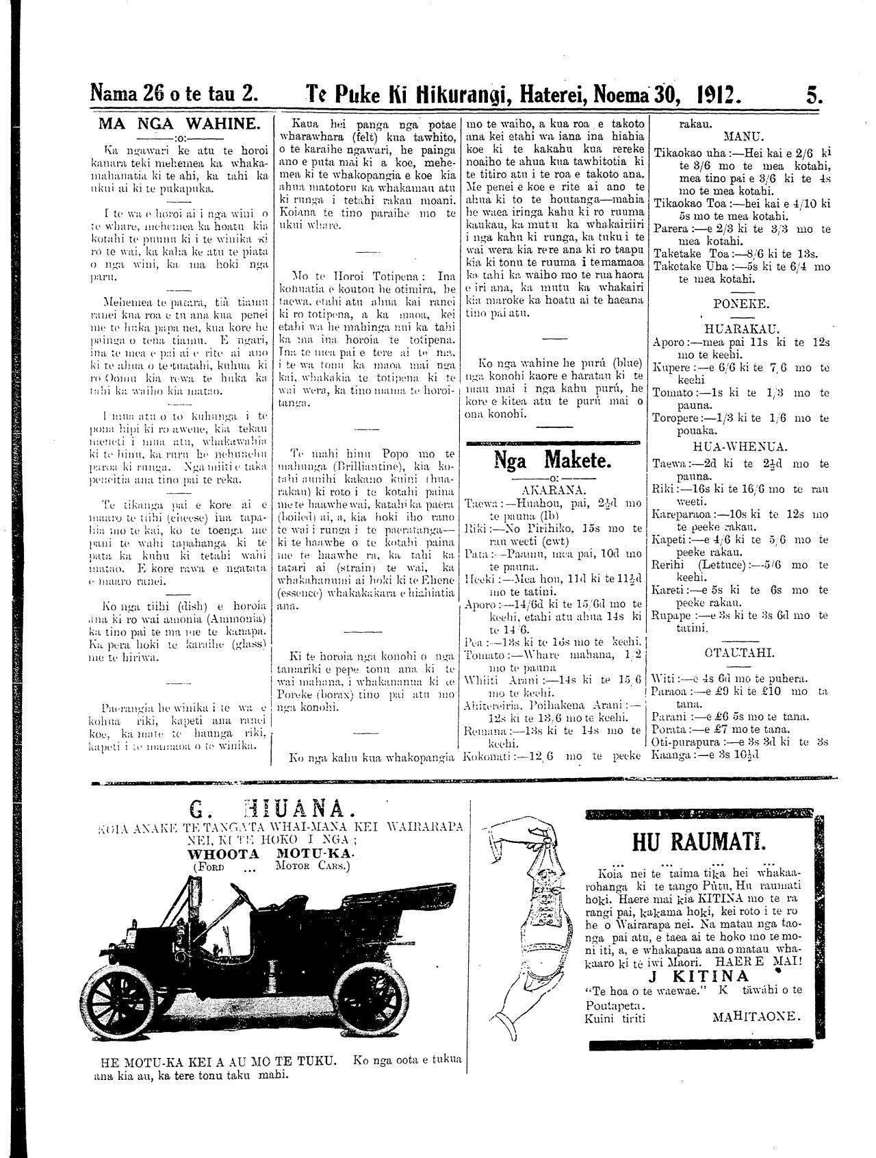 Te Puke Ki Hikurangi, Haterei Noema 30 1912. Nama 26 o te tau 2. HAWITI ME TAOMANA. (SAVAGE & SOWMAN.) Tiriti Nui ... Kaatataone. TE HAAPU iti iho te utu o nga taonga kei Wairarapa nei, mo te mahi Tuuru, Toopa, Iringa whakaahua (framing), Toroa iringa kahu, Teepu tuunga peihana wai, Peeti waea, Teepu- koroihe (covers). Taonga whaka- paipai, ara, kuihini, kaari kirihi- mete, taporena whariki, otira nga ahua taonga katoa mo te whare. Nga utu o nga Toroa e £2 12s 6d a raro. " Toroa iringa kahu £4 5s a raro. HAERE MAI KI TE MATAKI- TAKI. KEI A AU NGA HUTU KAHA, PAI HOKI TE MAHI- NGA, KO NGA UTU E £3 5s. (a raro.) NGA Kaka mo nga haere, ko nga utu e £2 os. a raro. Nga MEA katoa e hiahia ana koutou kei a — Paaka- TINO TOA KAHU, o KAATATAONE nei. H. H. KARANI. (G. H. CULLEN.) (Kereitaone, Wairarapa.) ROIA- Tenei au te tangata tika, matau, pai hoki ki te whakahaere i nga ahuatanga mahi katoa a te Roia. Ko taku Tari kei tawaahi atu o te Whare o te Etita o te Mareikura. Ka taea e au nga mahi Maori katoa, e hangai ana ki te Ture Mahi "Riihi, Hoko, Mokete Paara moni. He moni kei au mo te tuku i runga i nga Taitara motu- hake. E hoa ma kana hei whakarea i o koutou hiahia me a koutou TAKE. He whakamaharatanga tenei naaku na Makiwera Takana Ma kahana, tangata unu niho o Kaatataone, kei te tuhera tonu taku whare. Haere mai.