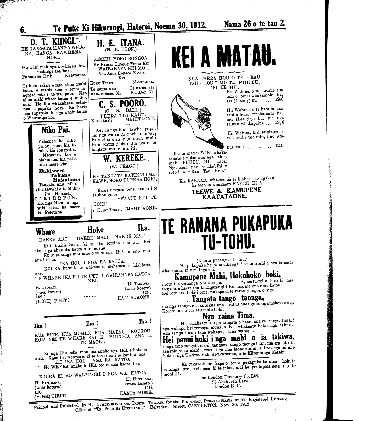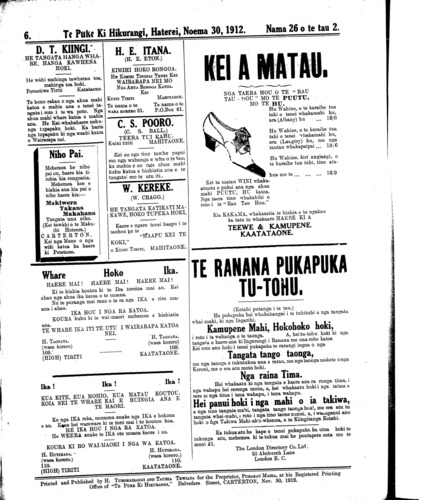 Te Puke Ki Hikurangi, Haterei, Noema 30,1912. Nama 26 o te tau 2. TE RANANA PUKAPUKA TU-TOHU, (Kotahi putanga i te tau.) He pukapuka hei whakahangai i te tuhituhi a nga tangata whai-mahi, ki nga Ingarihi. Kamupene Mahi, Hokohoko hoki, i roto i ia wahanga o te taonga.A, hei tu-tohu hoki ki nga tangata e haere ana ki Ingarangi i Ranana me ona rohe katoa Kei roto ano hoki-i tenei pukapuka te rarangi ingoa o nga Tangata tango taonga, me nga taonga e tukutukua ana e ratau, me nga taonga makete onga Koroni, me o era atu motu hoki. Nga raina Tima. Hei whakaatu ki nga tangata e haere ana ra runga tima, i nga wahapu hei rerenga mona, a, hei whakaatu hoki i nga taima e rere ai nga tima i tena wahapu, i tena wahapu. Hei panui hoki i nga mahi o ia takiwa, a nga tino tangata mahi, tangata tango taonga hoki, me era atu tu tangata whai-mahi, i roto i nga tino taone nunui, a, i waenganui ano hoki o nga Takiwa Mahi-ahu-whenua, o te Kingitanga Kotahi. Ka tukua atu he kape o tenei pukapuka ka utua hoki te tukunga atu, mehemea ki te tukua mai he poutapeta oota mo te moni £1. The London Directory Co.Ltd, 25 Abchurch Lane London E. C.