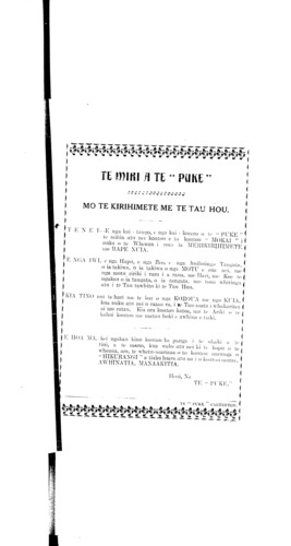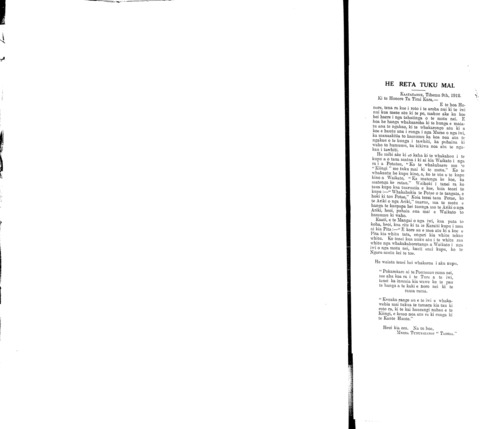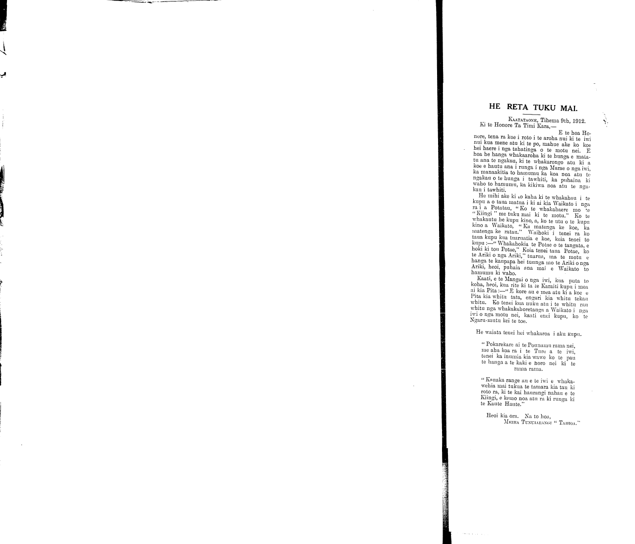 HE RETA TUKU MAI. KAATATAONE, Tihema 9th, 1912. Ki te Honore Ta Timi Kara,— E te hoa Ho- nore, tena ra koe i roto i te aroha nui ki te iwi nui kua mene atu ki te po, mahue ake ko koe hei haere i nga tahatinga o te motu nei. E hoa he hanga whakaaroha ki te hunga e mata- tu ana te ngakau, ki te whakarongo atu ki a koe e hautu ana i runga i nga Marae o nga iwi, ka manaakitia to hamumu ka koa noa atu to ngakau o te hunga i tawhiti, ka puhaina ki waho to hamumu, ka kikiwa noa atu te nga- kau i tawhiti. Ho mihi ake ki to kaha ki te whakahou i te kupu a o taua matua i ki ai kia Waikato i nga ra i a Potatau, " Ko te whakahaere mo te " Kiingi " me tuku mai ki te motu." Ko te whakautu he kupu kino, a, ko te utu o te kupu kino a Waikato, " Ka matenga ke koe, ka matenga ke ratau." Waihoki i tenei ra ko taua kupu kua tuaruatia e koe, koia tenei to kupu :—" Whakahokia te Potae o te tangata, e hoki ki ton Potae," Koia tenei taua Potae, ko te Ariki o nga Ariki," tuarua, ma te motu e hanga te kaupapa hei tuunga mo te Ariki o nga Ariki, heoi, puhaia ana mai e Waikato to hamumu ki waho. Kaati, e te Mangai o nga iwi, kua puta to koha, heoi, kua rite ki ta te Karaiti kupu i mea ai kia Pita:—" E kore au e mea atu ki a koe e Pita kia whitu tata, engari kia whitu tekau whitu. Ko tenei kua nuku atu i te whitu rau whitu nga whakakahoretanga a Waikato i nga iwi o nga motu nei, kaati enei kupu, ko te Ngaru-mutu kei te toe. He waiata tenei hei whakaroa i aku Kupu. " Pokarekare ai te Pounamu rama nei, me aba koa ra i te Ture a te iwi, tenei ka inumia kia wawe ko te pau te hanga a te kaki e horo nei ki te rama rama. " Kauaka range au e te iwi e whaka- wehia mai tukua te tamara kia tau ki roto ra, ki te kai haurangi nahau e te Kiingi, e kemo noa atu ra ki runga ki te Kaute Haute." Heoi kia ora. Na to hoa, MEIHA TUNUIARANGI " TAIHOA."