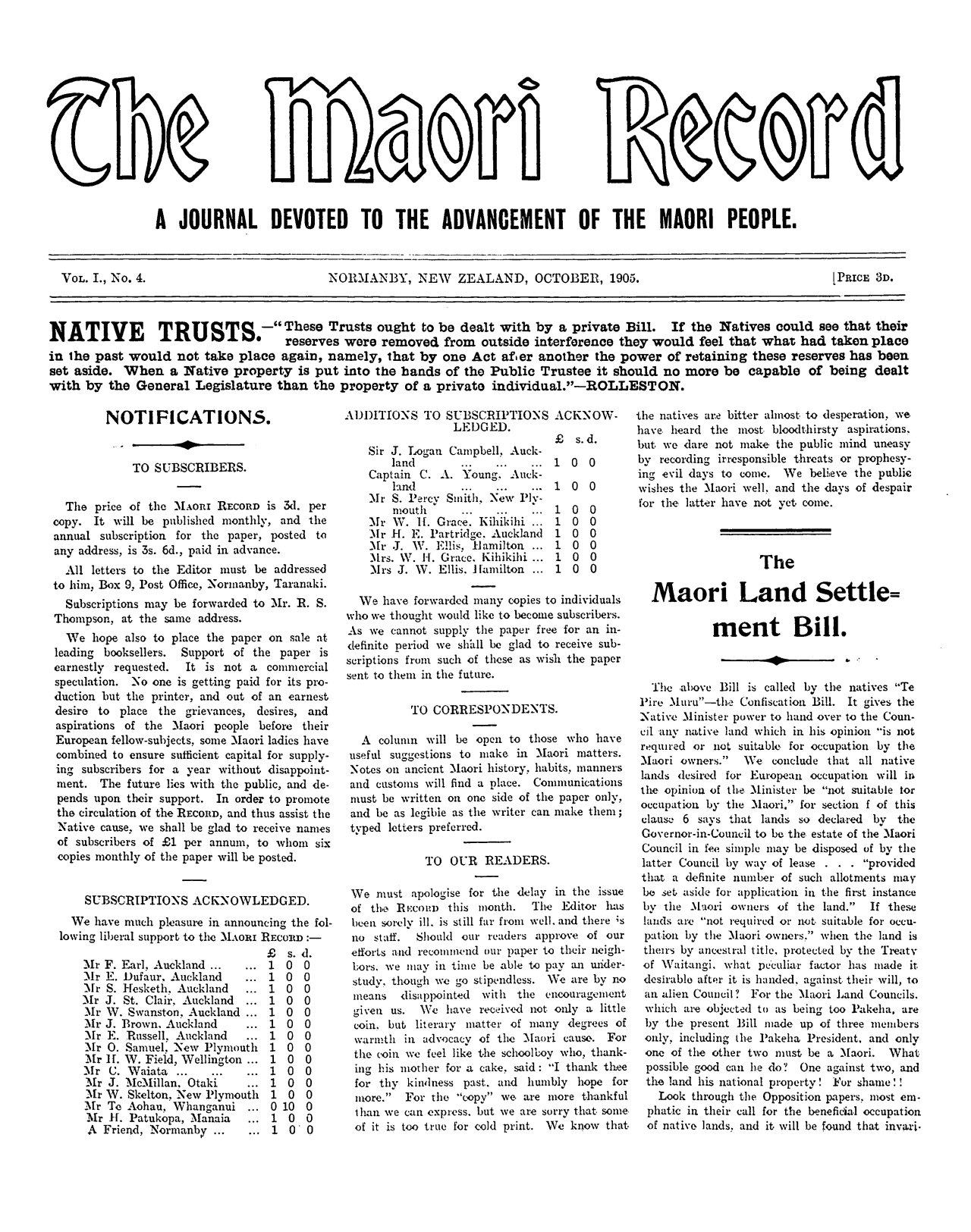 The Maori Record 1905-1907: Volume 1, Number 4. 01 October 1905 |
