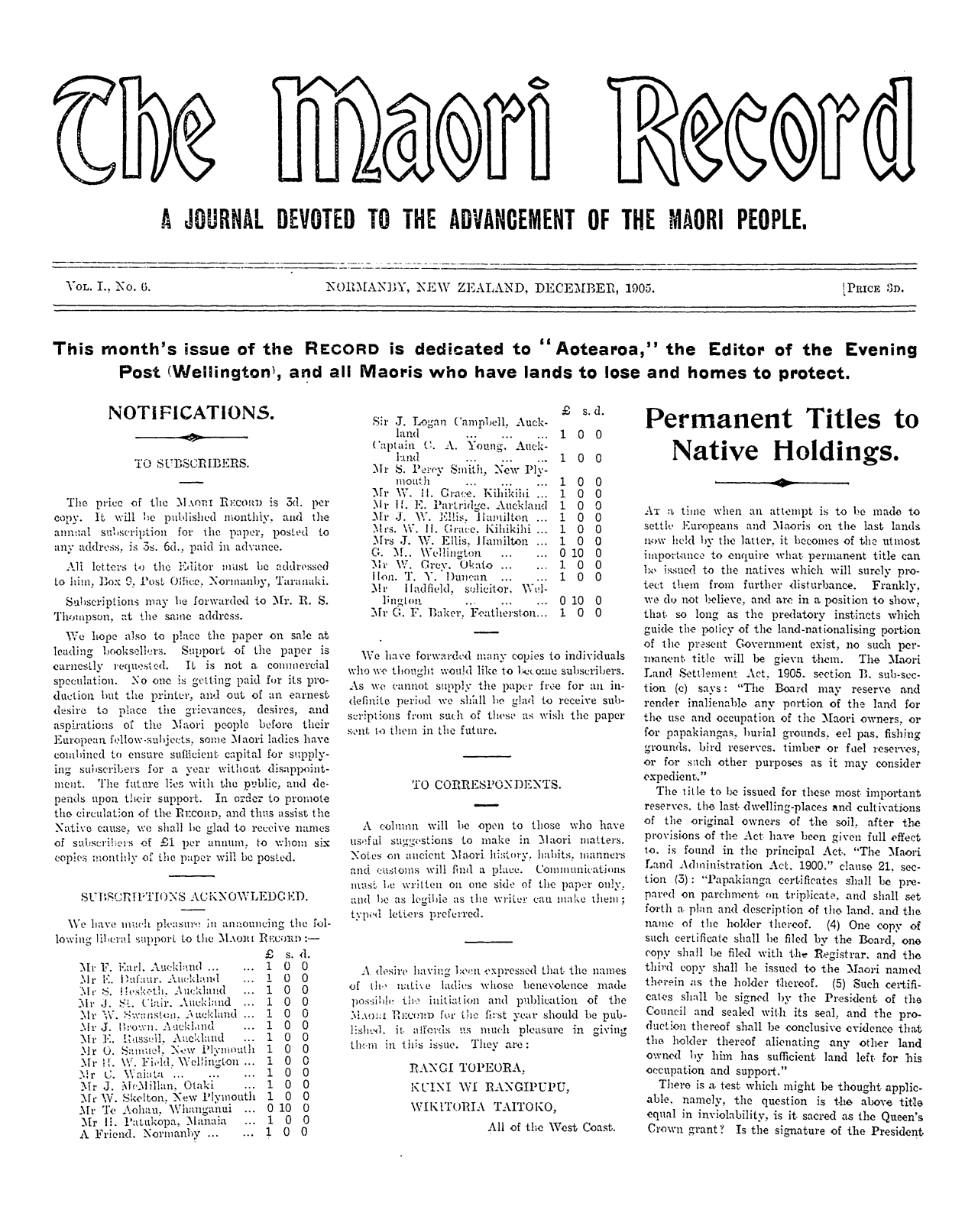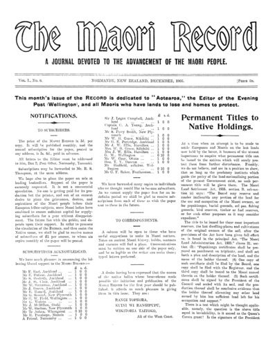 The Maori Record 1905-1907: Volume 1, Number 6. 01 December 1905 |