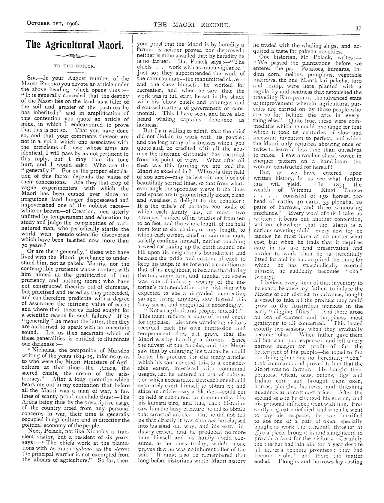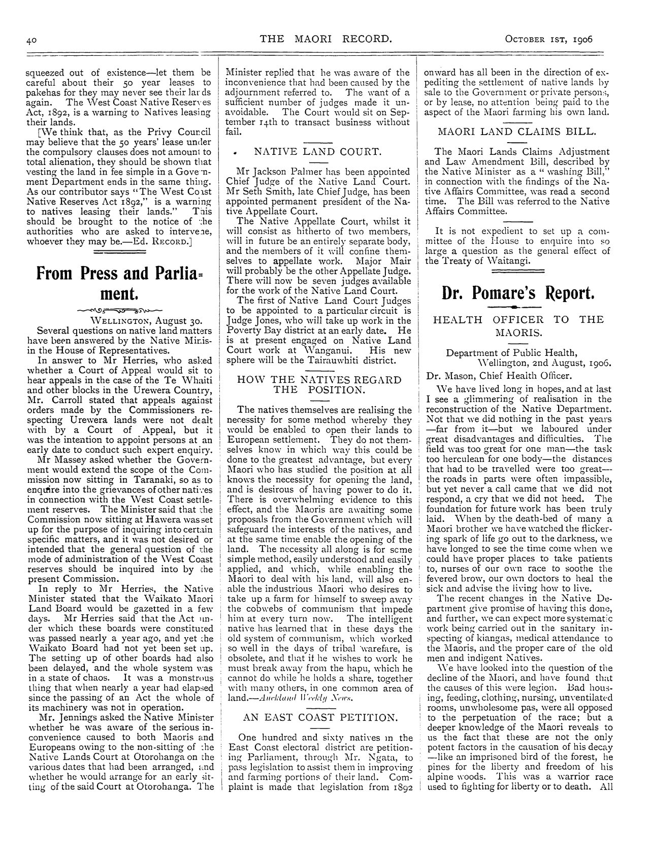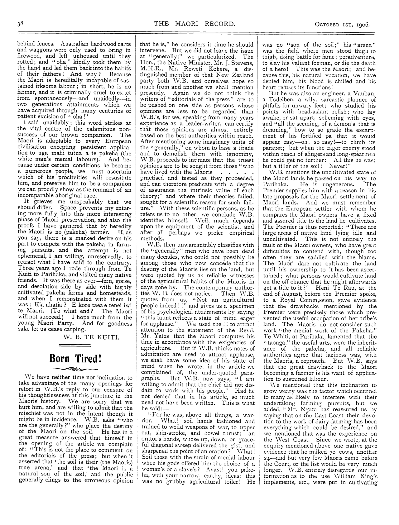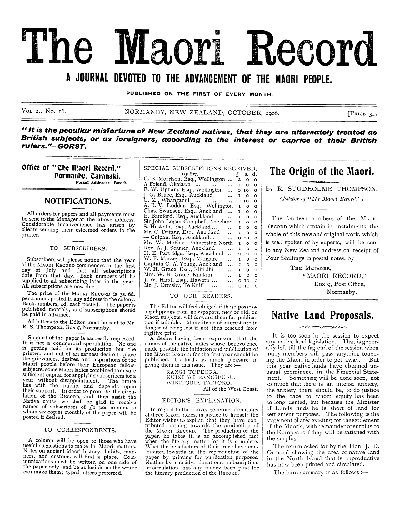 The Maori Record 1905-1907: Volume 2, Number 16. 01 October 1906 |